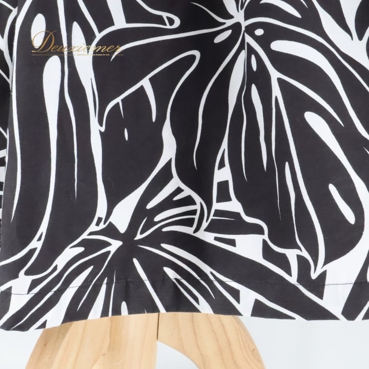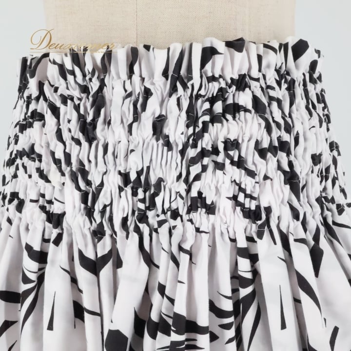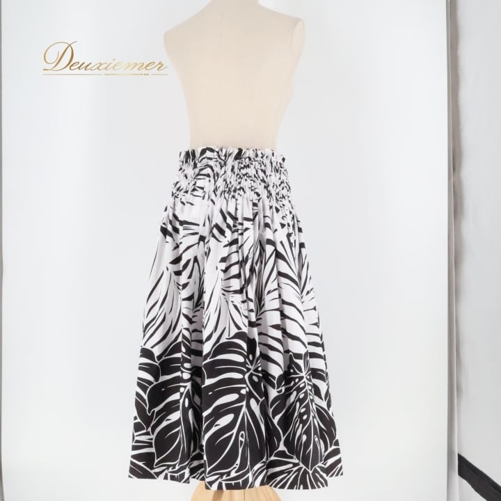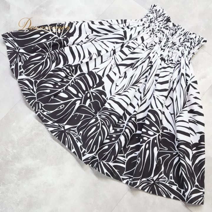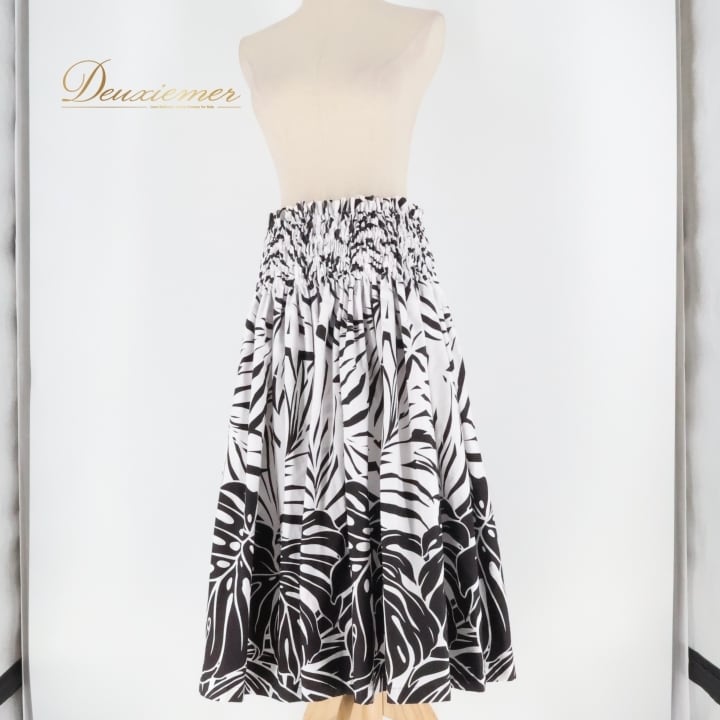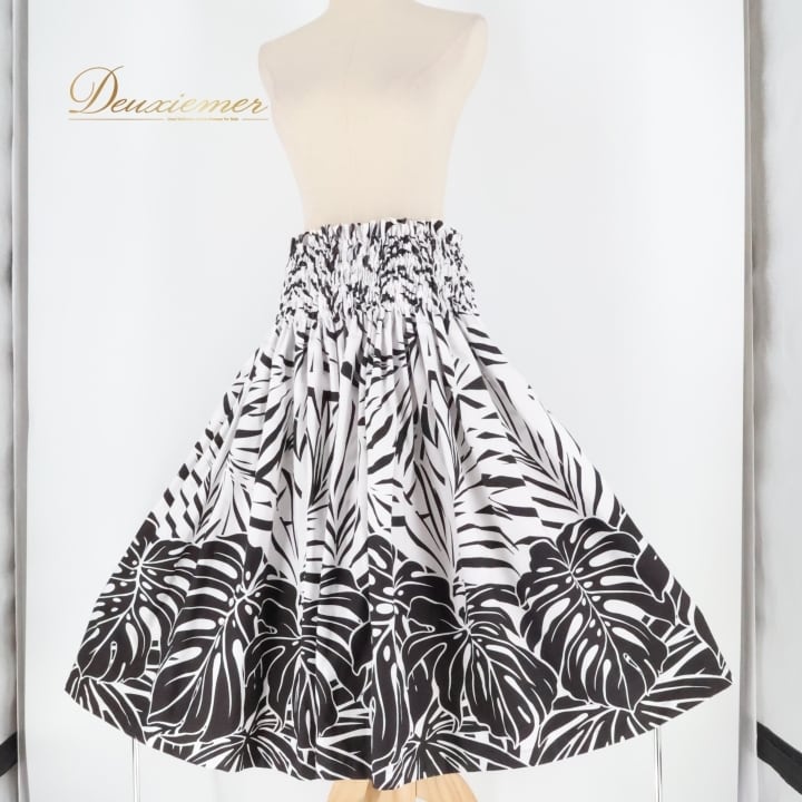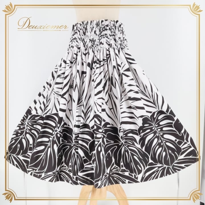 フラダンス 衣装 パウスカート ハレハワイイ ブラック系 ホワイト系 日本製 モノトーン モンステラ柄 シンプル シングル きれい 大人っぽい 上品 かわいい 華やか 鮮やか 黒 白 ハワイアン アロハ ハワイアンプリント フラ ダンス レッスン 練習