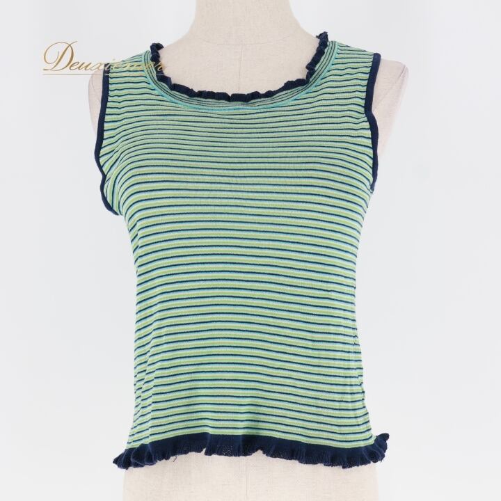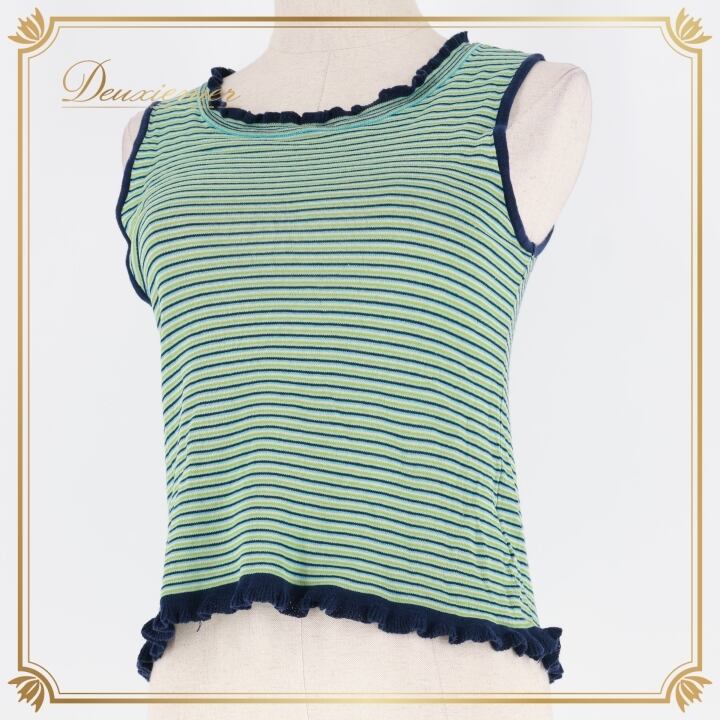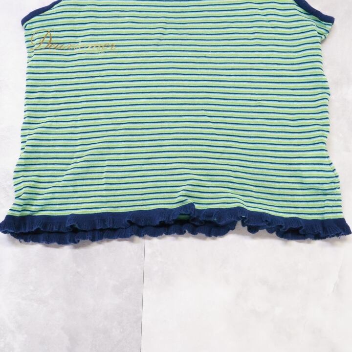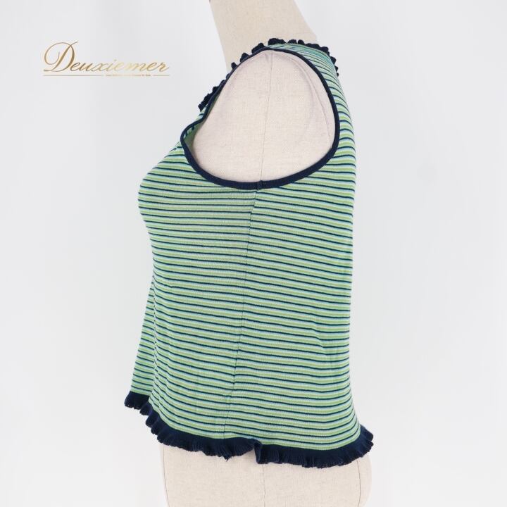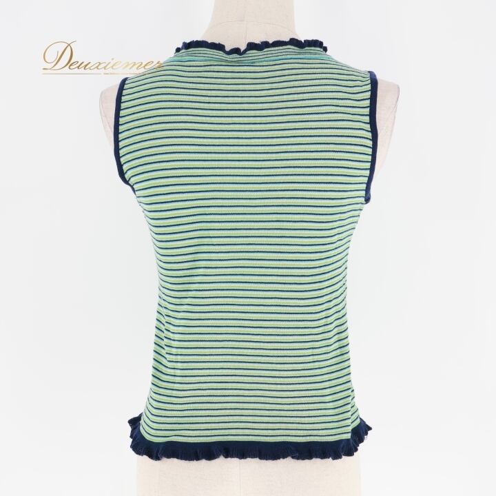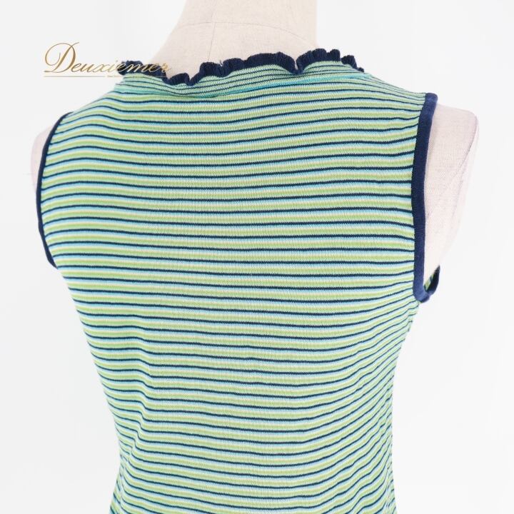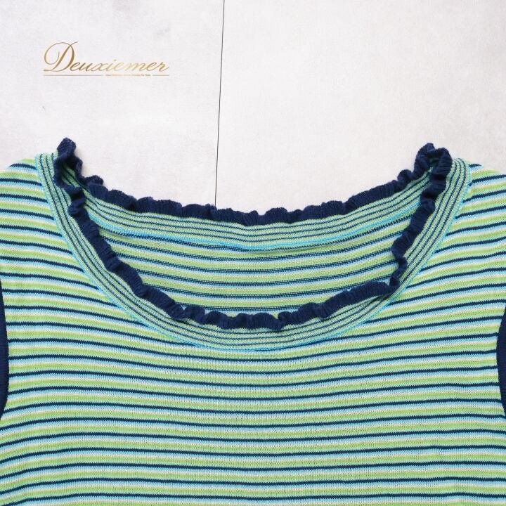 レディース トクコプルミエヴォル TOKUKO 1er VOL トップス ブラウス グリーン系 ノースリーブ 袖なし ボーダー フリル 緑 青 紺 伸縮 ストレッチ カジュアル かわいい 爽やか 日本製 レディースファッション ネイビー系 ブルー系