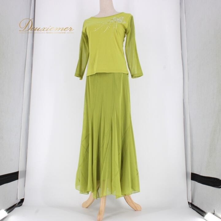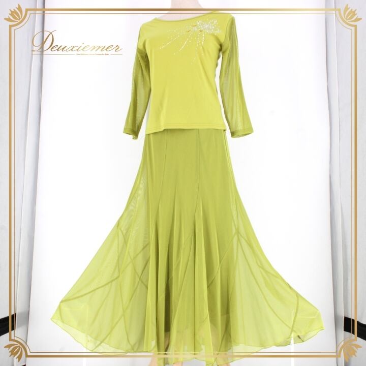 社交ダンス 衣装 スタンダード 上下セット ツーピース レッスンウェア パーティ衣装 黄緑 ICHIOKU イチオク グリーン系 ラインストーン スカート トップス フレア デザイン 伸縮性 ウエストゴム 洗練 ショート丈 大人用 イベント用 ドレス おしゃれ コスチューム 美しい おすすめ 体型カバー 舞台衣装 競技用