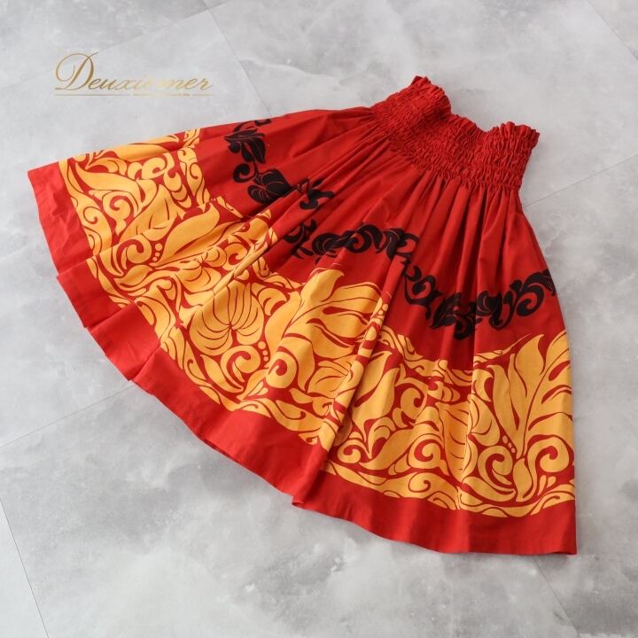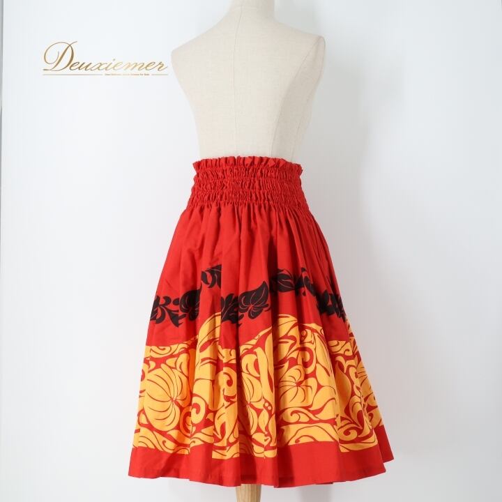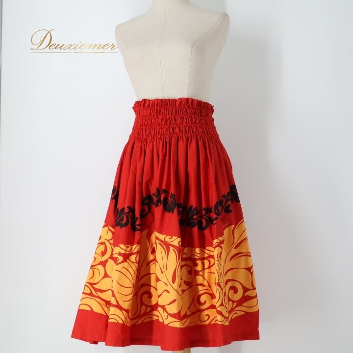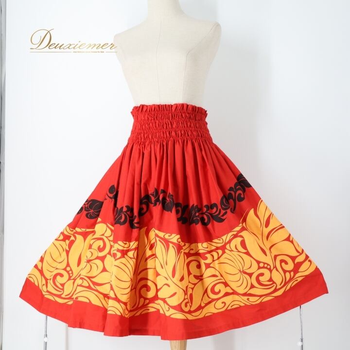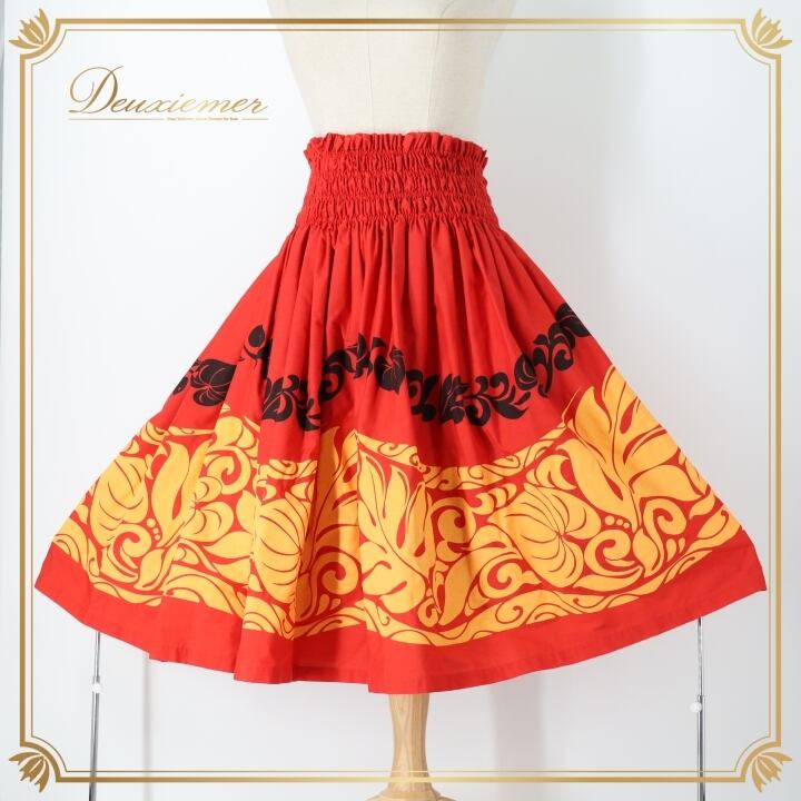 #フラダンス #パウスカート #ハワイアンファッション #ダンス衣装 #レッド #オレンジ #ブラック #ウエストゴム #華やか #春夏ファッション #トルソー #女性用 #ポリエステル #綿 #ハワイ #フラ #フラダンス衣装 #衣装 #カラフル #ENUTSU
