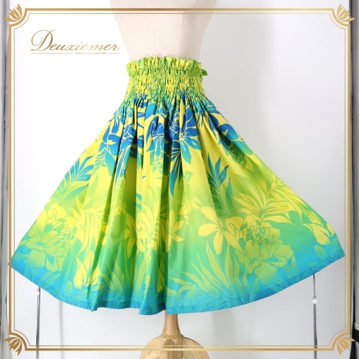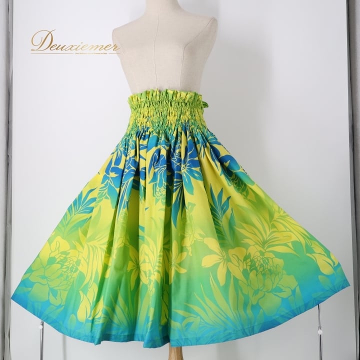 フラダンス 衣装 パウスカート イエロー系 ハレハワイイ 日本製 ハワイアンプリント アロハ フラ ダンス レッスン 練習 花柄 華やか 鮮やか さわやか 上品 大人っぽい シングル スカート フレア ブルー系 グリーン系 黄 青 緑 黄緑 フラ ダンス衣装 大人用 ハワイ アロハファッション 軽やか