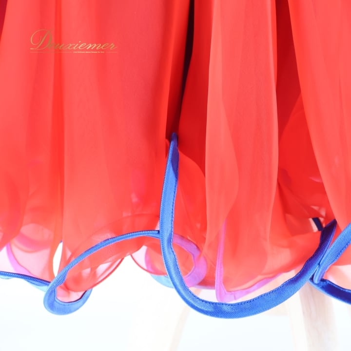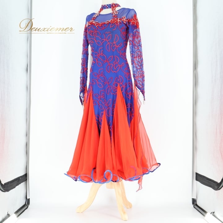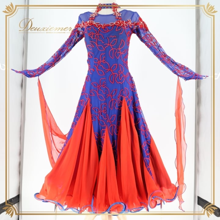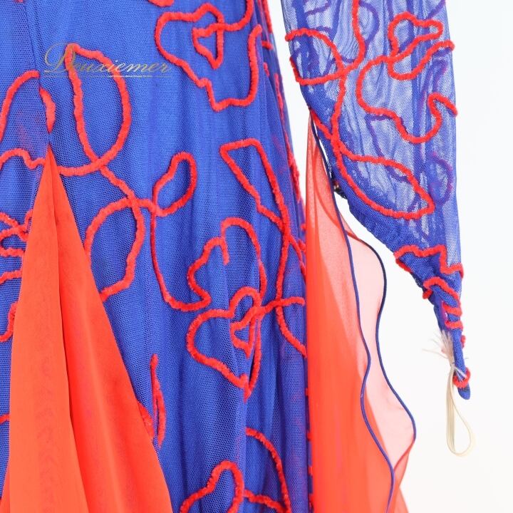 社交ダンス 衣装 スタンダードドレス ワンピース ドレス レッド系 ブルー系 赤 青 フロート レース デモ 競技 ダンス パーティ 発表会 鮮やか フリル フォーマル発表会 イベント用