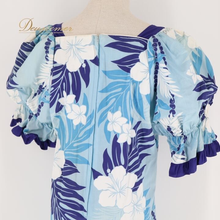 フラダンス 衣装 ワンピース ドレス ブルー系 RoyalCreations ハワイ製 ハイビスカス柄 モンステラ柄 ハワイアンプリント アロハ フラ ダンス レッスン 練習 フリル 半袖 パウスリーブ 華やか 鮮やか かわいい おしゃれ 上品 大人っぽい ホワイト系 花柄 エレガント リゾート お洒落 スタイリッシュ 軽やか レディース