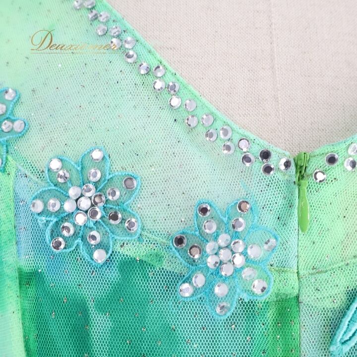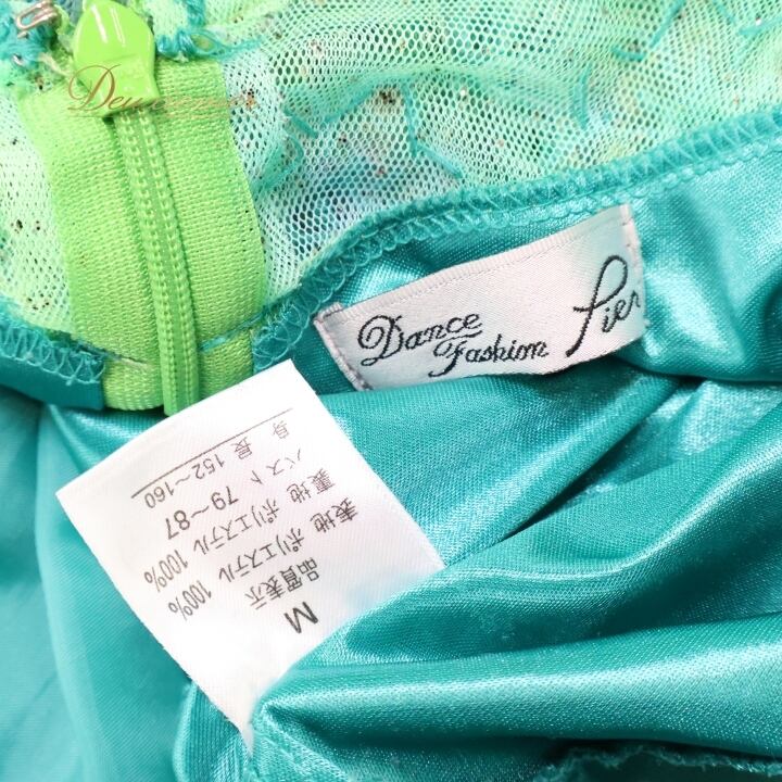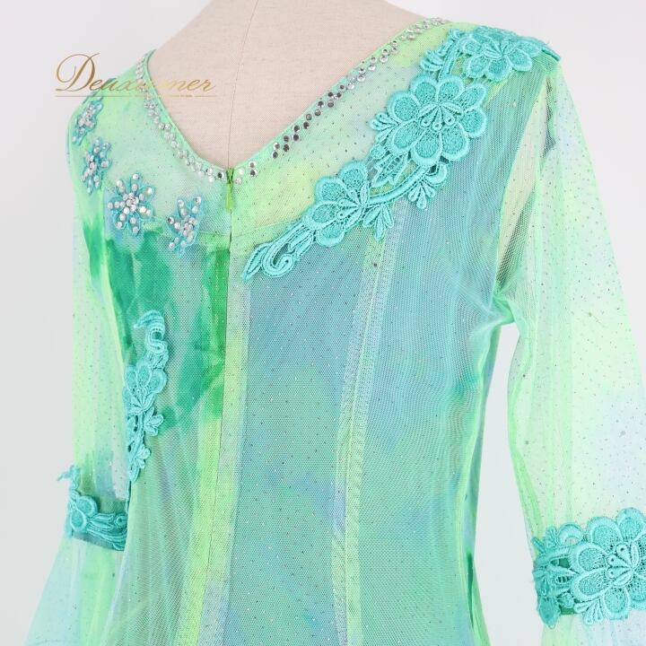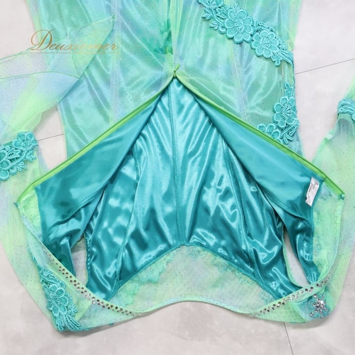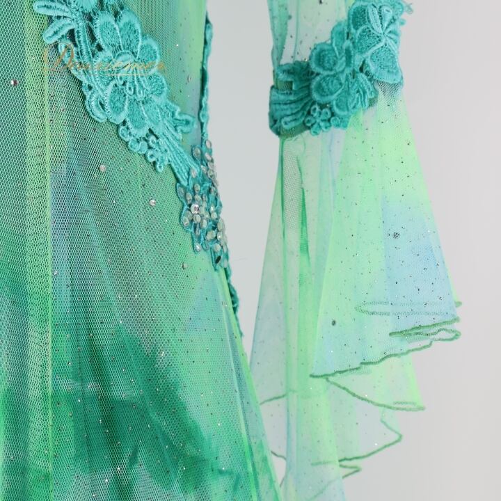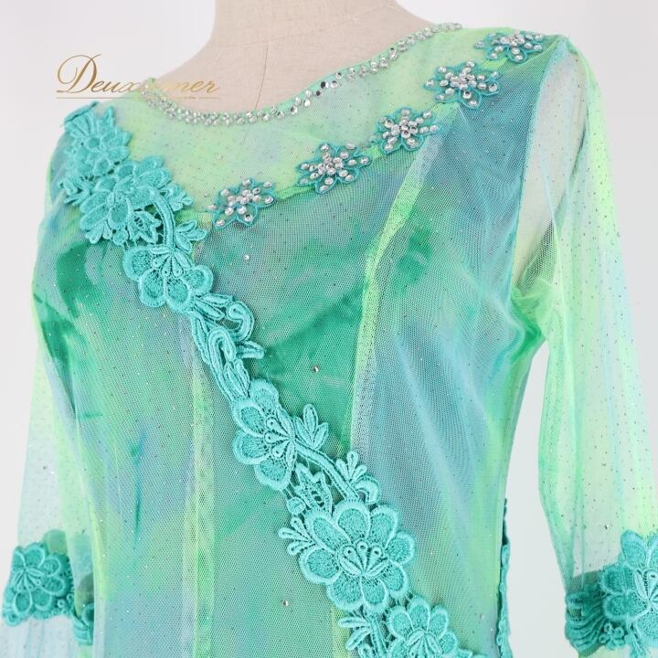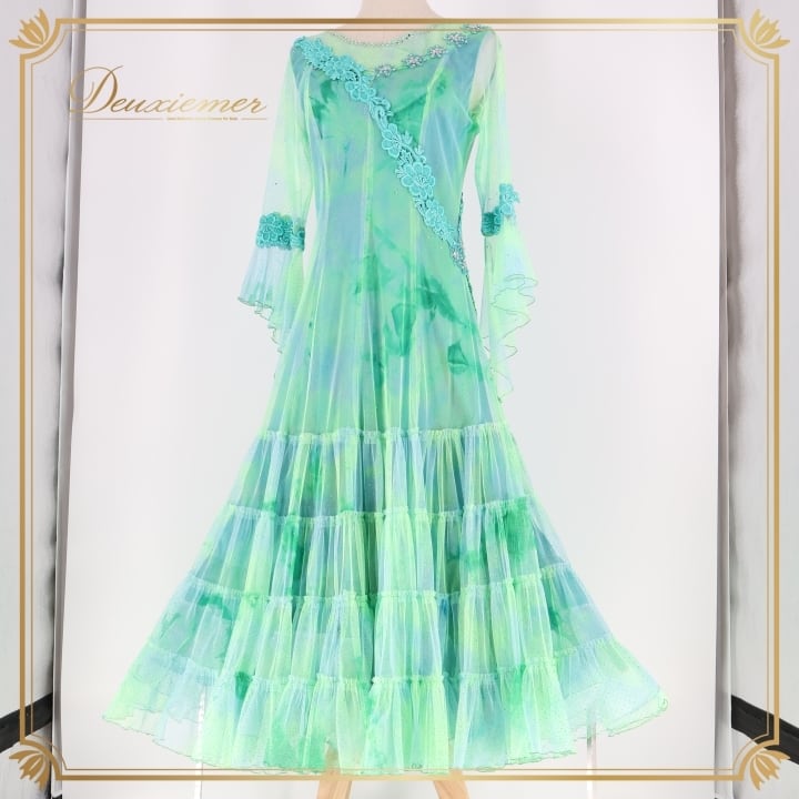 社交ダンス 衣装 ワンピース ドレス グリーン系 ブルー系 ダンスファッションピア dance fashion pier 黄緑 エメラルドグリーン 水色 青 レース グラデーション パーティ 発表会 ダンス フェミニン パフォーマンス 大人 女性用 きれい