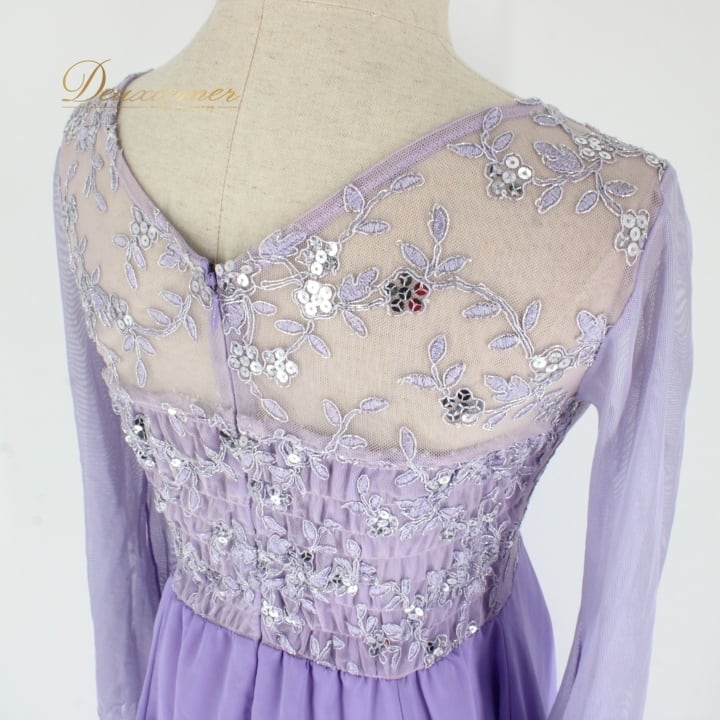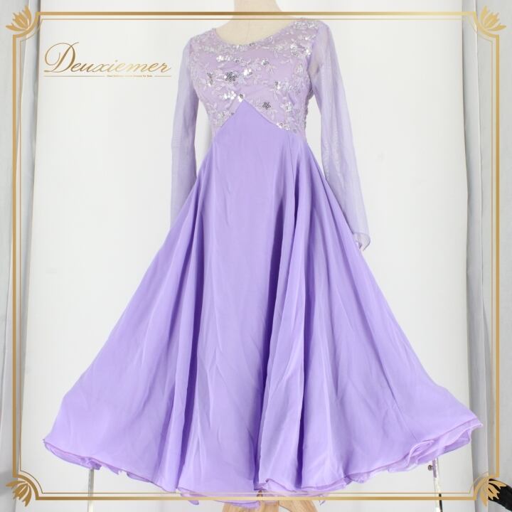 社交ダンス 衣装 スタンダード ドレス ワンピース パーティドレス パープル系 紫 prima boutique プリマブティック レース 長袖 ライラックパープル スパンコール 花模様 二重スカート ふんわり フェミニン おしゃれ 派手目 可愛い 結婚式 イベント パーティー 着心地良い ドレッシー 卓越した シルエット レディース Mサイズ