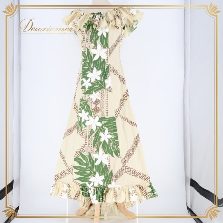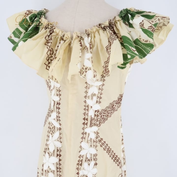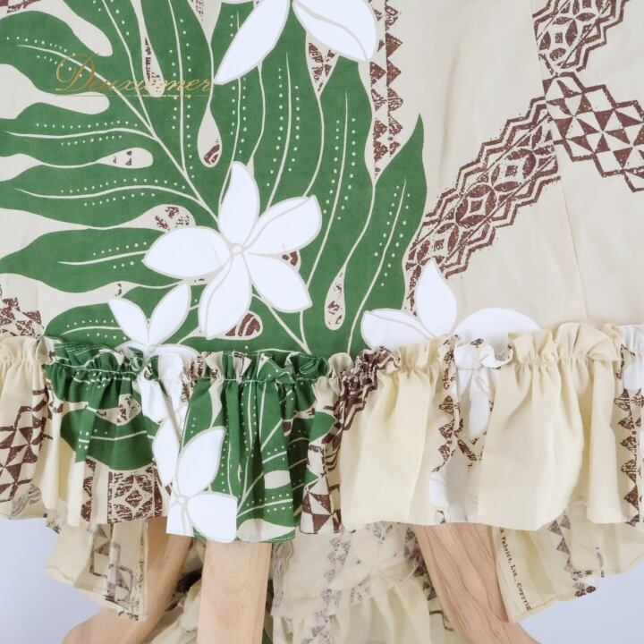フラダンス 衣装 ワンピース ドレス ベージュ系 アシンメトリー フリル プルメリア柄 ラウアエ柄 ナチュラル かわいい 華やか 鮮やか 明るい 茶 白 緑 ハワイアン アロハ ハワイアンプリント フラ ダンス レッスン 練習 カジュアル おしゃれ 軽やか