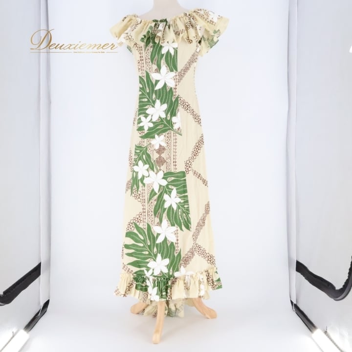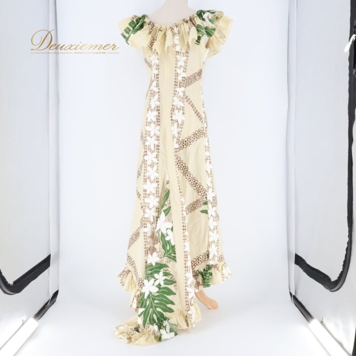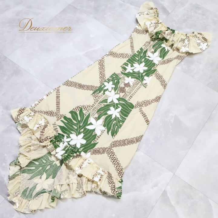 #フラダンス #フラダンス衣装 #ワンピース #ドレス #ナチュラルカラー #アシンメトリースカート #フリル #ビーチファッション #カジュアルドレス #パーティードレス #華やか #女性ファッション #トルソー #ダンス衣装 #エレガント #夏ファッション #かわいい #ハワイアンスタイル #ドレスコード #ENUTSU