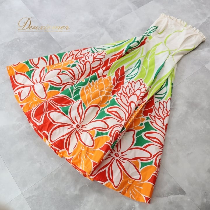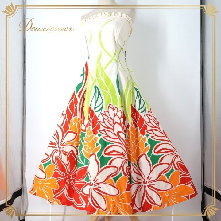 フラダンス 衣装 ワンピース ドレス ホワイト系 アロハスタンダード ティアレ柄 ALOHA STANDARDS ハワイアンプリント アロハ フラ ダンス レッスン 練習 ベアワンピース カラフル 華やか 鮮やか かわいい おしゃれ 上品 大人っぽい オレンジ系 レッド系 グリーン系 アロハドレス フラワープリント トロピカルスタイル カジュアル ワンピースリゾート