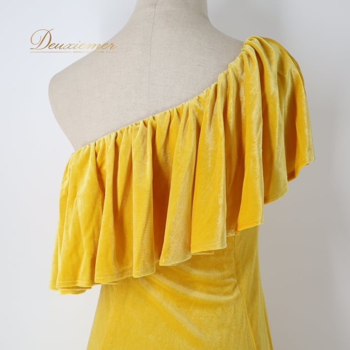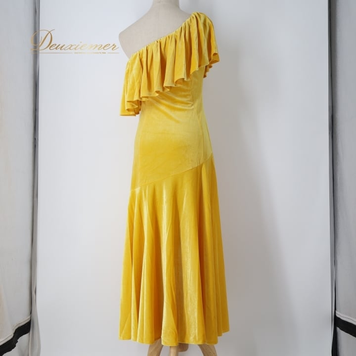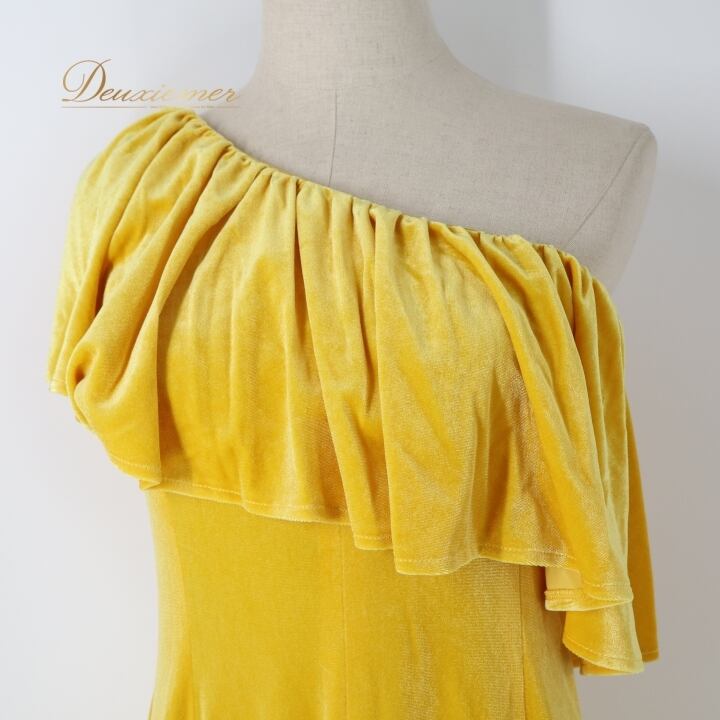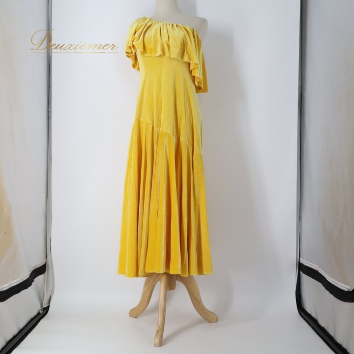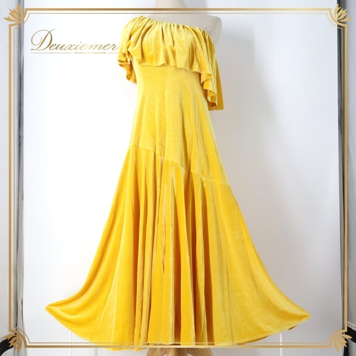 フラダンス 衣装 ワンピース ドレス イエロー系 ブルーヘブンカンパニー ベロア 無地 黄 BLUE HEAVEN COMPANY ワンショルダー 光沢感 高級感 ハワイアン アロハ フラ ダンス レッスン 練習 華やか 鮮やか かわいい おしゃれ 上品 大人っぽい フラダンス衣装 高級 フラドレス カラフル衣装 イエロー ワンピースドレス ステージ衣装 パーティー衣装 上品さのあるデザイン 舞台用衣装 輝く光沢 華やかなスタイル おしゃれなデザイン フェスティバル用衣装
