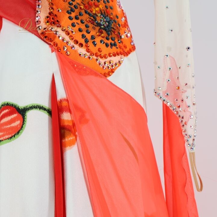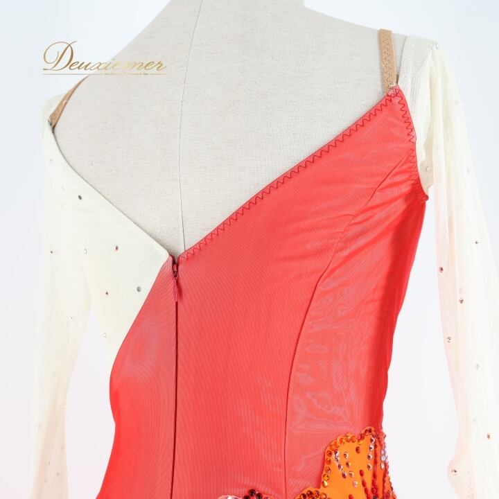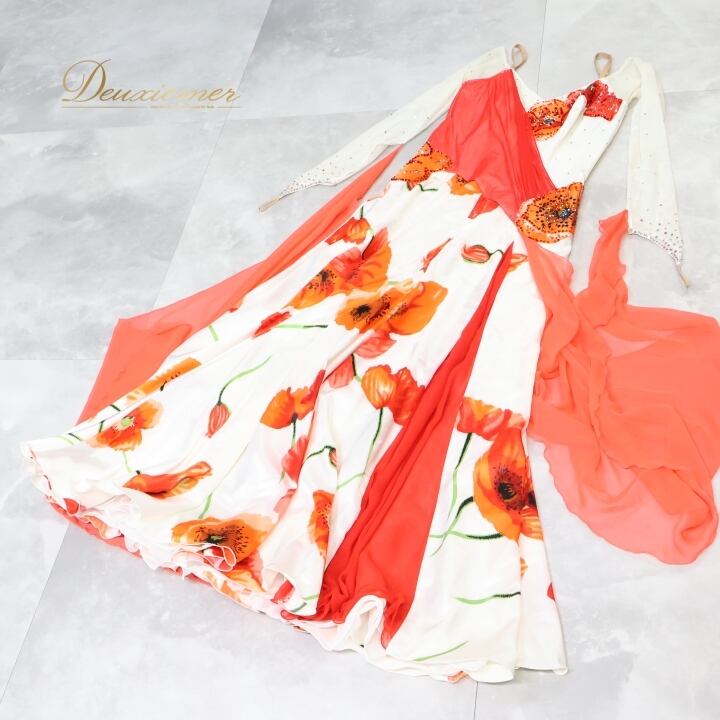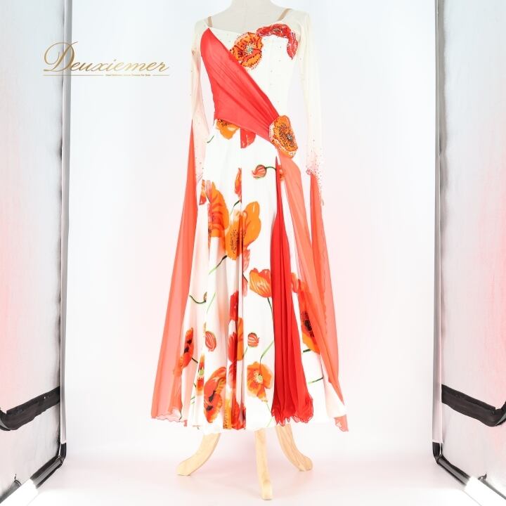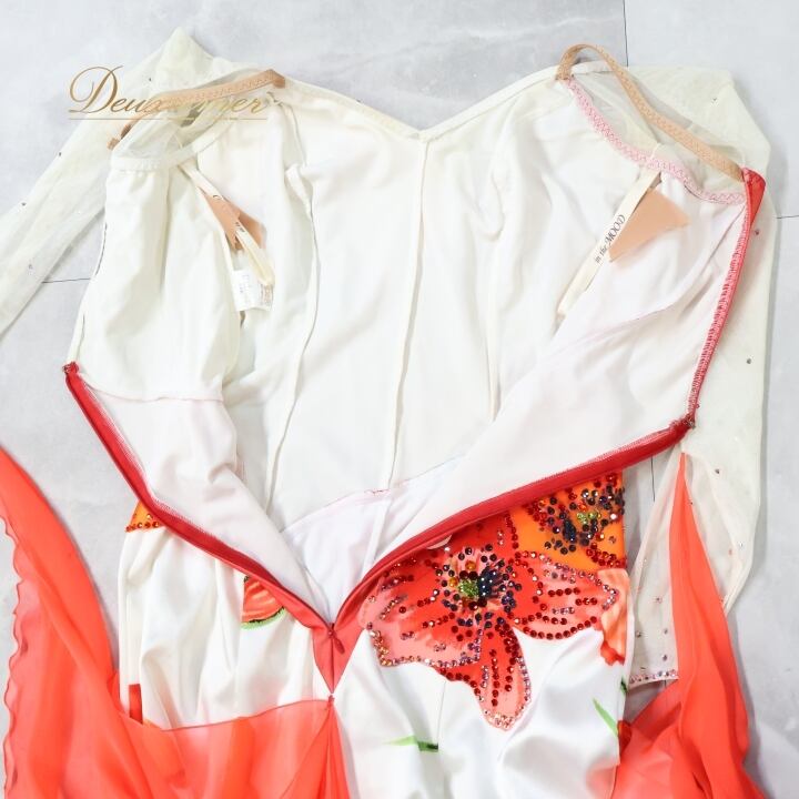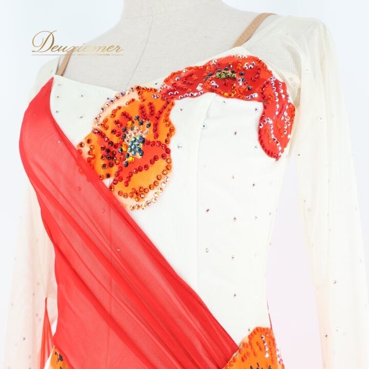 社交ダンス 衣装 スタンダードドレス ワンピース ドレス ホワイト系 オレンジ系 レッド系 ピンク系 インザムード in the MOOD 日本製 白 赤 オレンジ ピンク フロート レース 花 パーティ 発表会 華やか おしゃれ 女性用 ダンス衣装 エレガント