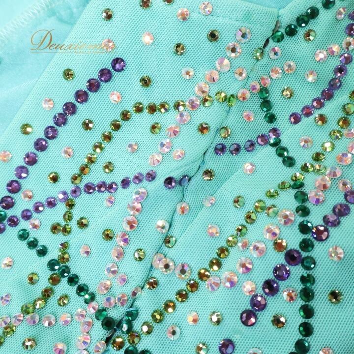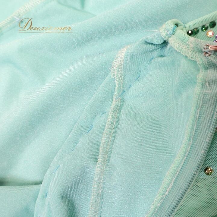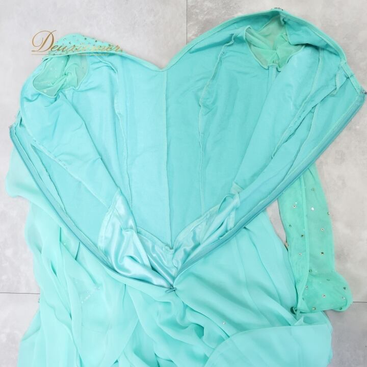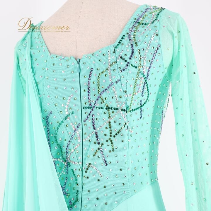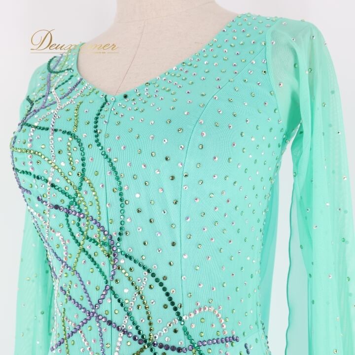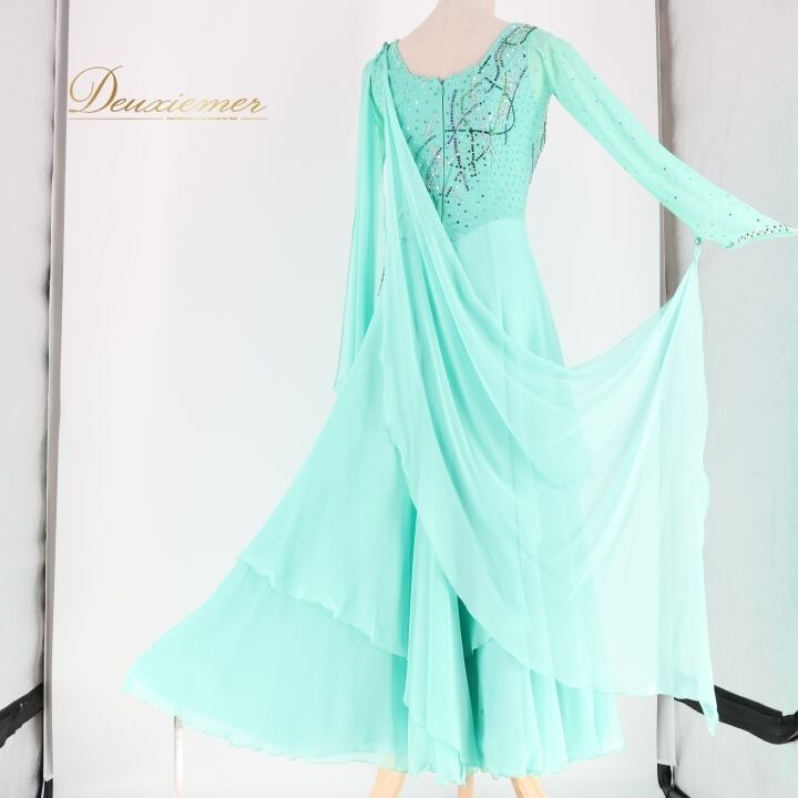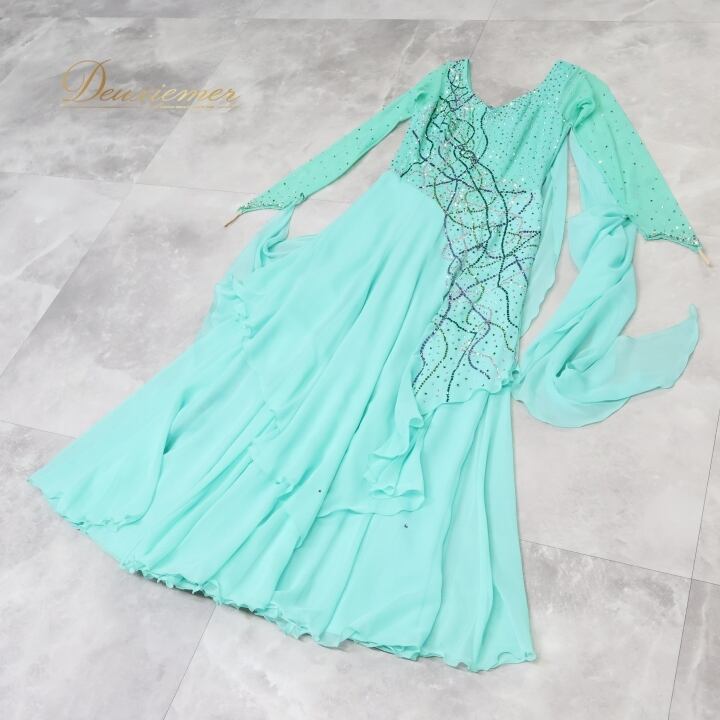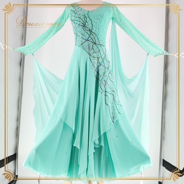 社交ダンス 衣装 スタンダードドレス ワンピース ドレス グリーン系 ブルー系 緑 エメラルドグリーン デモ 競技 ダンス パーティ 発表会 レース フロート エレガント フェミニン ダンス発表会 パフォーマンス用 おしゃれ 上品 コスチューム レディース