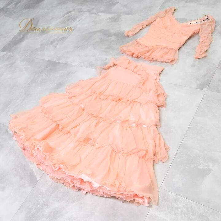 社交ダンス 衣装 チャコット Chacott 日本製 トップス ブラウス スカート ツーピース セットアップ ピンク系 サーモンピンク 無地 フリル レース 上品 パーティ 発表会パーティー衣装 ダンスウェア フリルスカート セットアップ レディース Mサイズ 明るい 発表会衣装 かわいい