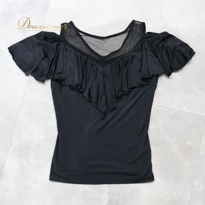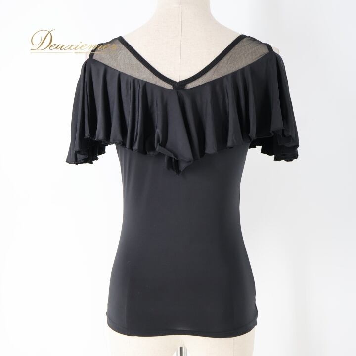 社交ダンス 衣装 トップス ブラウス ブラック系 チャコット Chacott 黒 無地 シンプル 練習 レッスン フリル 伸縮 ストレッチ メッシュ生地 日本製 透け感 上品 ダンス衣装 イベント ステージ かわいい オールブラック