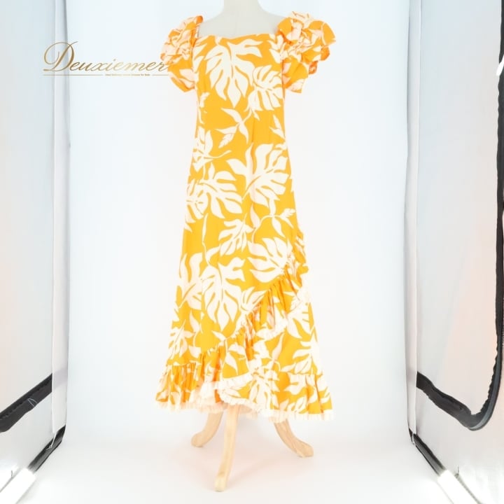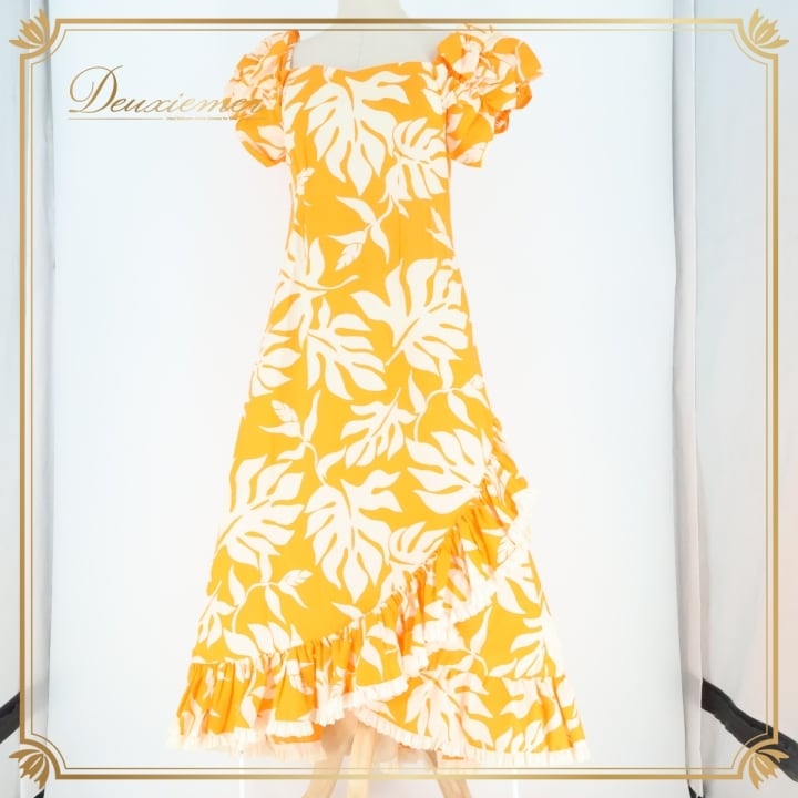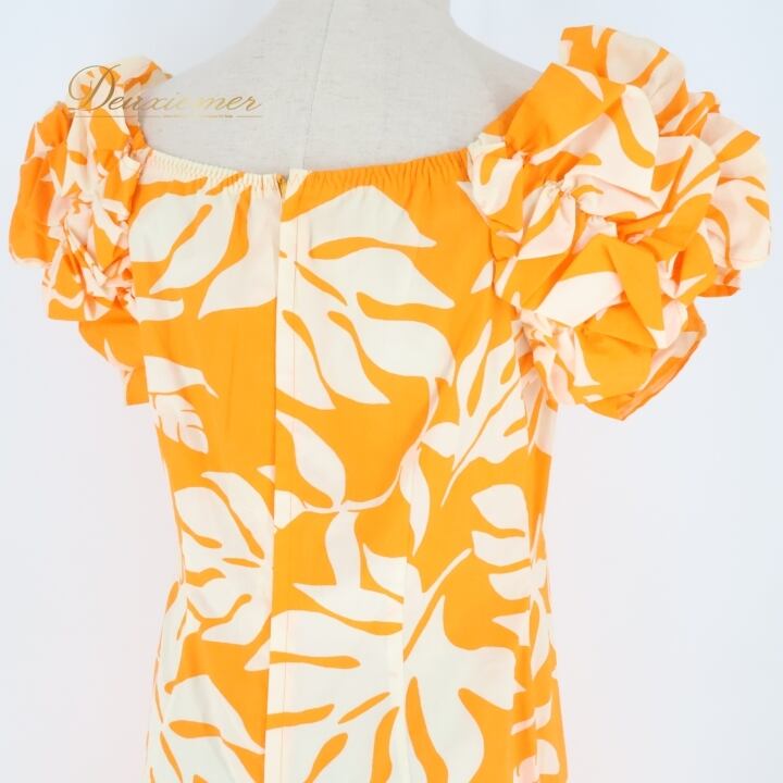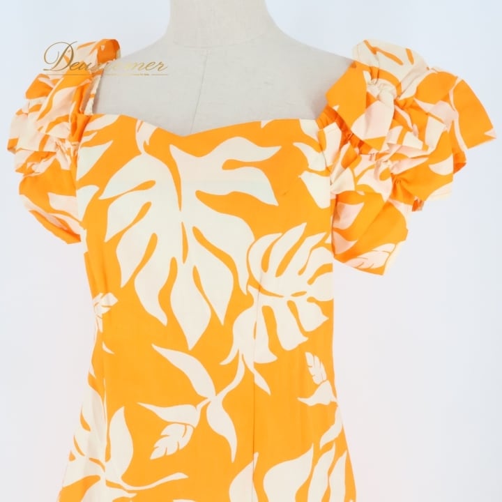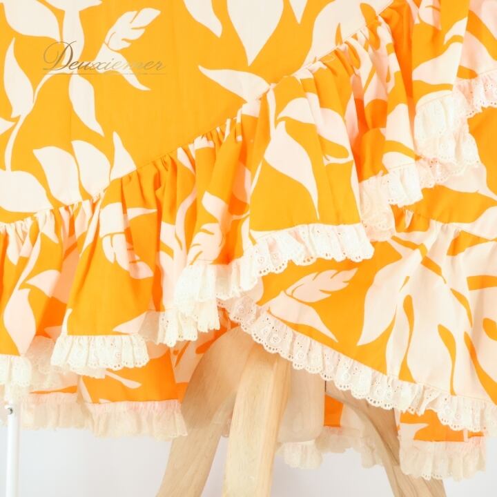 フラダンス 衣装 ワンピース ドレス アロハスタンダード オレンジ系 ALOHA STANDARDS 日本製 フリル アシンメトリー レース かわいい 華やか 鮮やか 明るい 橙 白 ハワイアン アロハ ハワイアンプリント フラ ダンス レッスン 練習