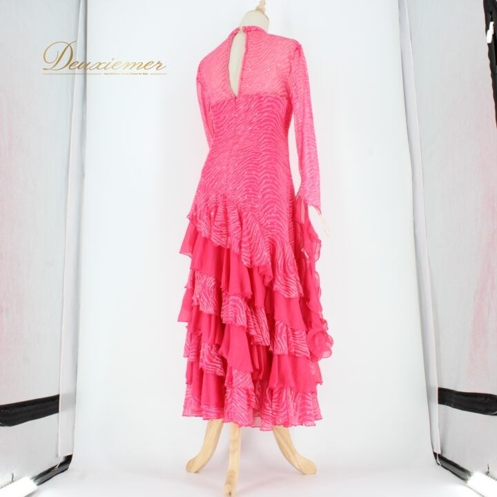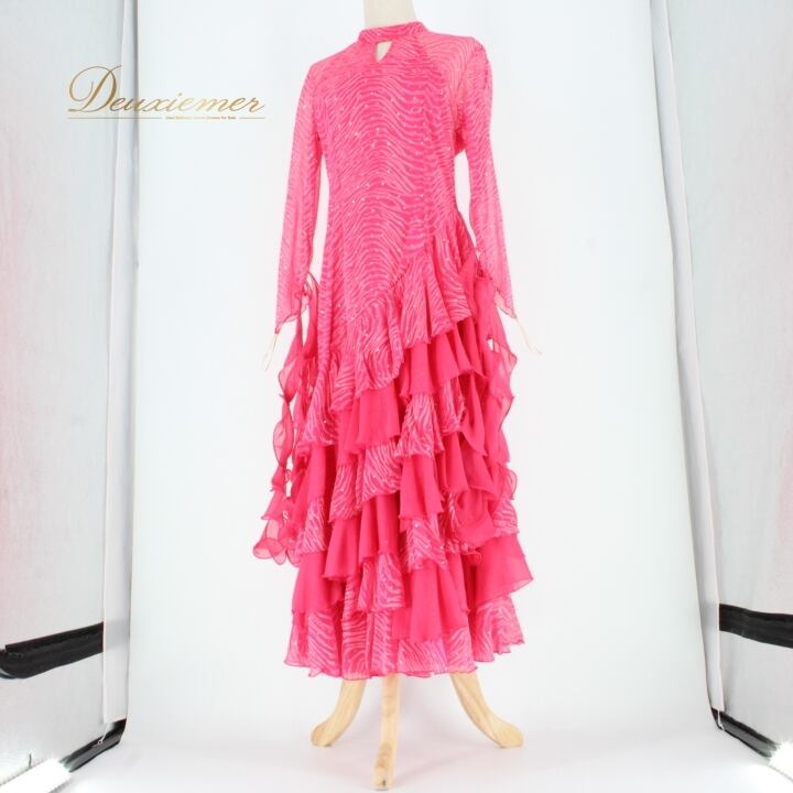 社交ダンス 衣装 スタンダード ドレス ワンピース パーティドレス Leirena レイリーナ ピンク系 フロート キラキラ レース フリル 長袖 ビビッドピンク 軽やか 華やか ステージ衣装 ダンスウェア フラッフィー おしゃれ フェミニン パーティー かわいい ルームウェア 体型カバー 動きやすい 練習用 大人用 楽しめる
