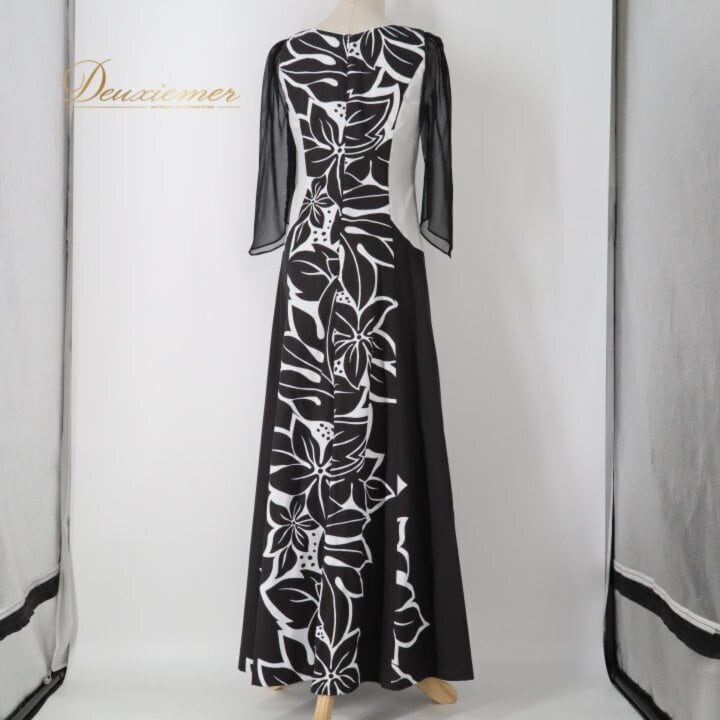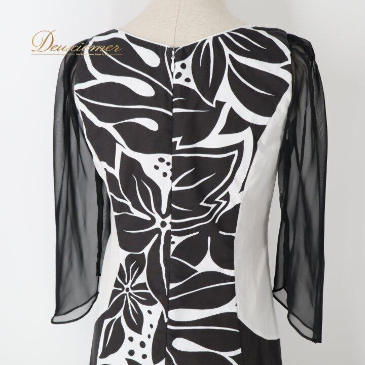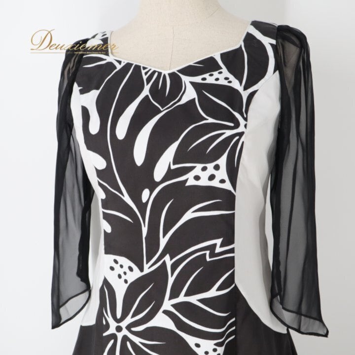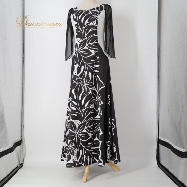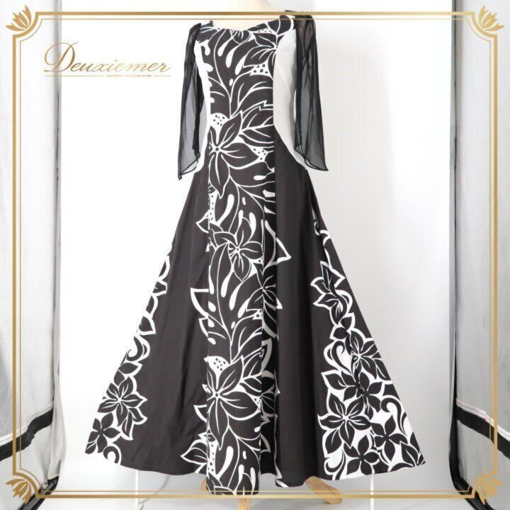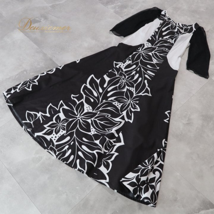 フラダンス 衣装 ワンピース ドレス ブラック系 HulaKu 日本製 プルメリア柄 モンステラ柄 ハワイアンプリント 黒 長袖 チュール 透け感 アロハ フラ ダンス レッスン 練習 おしゃれ 上品 大人っぽい ハワイアンダンス レディース ホワイト系 モノクロ フォーマル お出かけ パーティー カジュアル 体型カバー 大人可愛い スタイリッシュ ボヘミアン リゾートウェア 植物柄 柔らかい着心地 シンプルデザイン エレガント ブラックドレス ブラック系 ホワイト系 チュール袖 透け袖 大人用