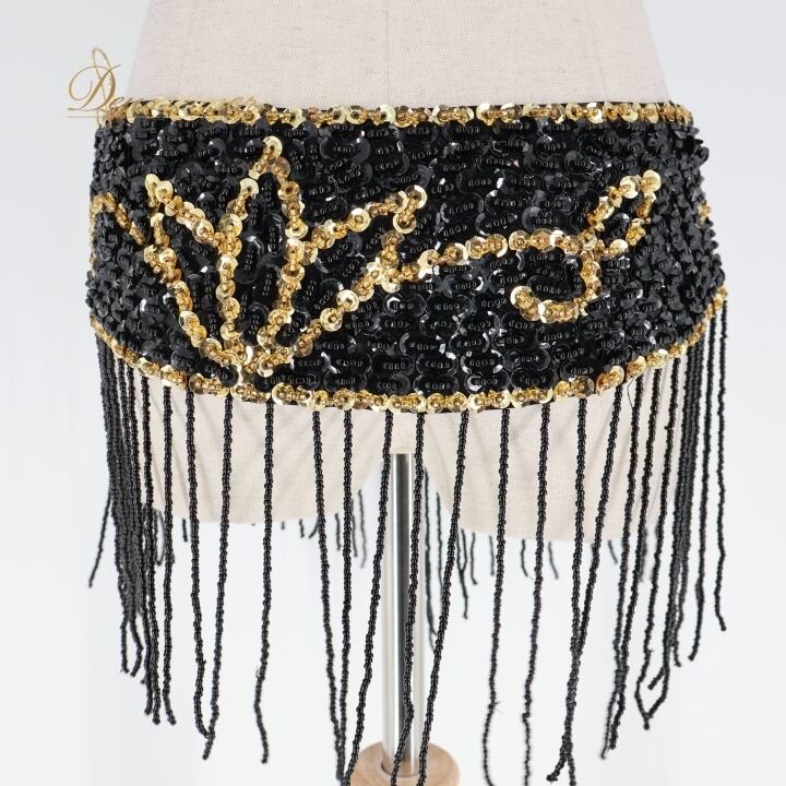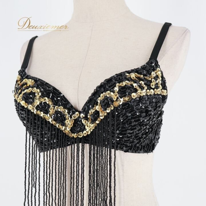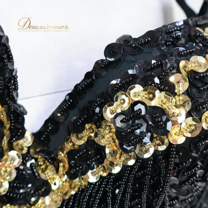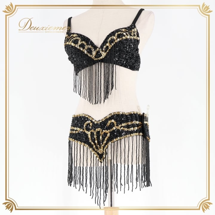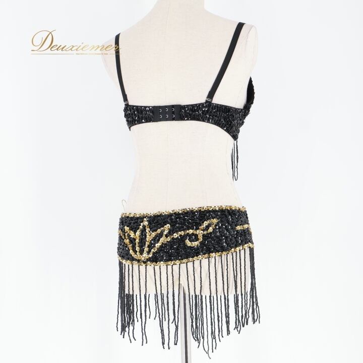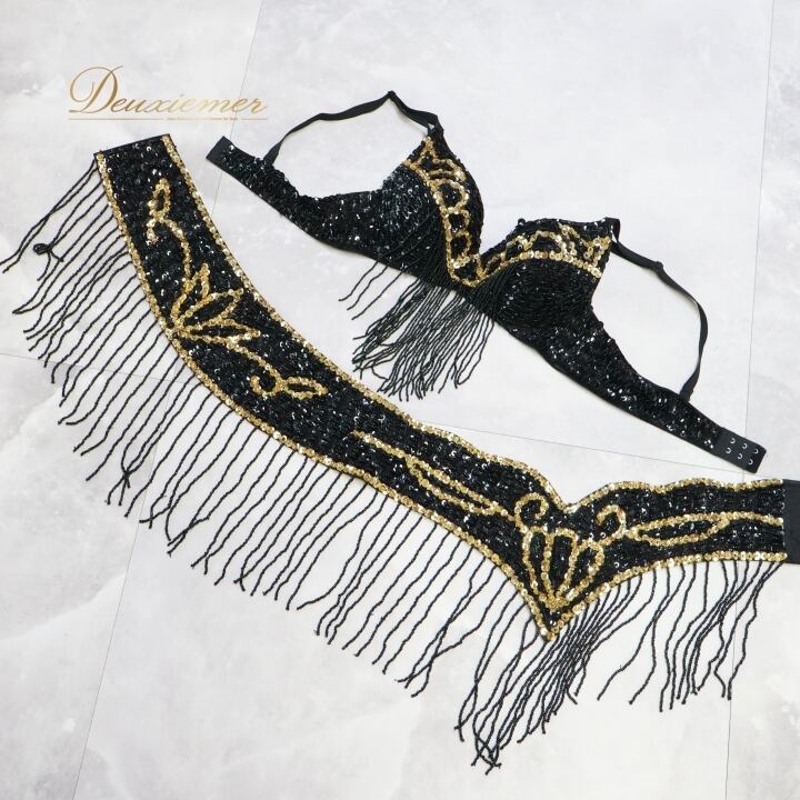 ベリーダンス オリエンタル 衣装 トップス ベルト セット ブラック系 スパンコール ビーズ 黒 金 フリンジ キラキラ 華やか かわいい ダンス衣装 イベント ステージ かっこいい 豪華 装飾 ゴールド系