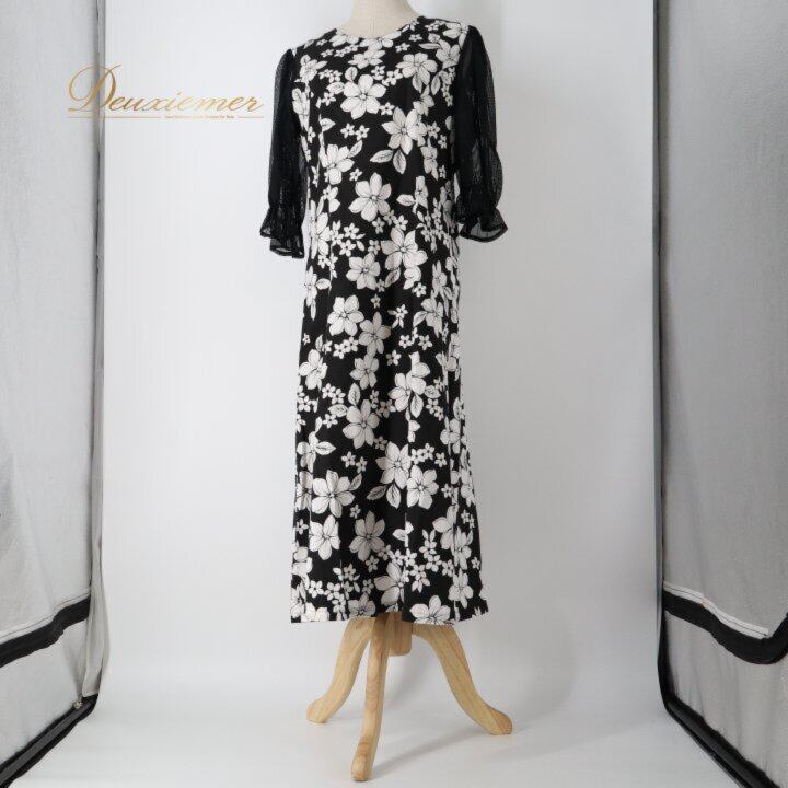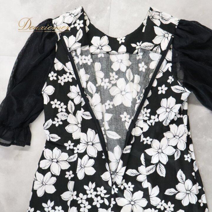 フラダンス 衣装 ワンピース ドレス ブラック系 プルメリア柄7ハワイアンプリント アロハ フラ ダンス レッスン 練習 長袖 チュール袖 黒 白 モノトーン ハワイアンダンス レディース ホワイト系 華やか おしゃれ かわいい 上品 大人っぽい 透け感 フラ ワンピース ハワイアン ワンピース 花柄 レディース ミモレ丈 ロング丈 Aライン ふんわり 透け チュール スリーブ 長袖 袖あり プルメリア プリント モノトーン モノクロ 黒 白 フォーマル 普段着 レッスンウェア 発表会 着映え フラガール