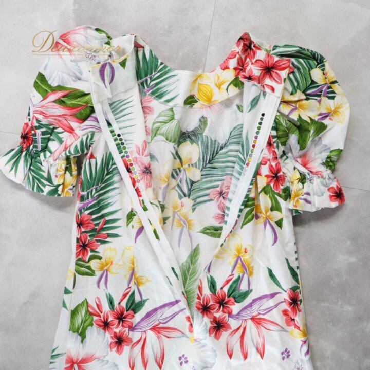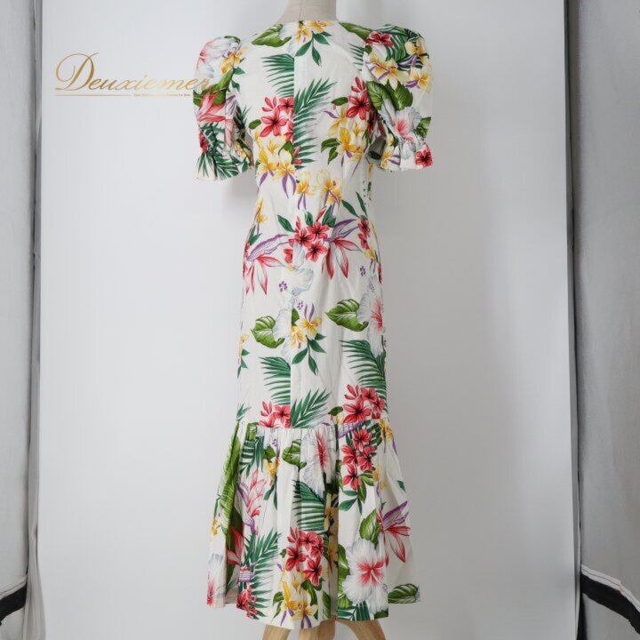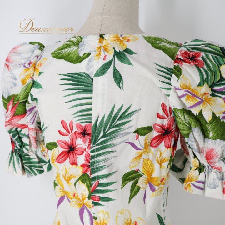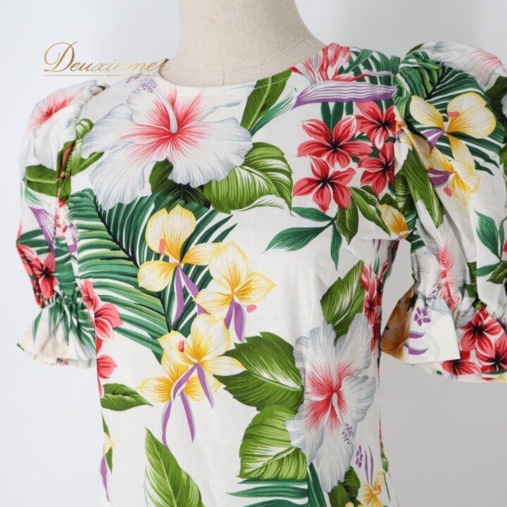 #ハワイアン #ハワイアンプリント #カラフル #ワンピース #パフスリーブ #袖付き #ガーリー #フェミニン #夏コーデ #リゾートコーデ #旅行コーデ #海 #リゾートワンピ #背面ファスナー #ウエスト切替 #スタイルアップ #大人可愛い #ナチュラルスタイル #春夏ファッション #ENUTSU
