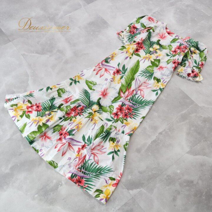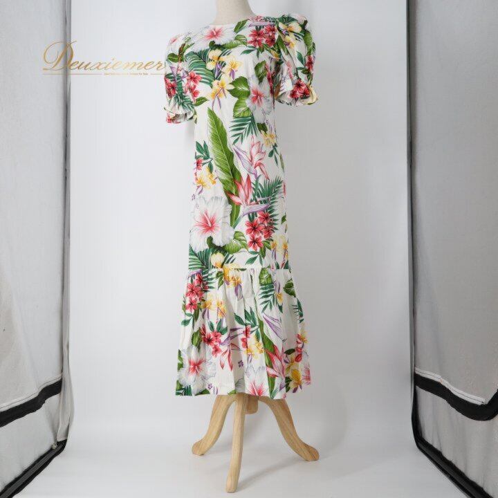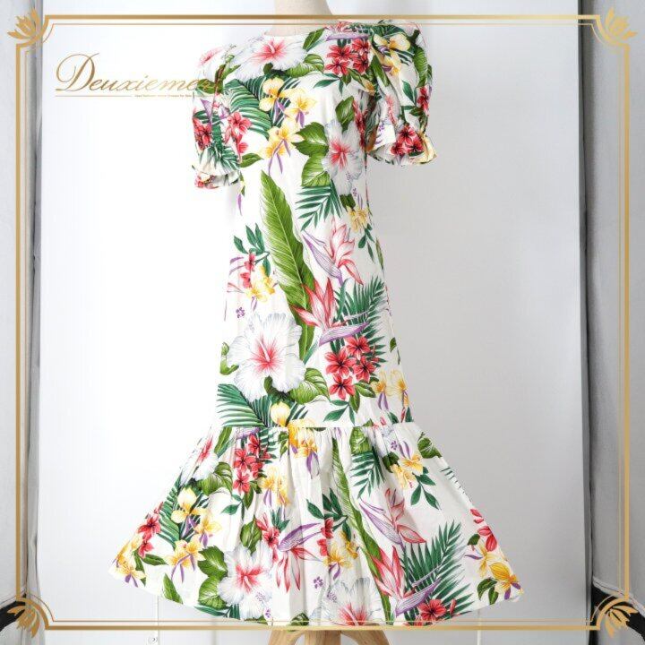 フラダンス 衣装 ワンピース ドレス ホワイト系 ハイビスカス柄 プルメリア柄 ハワイアンプリント 花柄 植物柄 アロハ フラ ダンス レッスン 練習 ハワイアンダンス レディース 半袖 フリル袖 パフスリーブ 華やか 鮮やか カラフル かわいい おしゃれ レッド系 ピンク系 パープル系 グリーン系 イエロー系 フラ衣装 ワンピースドレス フレアワンピース ティアードスカート ふんわり ステージ衣装 舞台衣装 発表会 レッスン着 練習用 レディス ハイビスカス プルメリア アロハシャツ風 コットン風