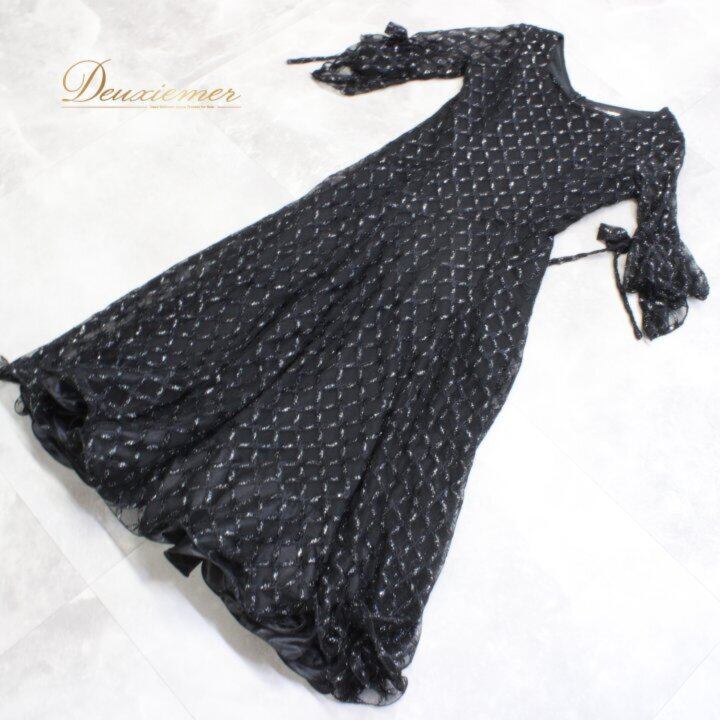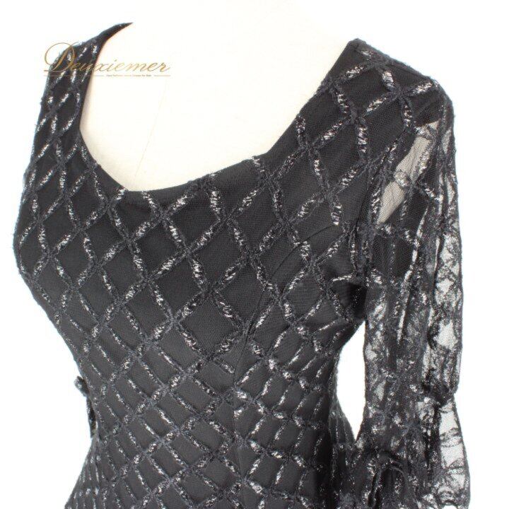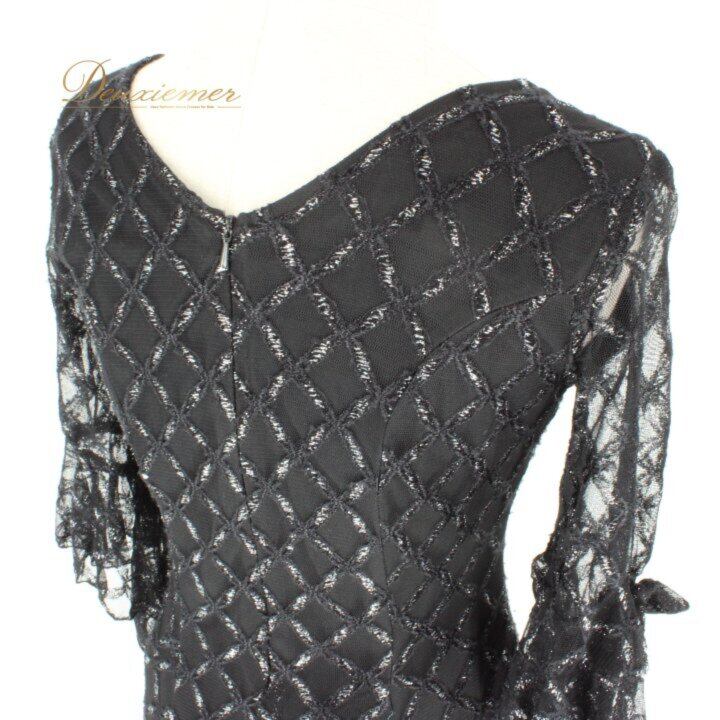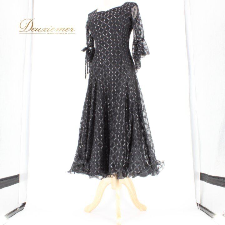 社交ダンス 衣装 スタンダード ドレス ワンピース パーティドレス レディース prima boutique ブラック系 黒 リボン パーティドレス レース 黒ドレス ラインストーン風 刺繍風 チェック柄風 模様入り レースワンピース フレアスカート