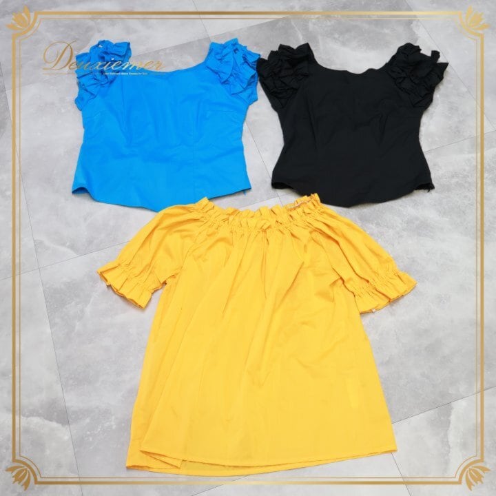 フラダンス 衣装 まとめ売り 全3点 セット アビバーレ Avivare トップス ブラウス 青 黄 黒 フリル 無地 シンプル 練習 レッスン かわいい イベント ステージ ブルー系 イエロー系 ブラック系 3点セット 練習用 レッスン用 フリル袖 定番 パープル系 色違い 3色 コーデ 青系 水色 半袖 フレンチスリーブ風 ラウンドネック 伸縮なし ステージ衣装 舞台衣装 発表会衣装 衣装セット LLサイズ Mサイズ M-Lサイズ