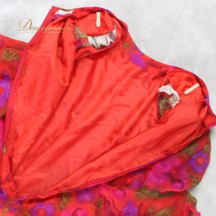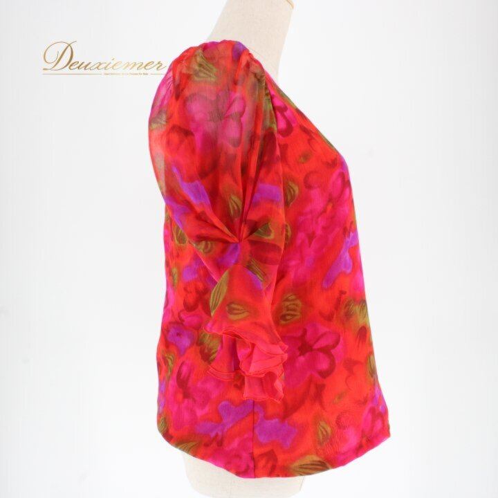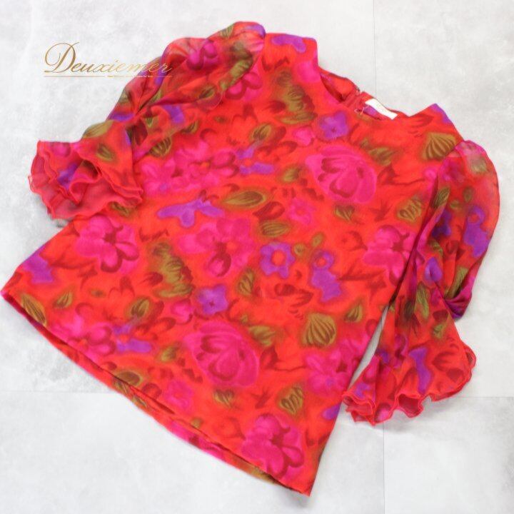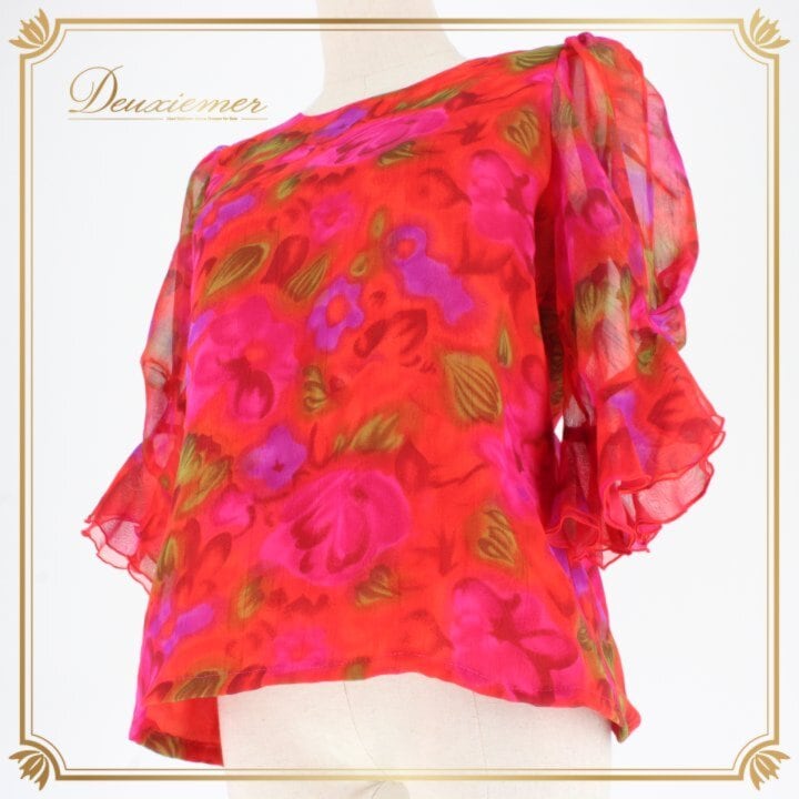 社交ダンス 衣装 スタンダード トップス レッスンウェア レディース U:NA レッド系 ピンク系 パープル系 赤 紫 華やか 派手 練習着 かわいい U:NA ユーナ 日本製 ブラウス風 トップス 袖フレア フリル袖 透け感 シースルー 薄手 軽やか レッスンウェア ダンス練習 競技 ダンスレッスン 発表会 衣装用 生地 ポリエステル フラワー柄 フェザー柄 リーフ柄 鮮やか カラフル 華やかデザイン カラーコーデ ダンス女子 ダンサー フェミニン エレガント 上品 赤系ピンク系パープル系