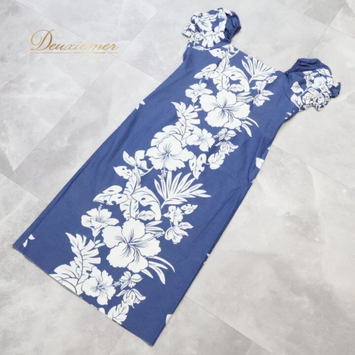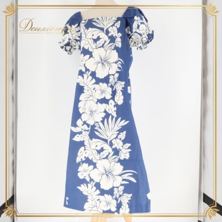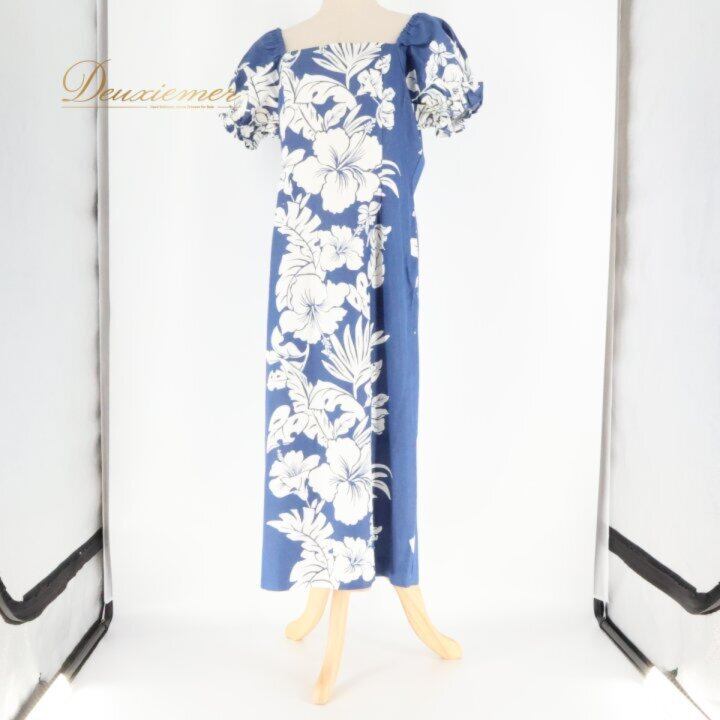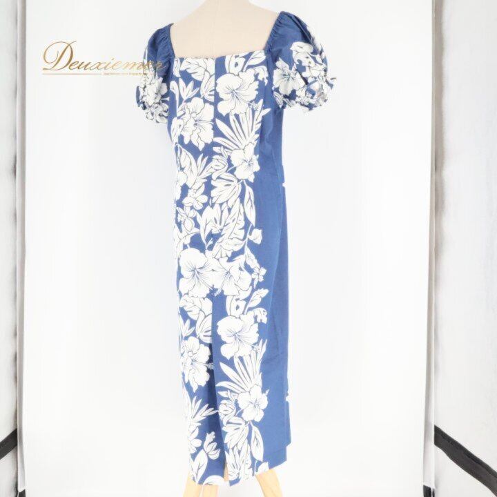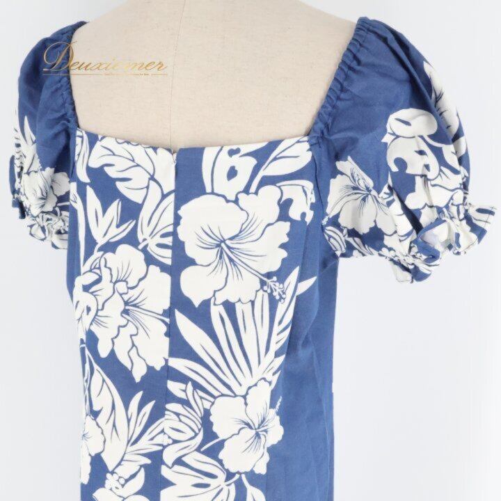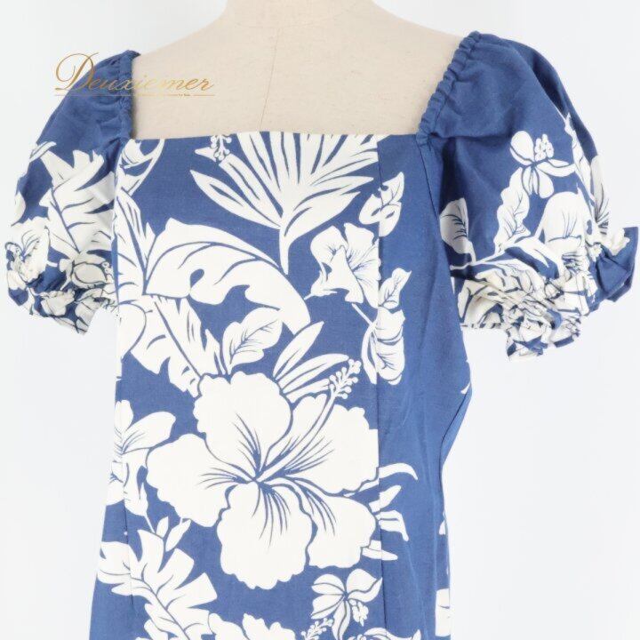 フラダンス 衣装 ワンピース ドレス ホワイト系 ネイビー系 ツーカラー ハイビスカス柄 パフスリーブ かわいい 華やか 鮮やか 明るい 爽やか 大人っぽい ハワイアンダンス レディース ハワイアン アロハ ハワイアンプリント フラ ダンス レッスン 練習