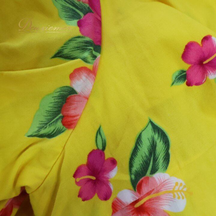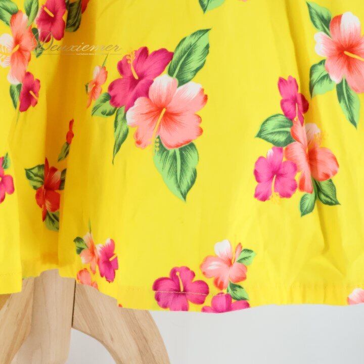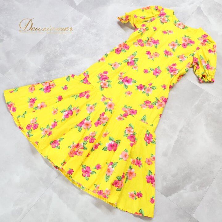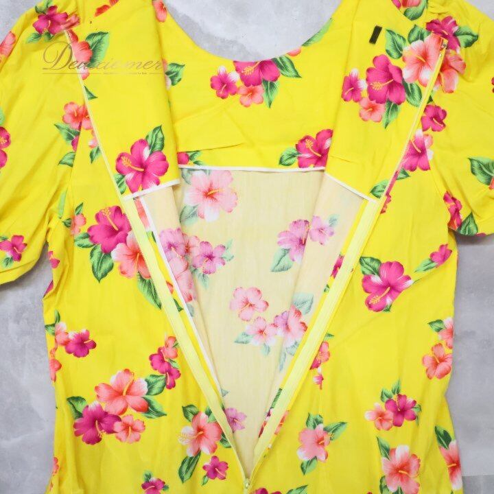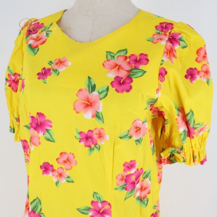フラダンス 衣装 ワンピース ドレス イエロー系 ピンク系 ハイビスカス柄 パフスリーブ かわいい 華やか 鮮やか 明るい 元気 黄 ダンス衣装 ハワイアンダンス レディース ハワイアン アロハ ハワイアンプリント フラ ダンス レッスン 練習 フラワンピース