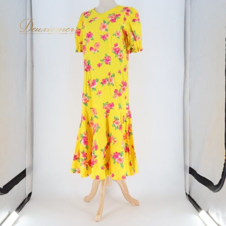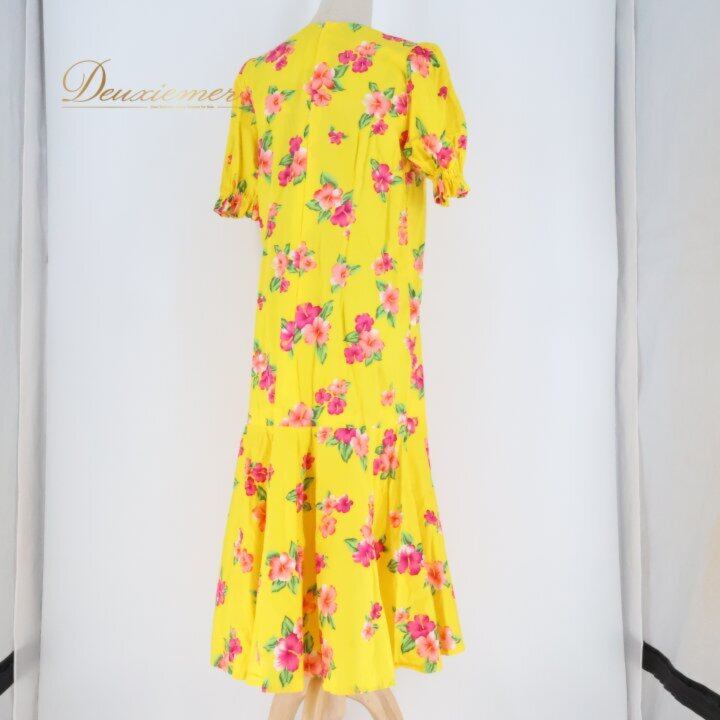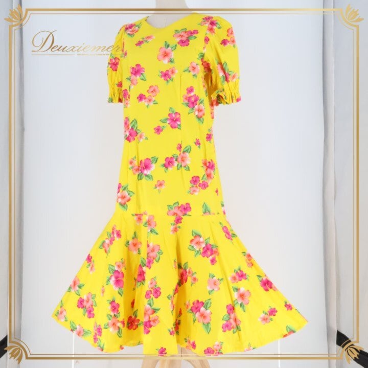 #ワンピース #イエローワンピース #花柄 #フラワープリント #カジュアル #フェミニン #可愛い #明るいカラー #春コーデ #夏コーデ #背面ファスナー #ノーストレッチ #伸縮性なし #ウエストシルエット #ミモレ丈 #ミディ丈 #おしゃれコーデ #大人可愛い #お出かけ #ENUTSU