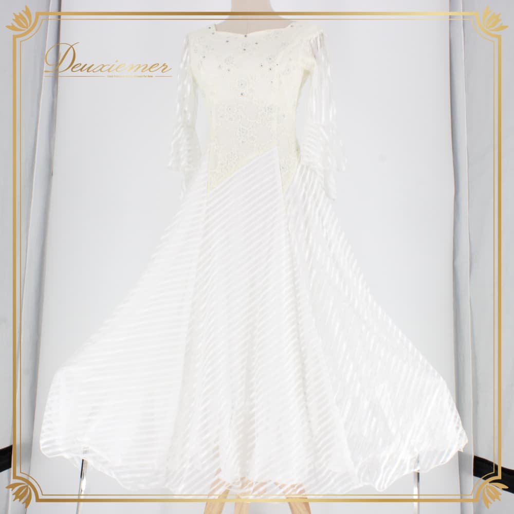 社交ダンス 衣装 スタンダード ドレス ワンピース パーティドレス レディース prima boutique ホワイト系 白 花柄 レース ラインストーン 白系 ウエディング風 フォーマル コンサート 発表会 レッスン用 上品 フェミニン エレガント ダンス衣装 ロングスカート 白ドレス 花柄レース 総レース ラインストーン付き フラワー ウエスト切替 きれいめ ワンピースドレス プリマブティック シルバー系 透け感あり 長袖 袖あり フリルスカート メッシュレース シルバーストーン 体型カバー
