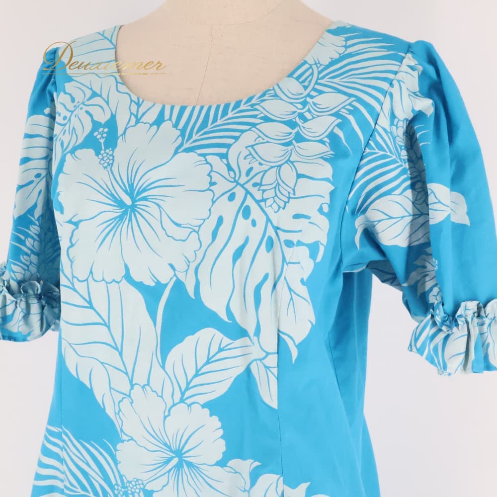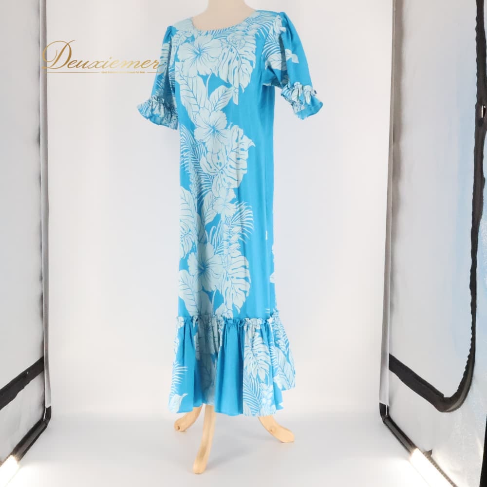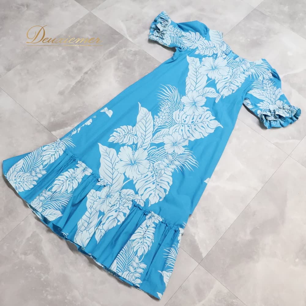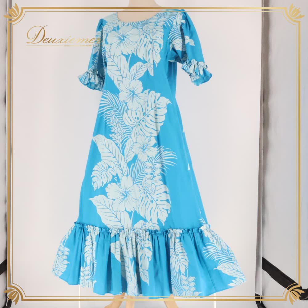 フラダンス 衣装 ワンピース ドレス ブルー系 ホワイト系 ハイビスカス柄 モンステラ柄 フリル かわいい 華やか 鮮やか 明るい 爽やか 水色 白 ダンス衣装 ハワイアンダンス レディース ハワイアン アロハ ハワイアンプリント フラ ダンス レッスン 練習