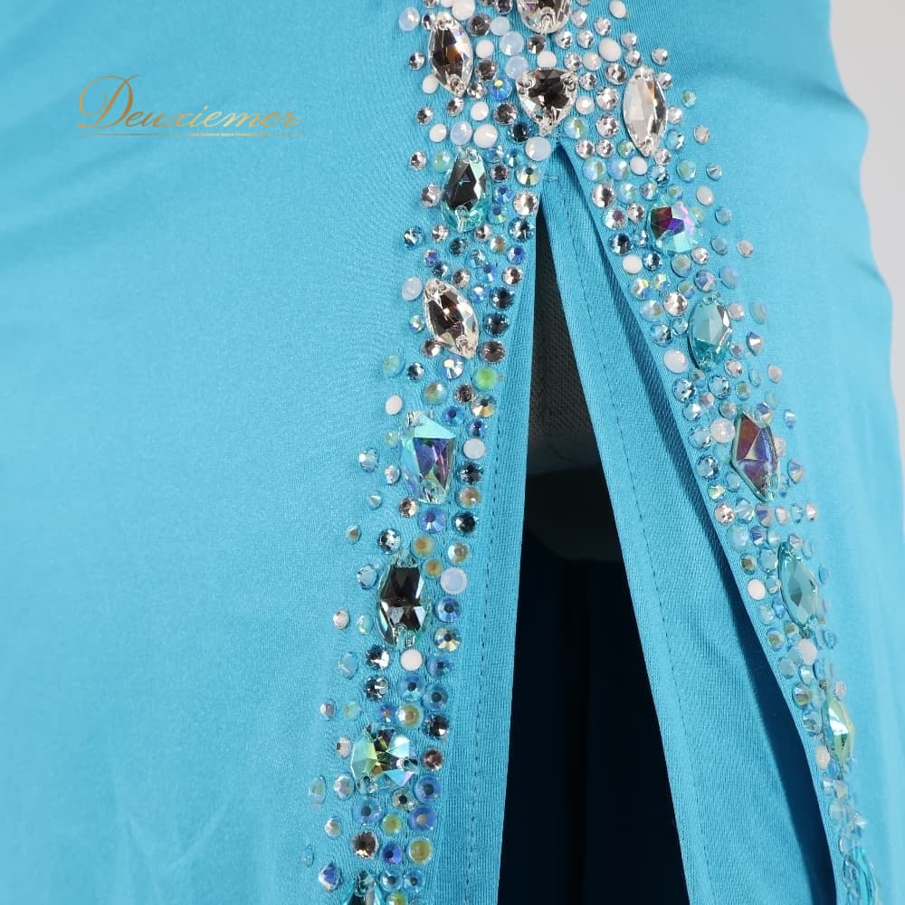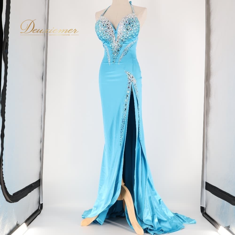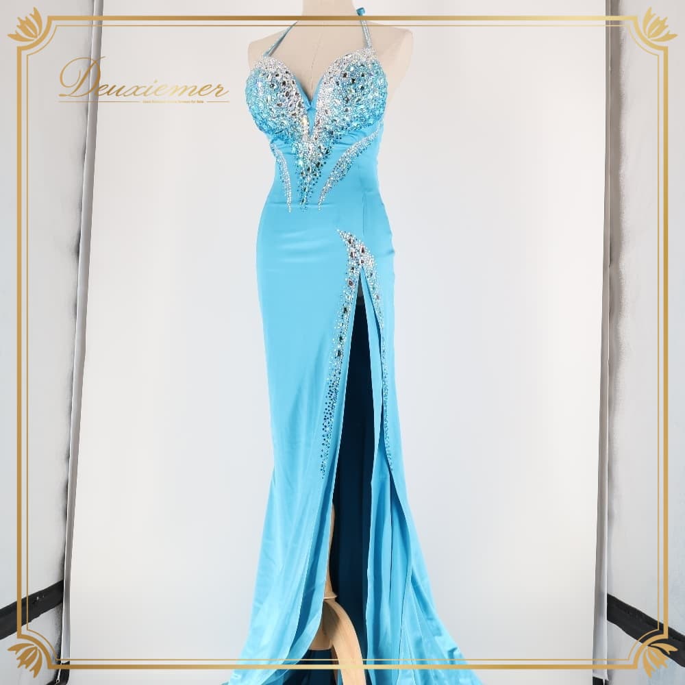 ボディコン コズドレ KOZdre KOZYA ドレス ワンピース ブルー系 シルバー系 水色 ランウェイモデル パーティ 発表会 練習 レッスン 大人可愛い スリット ロング丈 きれいめ フォーマル レッスンウェア シルバー装飾 光沢