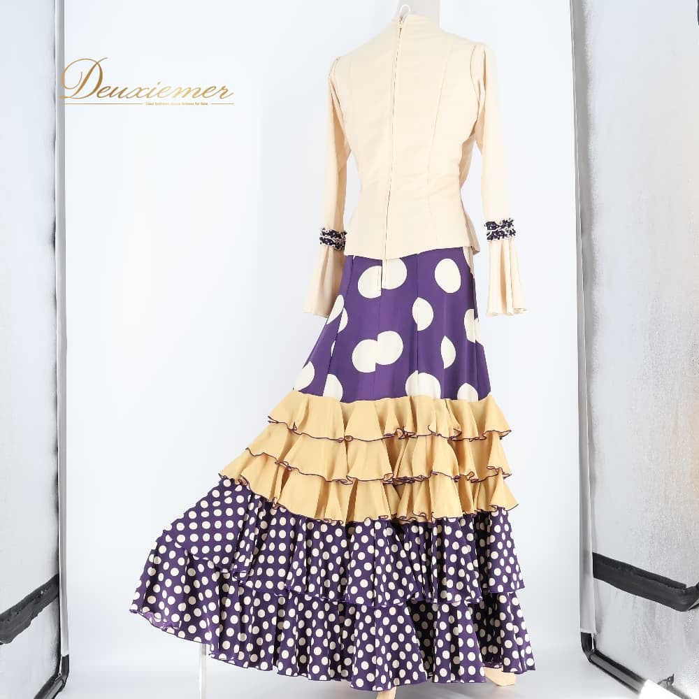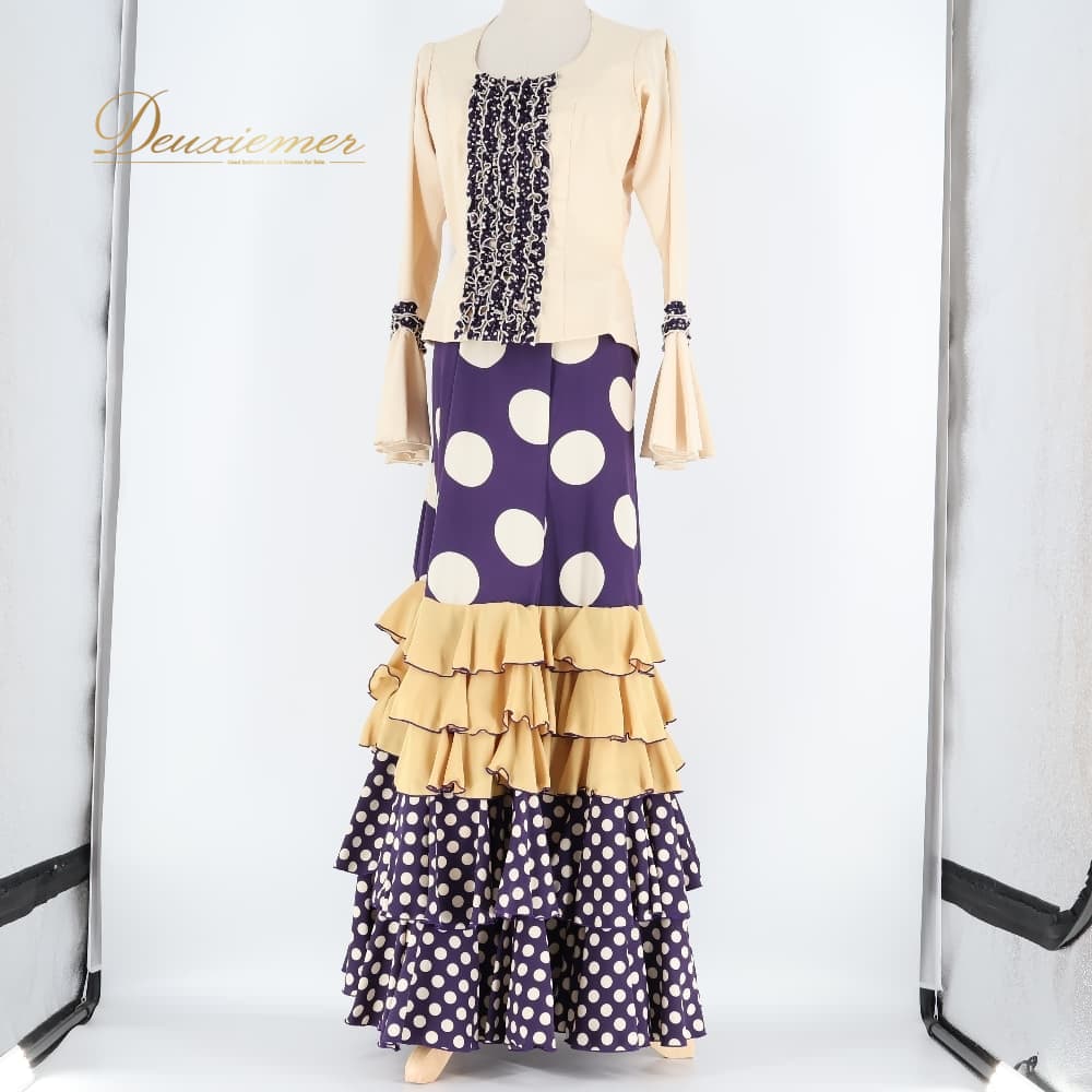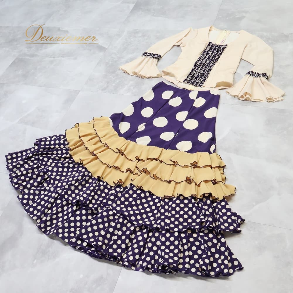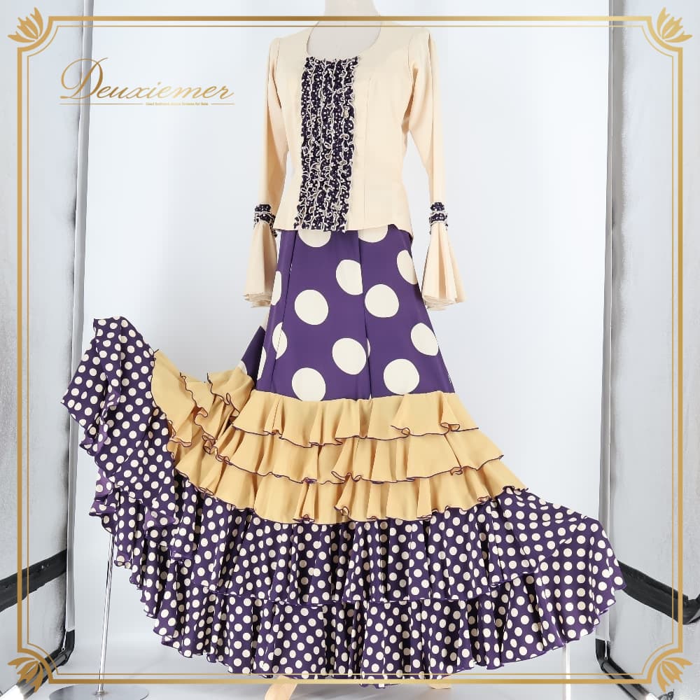 フラメンコ 衣装 エルモサイベリア HERMOSAIBERIA トップス ブラウス ファルダ スカート ツーピース セットアップ ベージュ系 パープル系 ゴールド系 クリーム 紫 水玉 ドット フリル ダンス パーティ 発表会 ダンス衣装 ステージ衣装 舞台衣装 ポップ かわいい レトロ