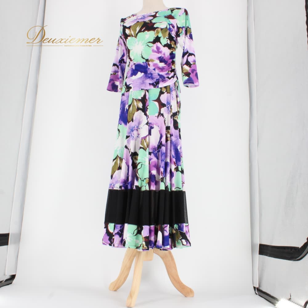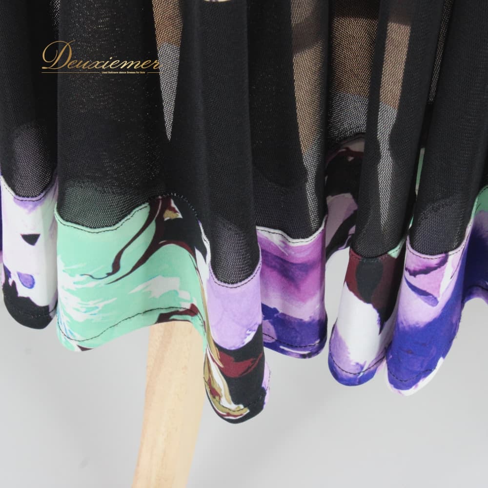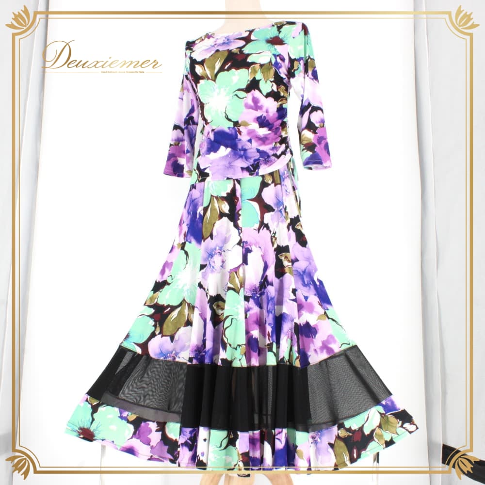 社交ダンス 衣装 スタンダード 上下セット ツーピース レッスンウェア パーティ衣装 ブラック系 ホワイト系 パープル系 グリーン系 紫 黒 緑 紫系 花柄 デザイン 大胆 ワンピース風 トップス スカート フレアスカート ラテン調 フォーマル ダンスウェア ジョアン レディース 伸縮性あり 7分袖 七分袖 カラフル モダンスタイル 派手柄 柄シャツ風 バイカラー アシンメトリー風 パープル×グリーン×ブラック 系統 おしゃれ 練習着 発表会用 舞台 レッスン パーティー衣装 成人女性用 Mサイズ相当