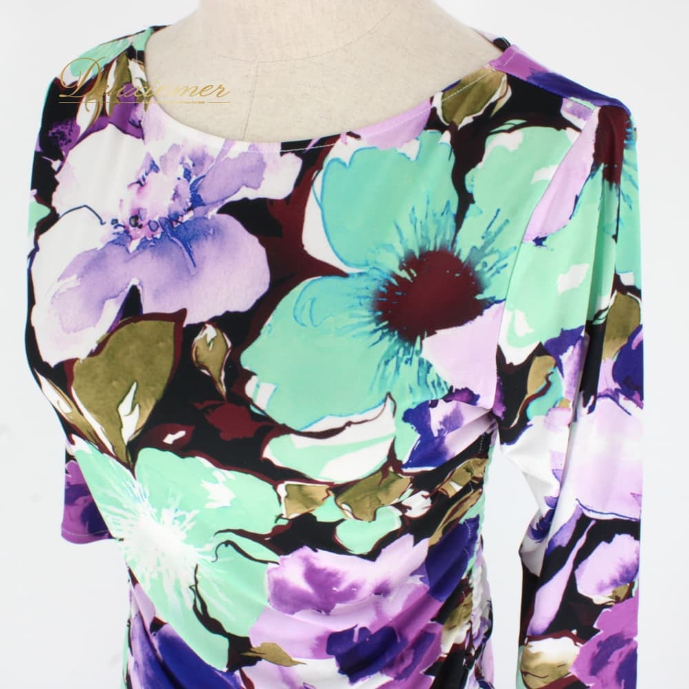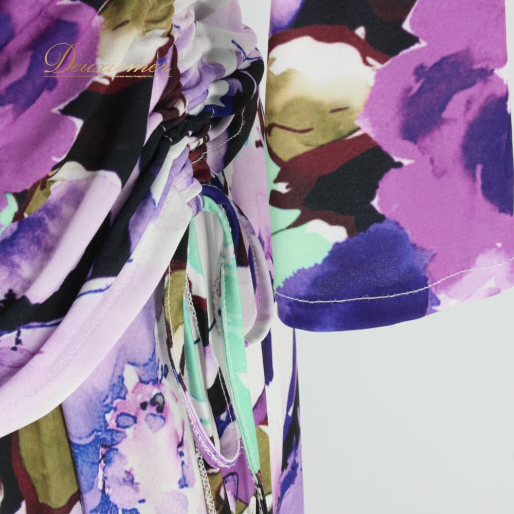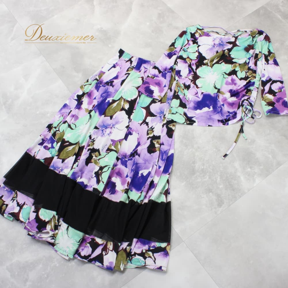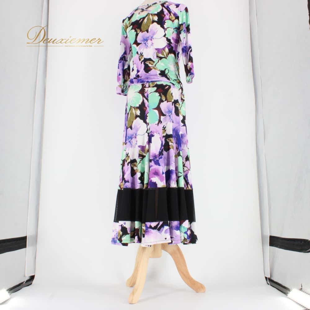 社交ダンス 衣装 スタンダード 上下セット ツーピース レッスンウェア パーティ衣装 ブラック系 ホワイト系 パープル系 グリーン系 紫 黒 緑 紫系 花柄 デザイン 大胆 ワンピース風 トップス スカート フレアスカート ラテン調 フォーマル ダンスウェア ジョアン レディース 伸縮性あり 7分袖 七分袖 カラフル モダンスタイル 派手柄 柄シャツ風 バイカラー アシンメトリー風 パープル×グリーン×ブラック 系統 おしゃれ 練習着 発表会用 舞台 レッスン パーティー衣装 成人女性用 Mサイズ相当