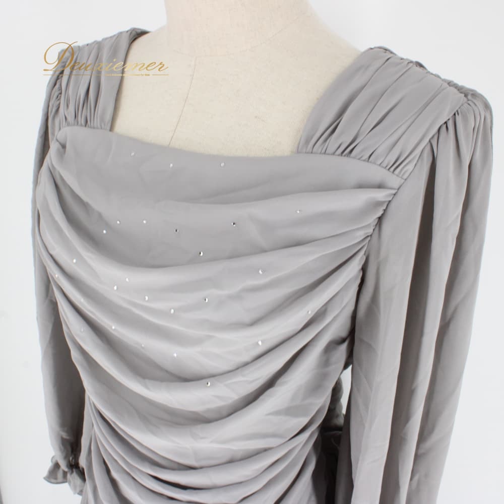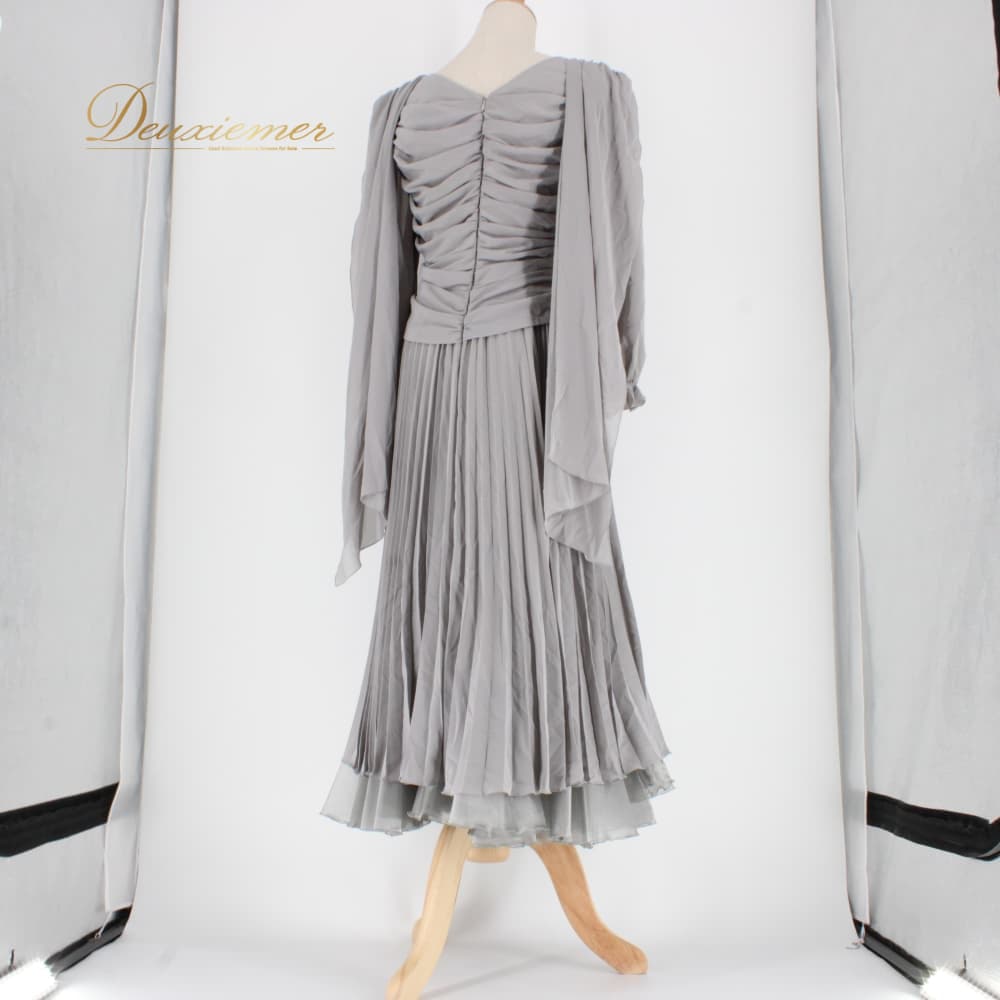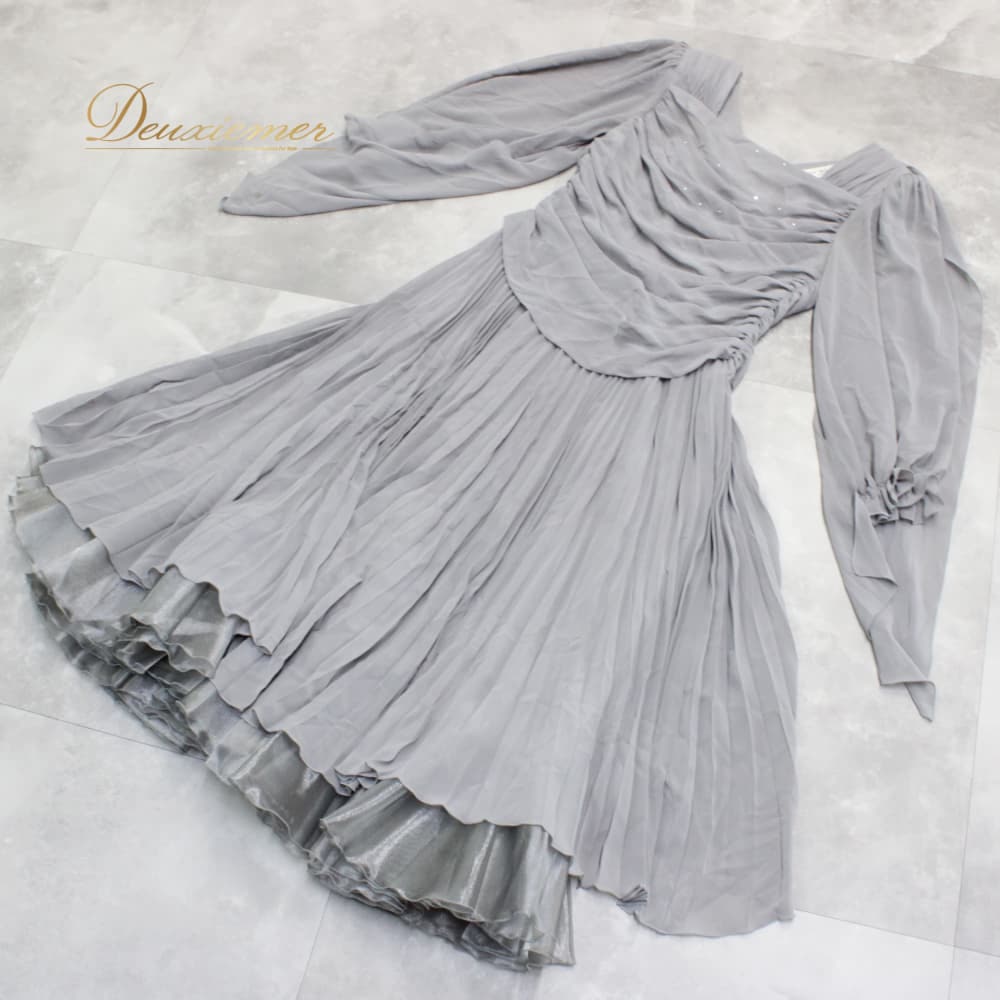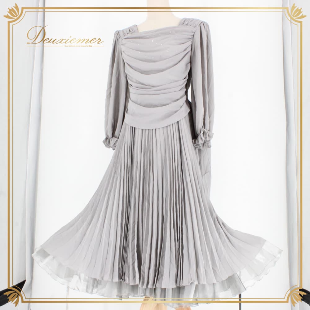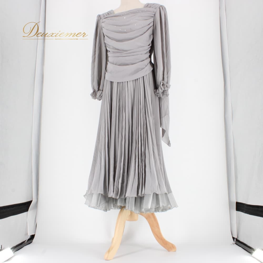社交ダンス 衣装 スタンダード ドレス ワンピース レッスンウェア パーティドレス BOUTIQUE MUGEN グレイ系 ラインストーン プリーツ 長袖 ライトグレー系 ワンピースドレス スタンダードドレス ストーン付き フレアスカート ドレープ ギャザー タック フィット感 エレガント 上品 きれいめ 大人可愛い 華やか モダン 競技用 ダンス衣装 パーティ用 発表会 コンクール グレー系 ライン装飾 繊細 薄手素材 動きやすい パステル系 ひざ丈 イブニングドレス イベントドレス マネキン撮影品