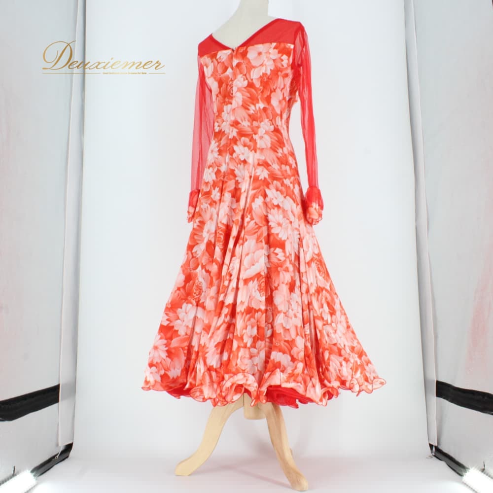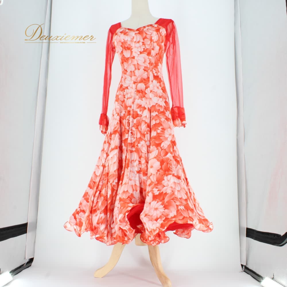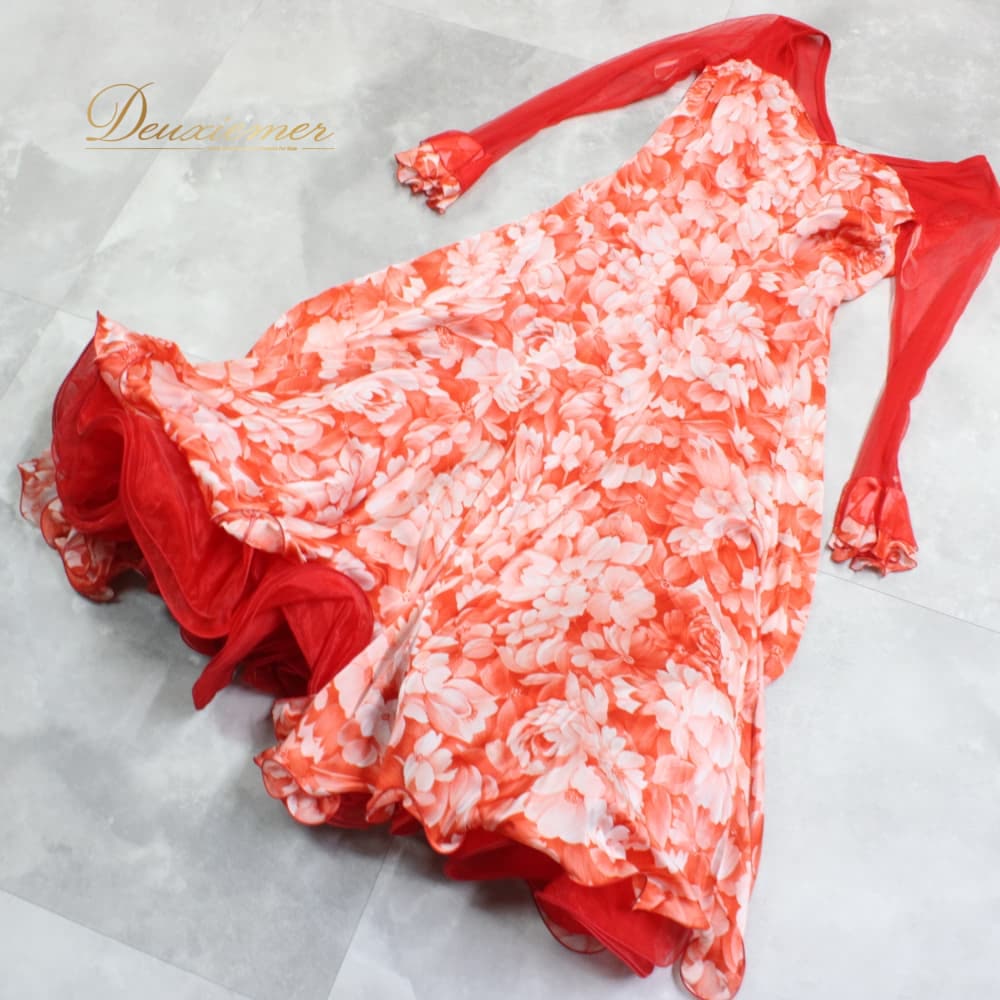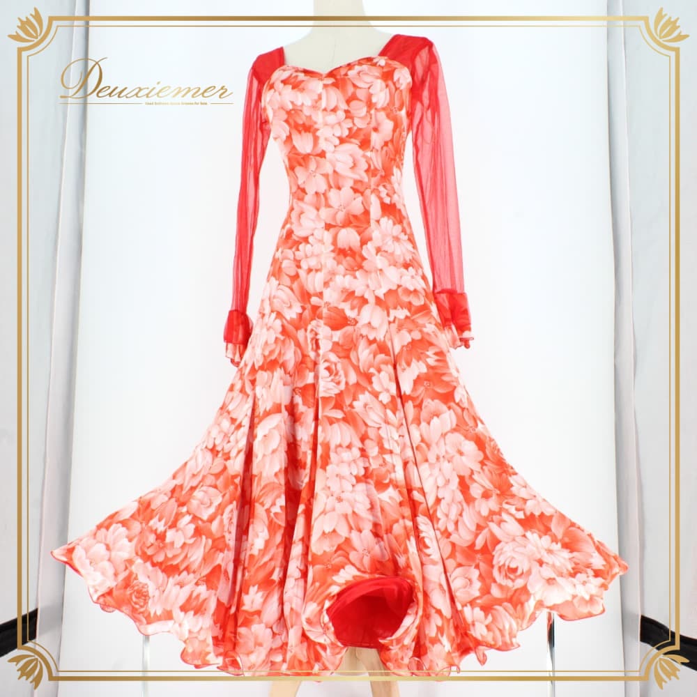 社交ダンス 衣装 スタンダード ドレス ワンピース パーティドレス Dance Fashion Pier ホワイト系 レッド系 白 赤 花柄 レース 長袖 社交ダンスドレス スタンダード用ワンピース 花柄ドレス フラワー柄 ワンピースドレス レース風 花モチーフ フレアスカート ロング丈 ひざ下丈 ロングスリーブ 長袖ドレス 透け感 袖あり オレンジ系 朱色系 発表会 ダンス衣装 パーティー用ドレス ポリエステル 洗練 ステージ衣装 エレガント かわいい フェミニン 大人可愛い 競技用