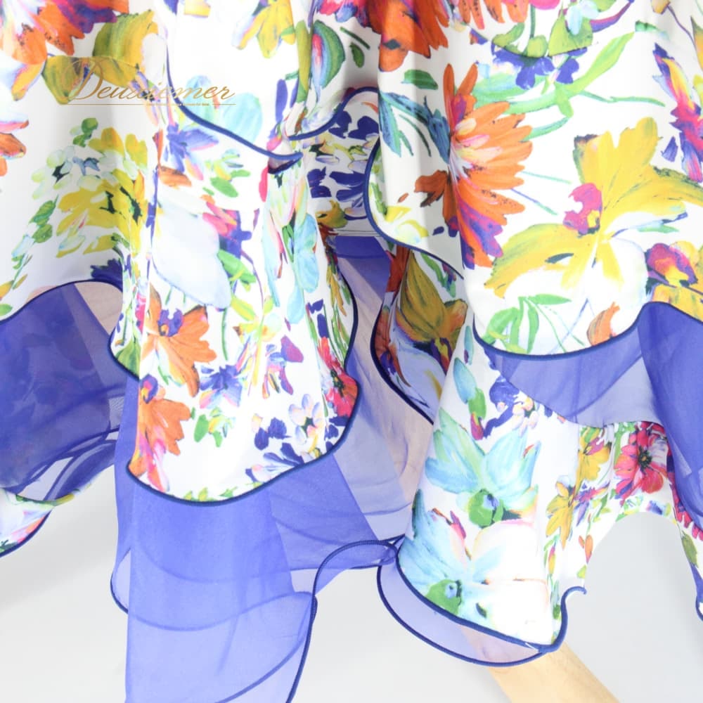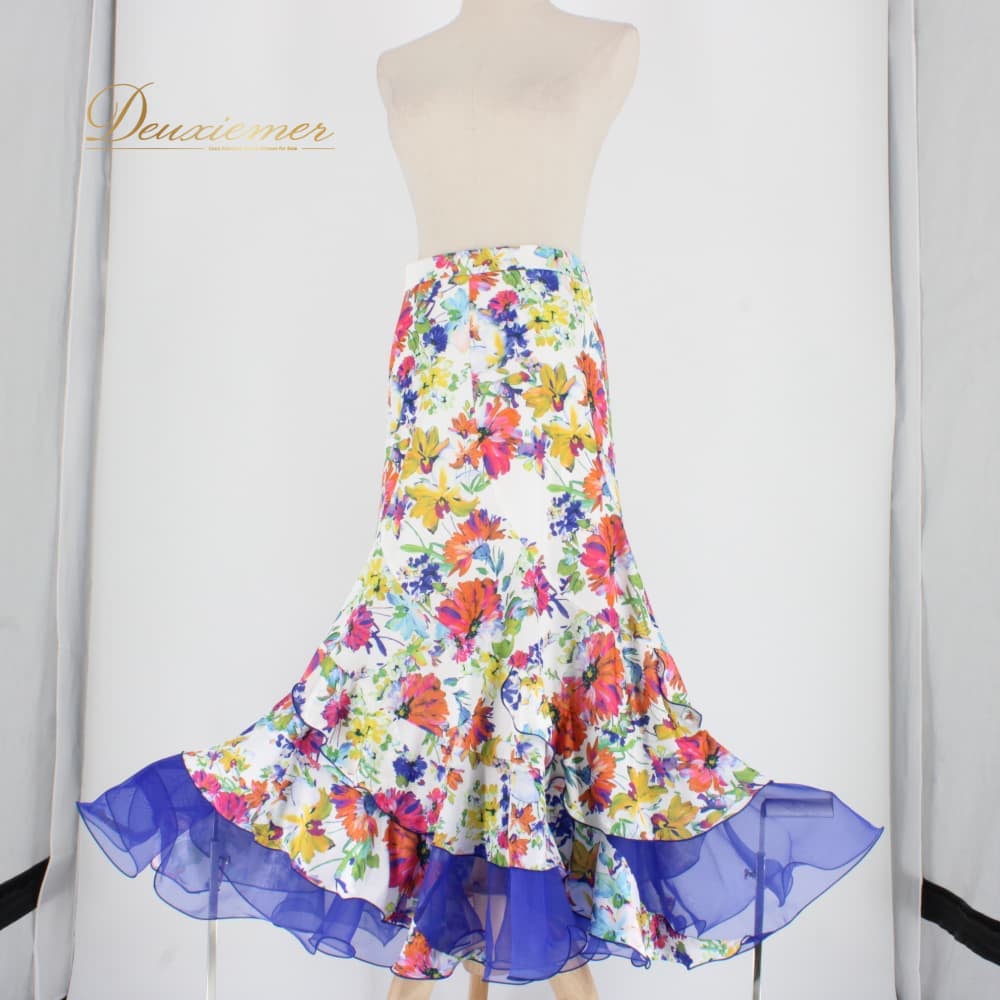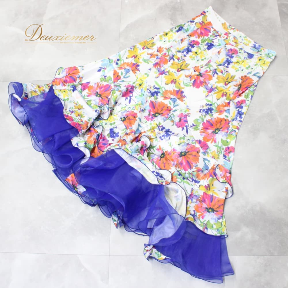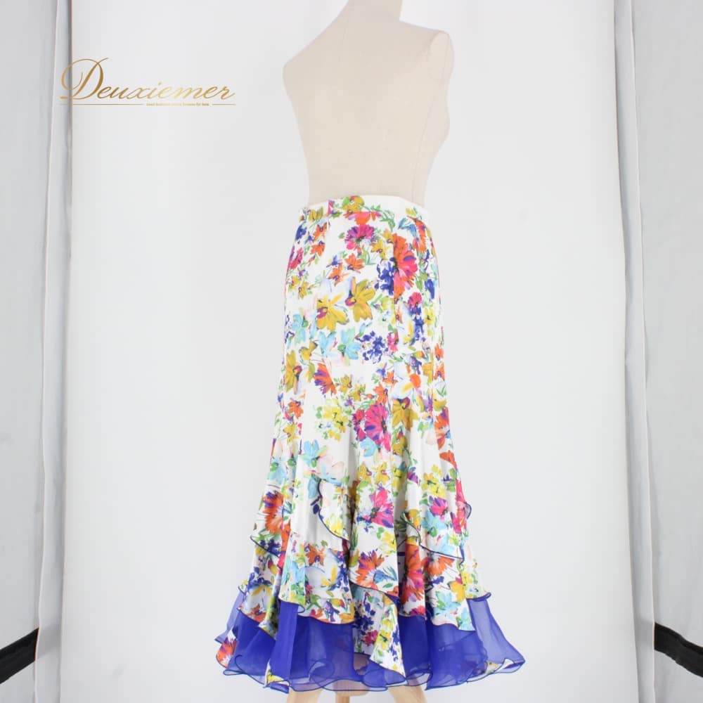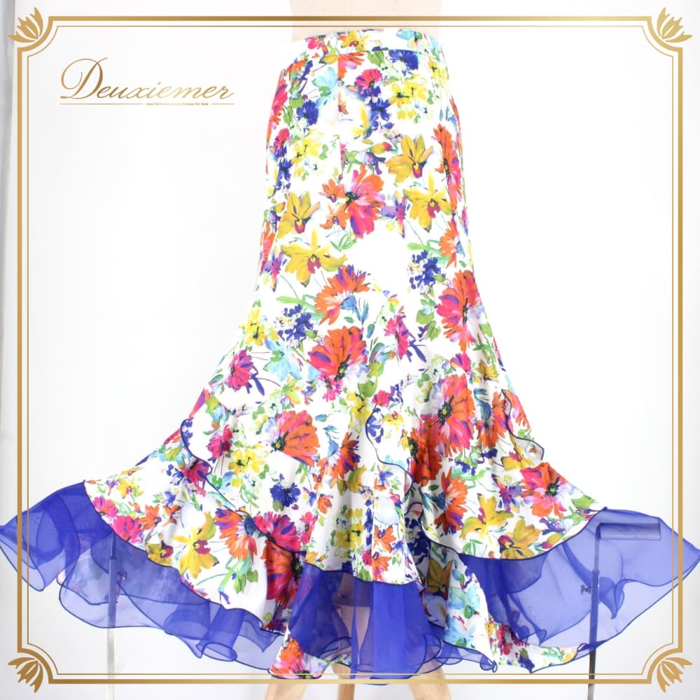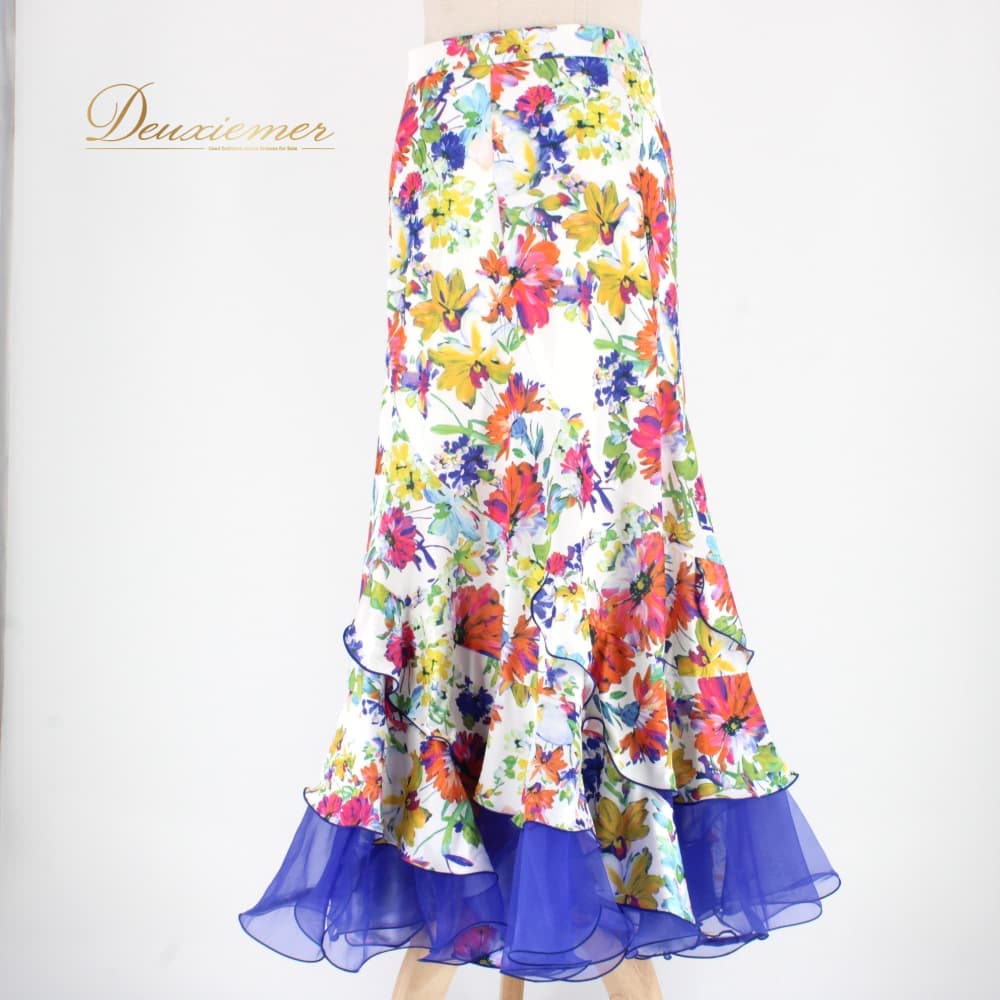 社交ダンス 衣装 スタンダード スカート レッスンウェア Sekine ホワイト系 ピンク系 ブルー系 グリーン系 イエロー系 オレンジ系 練習着 花柄 白 緑 青 黄色 フラワー柄 花柄スカート ロングスカート ダンススカート 競技ダンス 練習用 スタンダード用 社交ダンス練習着 社交ダンス衣装 レディース Mサイズ ポリエステル 伸縮性あり ファスナー付き フリル風 ティアード風 シフォン風 レース風 青系 派手柄 カラフル 白地 スカート丈84cm 9号 トルソー使用 透け感風 裾広がり