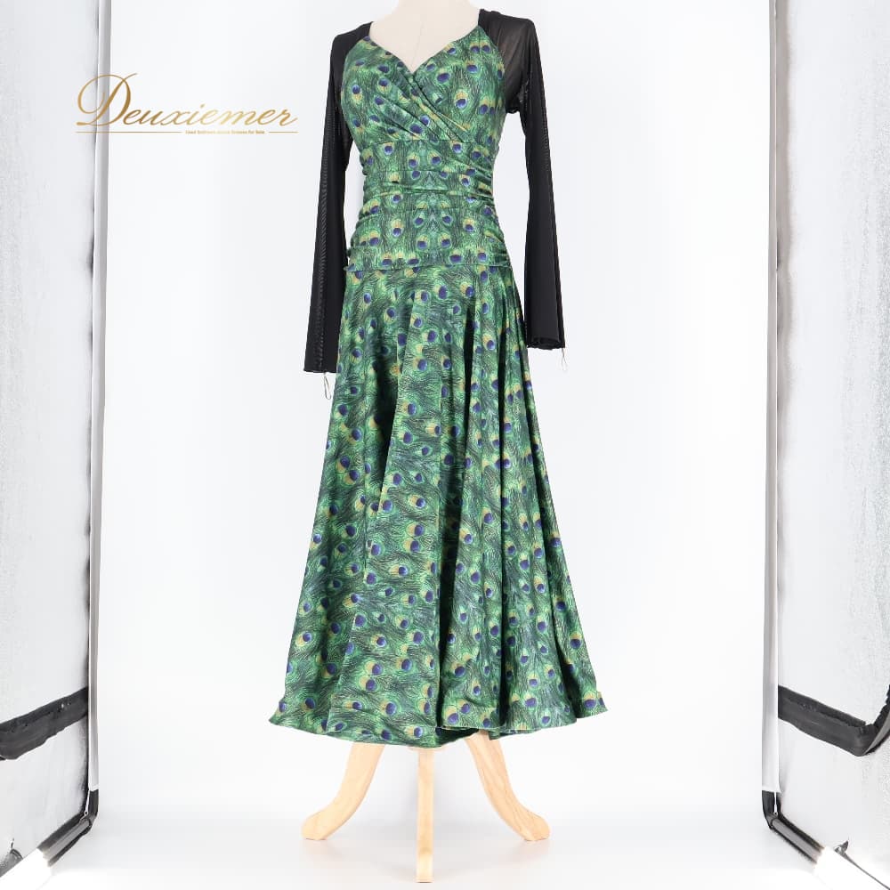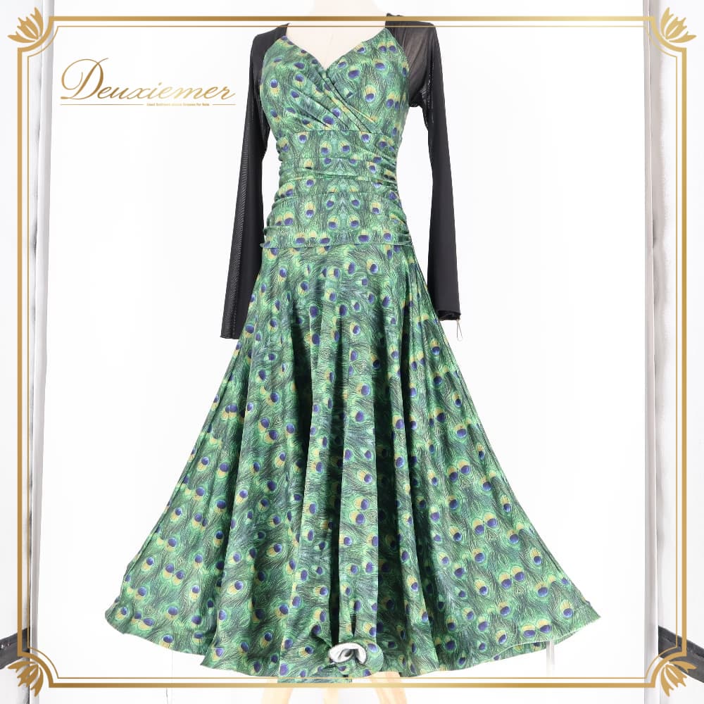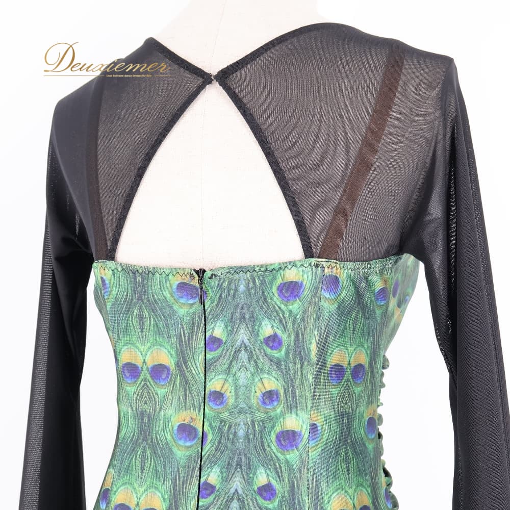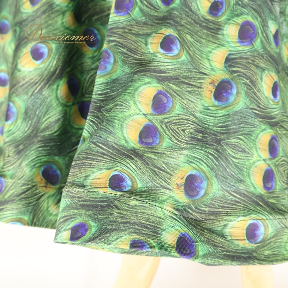 社交ダンス 衣装 ワンピース ドレス ブラック系 グリーン系 黒 緑 フォーエバーforever 孔雀 伸縮 パーティ 発表会 ダンス ストレッチ おしゃれ 孔雀柄 総柄 伸縮素材 伸びる 動きやすい パーティー用 ダンス用 発表会用 エレガント 大人 上品