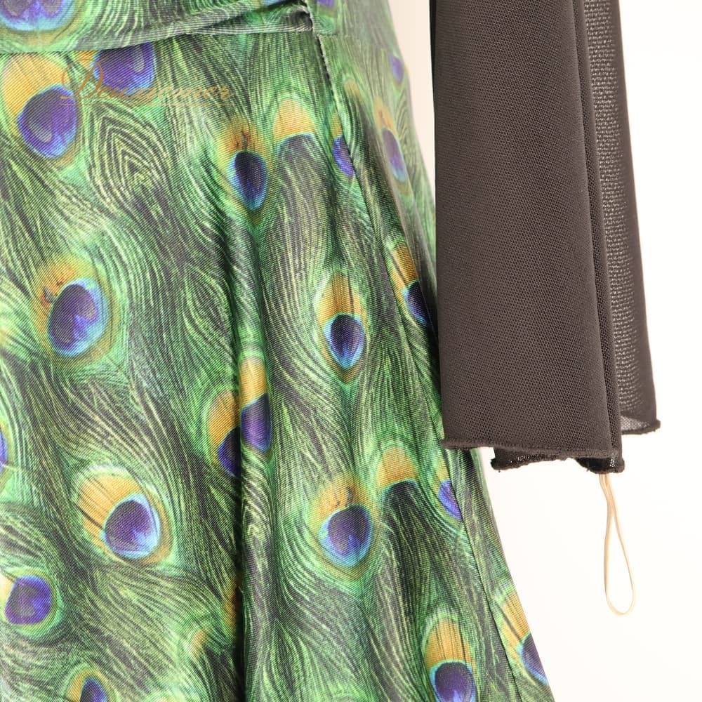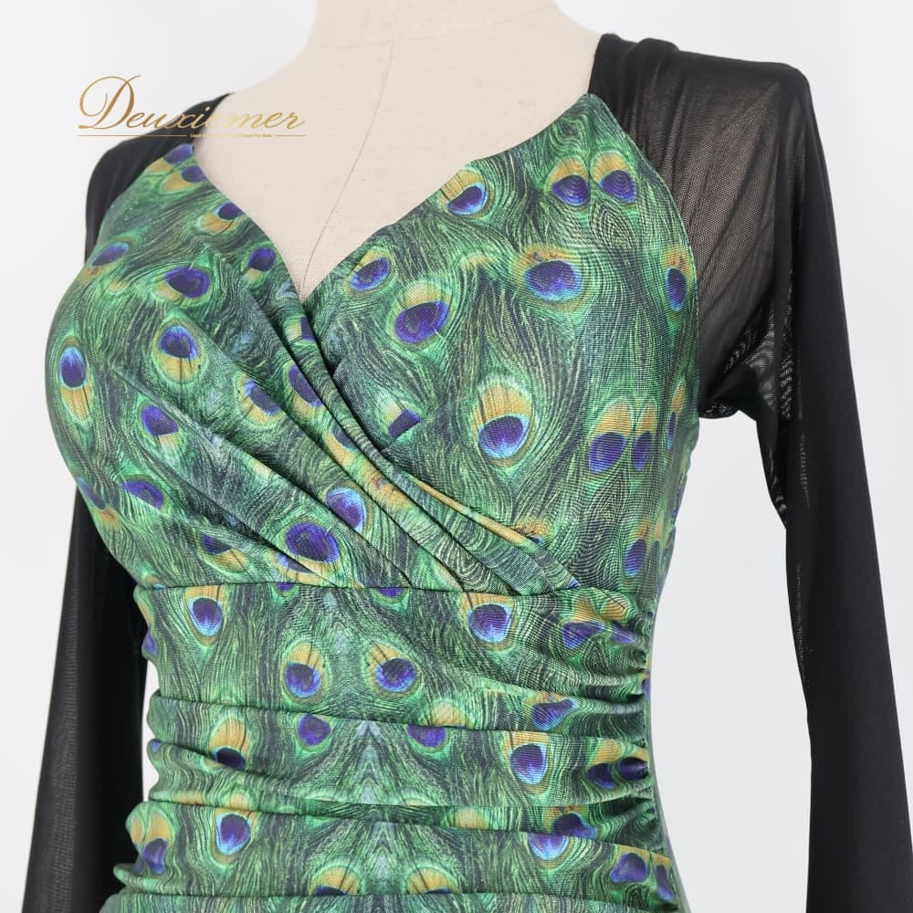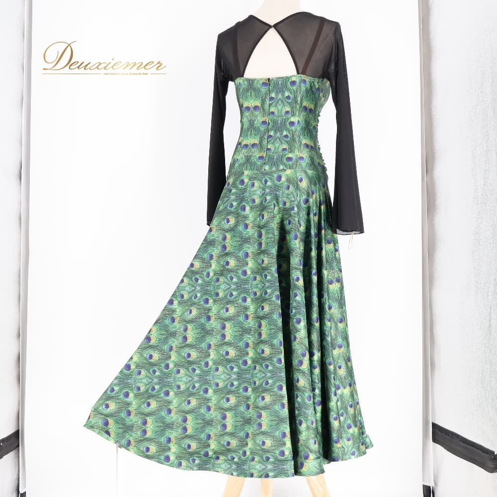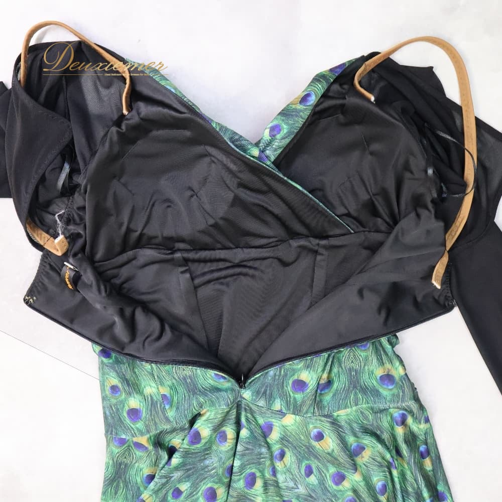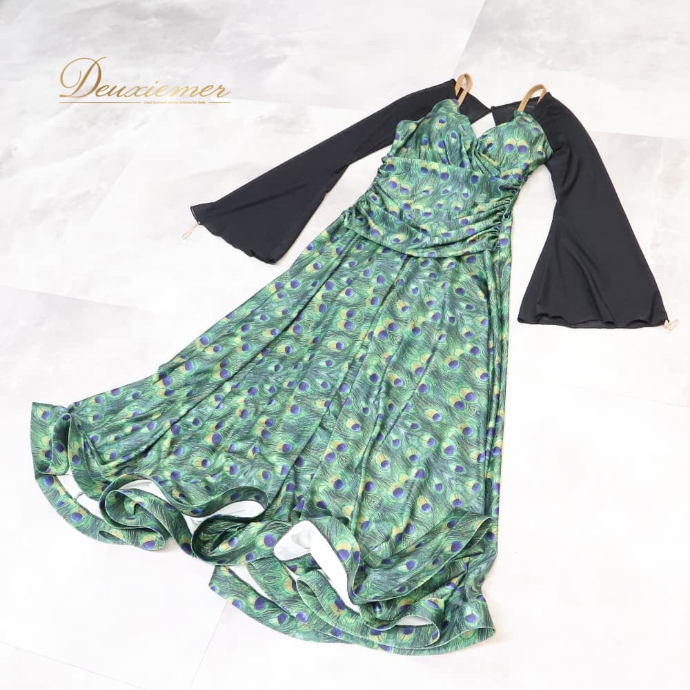 社交ダンス 衣装 ワンピース ドレス ブラック系 グリーン系 黒 緑 フォーエバーforever 孔雀 伸縮 パーティ 発表会 ダンス ストレッチ おしゃれ 孔雀柄 総柄 伸縮素材 伸びる 動きやすい パーティー用 ダンス用 発表会用 エレガント 大人 上品