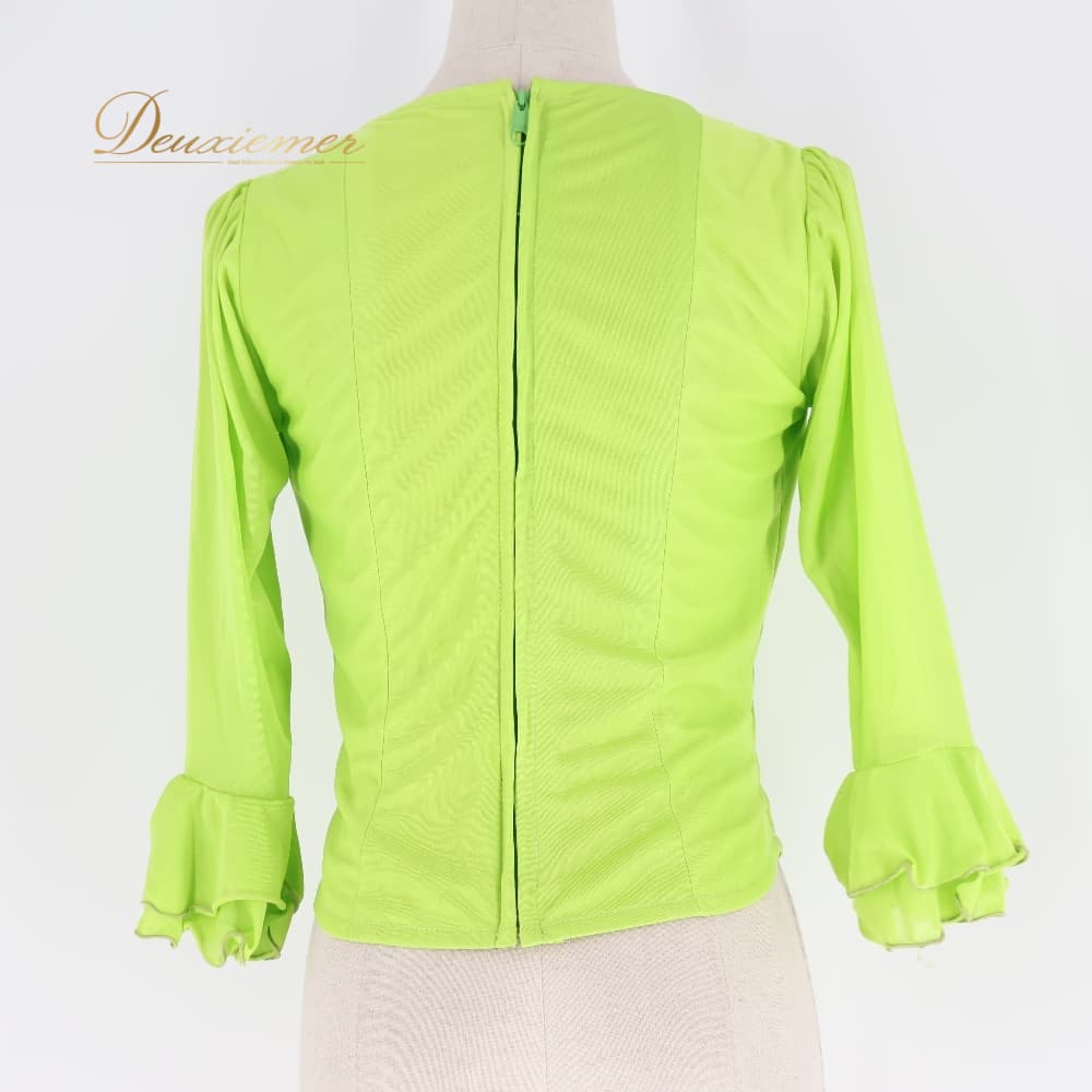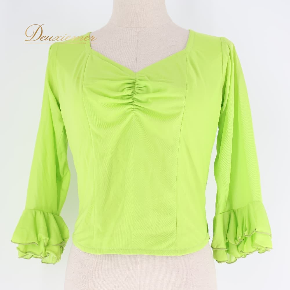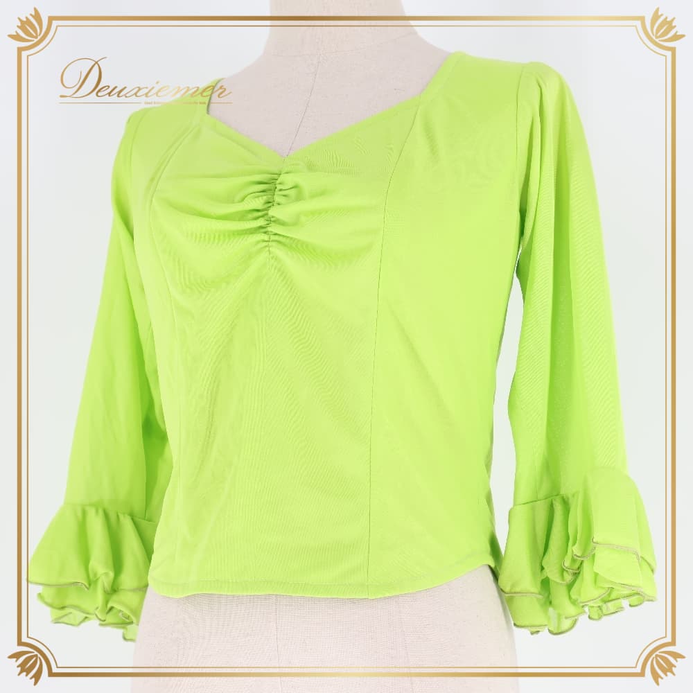 フラメンコ 衣装 トップス ブラウス グリーン系 黄緑 伸縮 ストレッチ フリル ダンス パーティ レッスン 練習着 無地 明るい レディース ダンス衣装 練習用 ステージ衣装 発表会衣装 シンプル ライトグリーン フラメンコレッスン衣装
