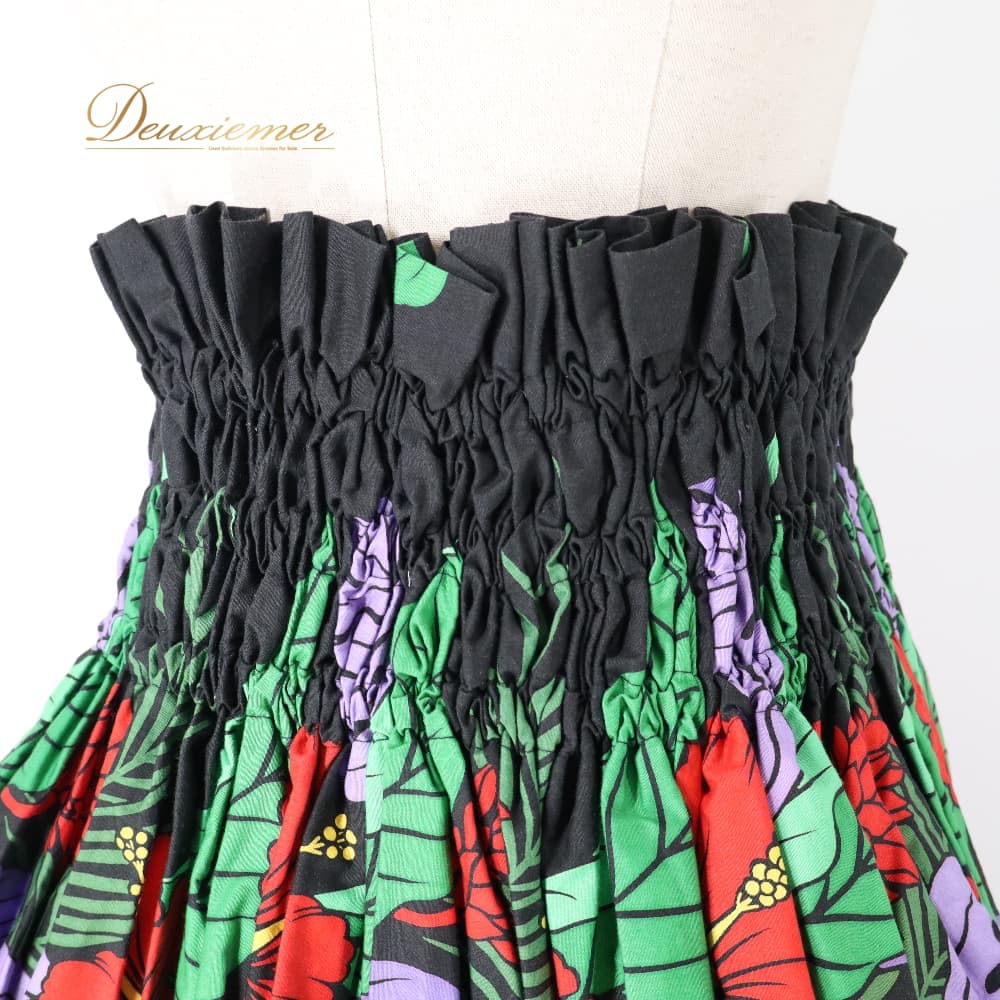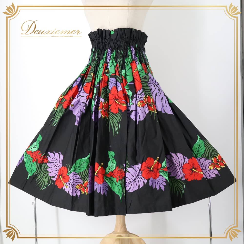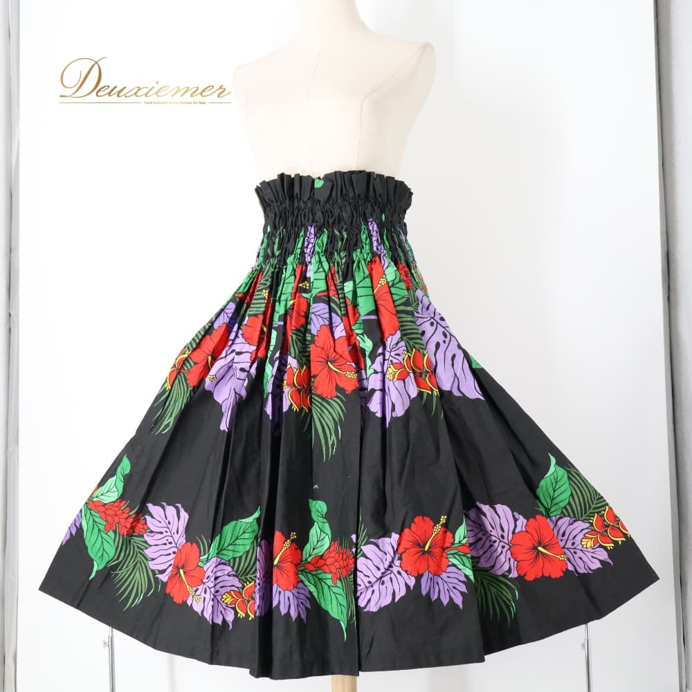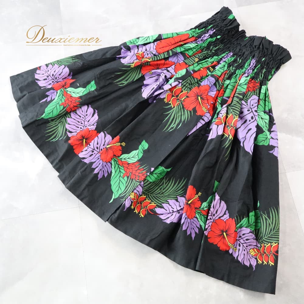 フラダンス 衣装 パウスカート ブラック系 ハイビスカス柄 モンステラ柄 黒 ハワイアンプリント アロハ フラ ダンス レッスン 練習 シングル スカート フレア 軽やか 華やか 鮮やか かわいい おしゃれ 上品 大人っぽい ダンス衣装 ハワイアンダンス レディース レッド系 パープル系 グリーン系 イエロー系 ハワイ 文化 キッズ ではない 大人 黒系 3本ゴム ウエストゴム ゴム入り 伸縮 ウエスト楽 フレアスカート 単品 柄入り 花柄 葉柄 南国 フラレッスン ルームウェア ダンス練習 発表会