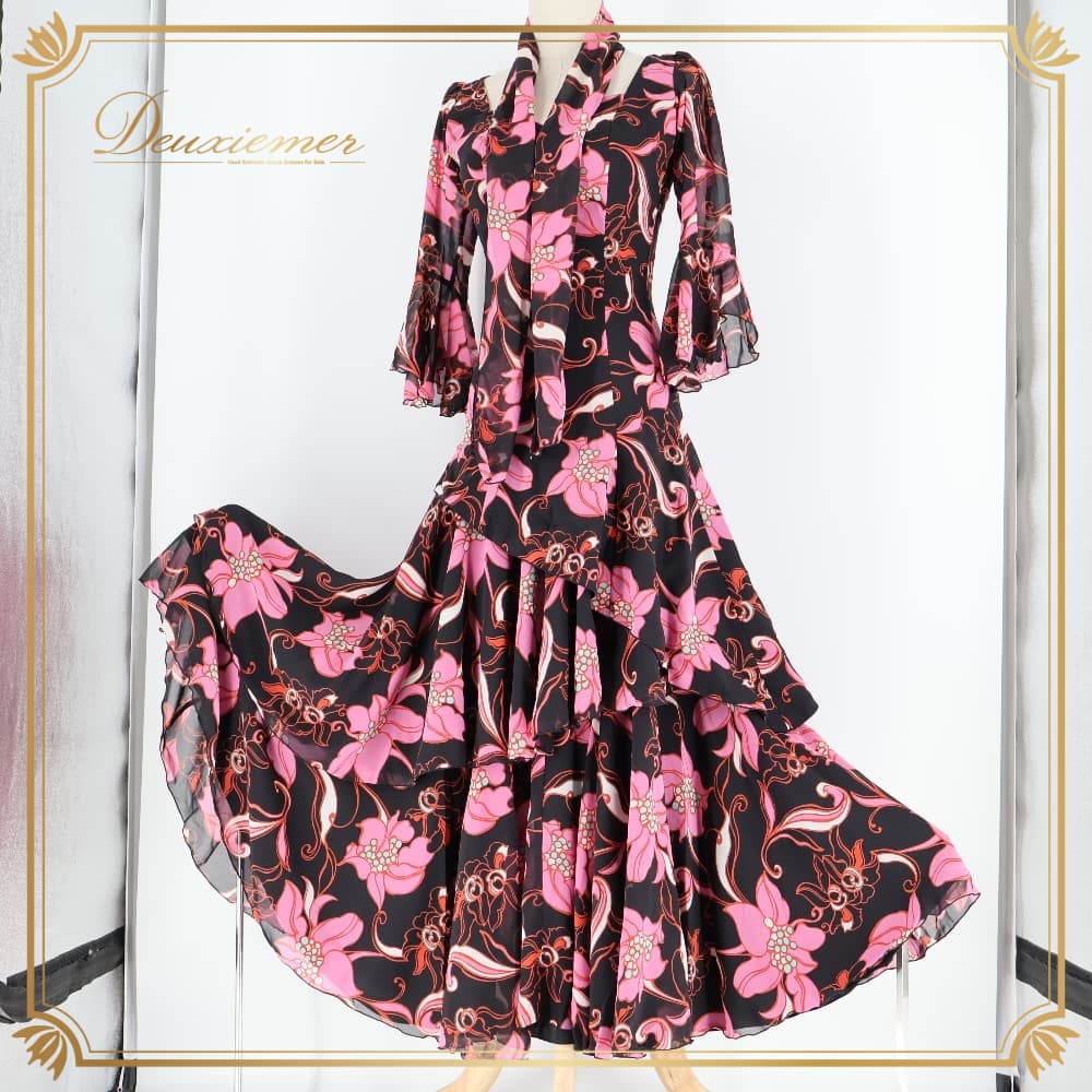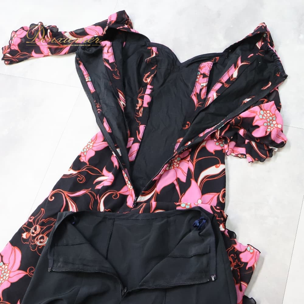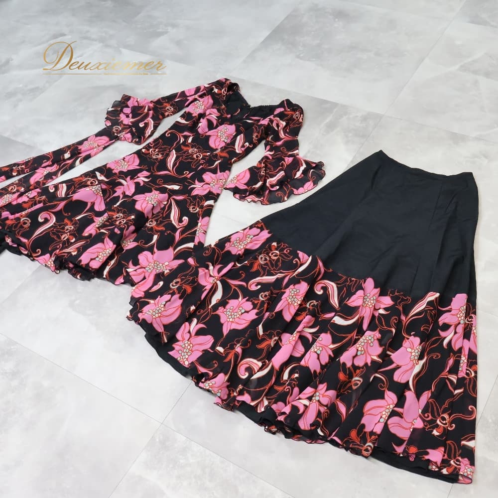 フラメンコ 衣装 トップス ブラウス ファルダ スカート ツーピース セットアップ ブラック系 ピンク系 黒 ピンク 花柄 ダンス パーティ 発表会 フリル ボランテ ボウタイ フラメンコ衣装 フラワー柄 大人可愛い ダンス衣装 舞台衣装 可愛い かわいい レディース 女性用