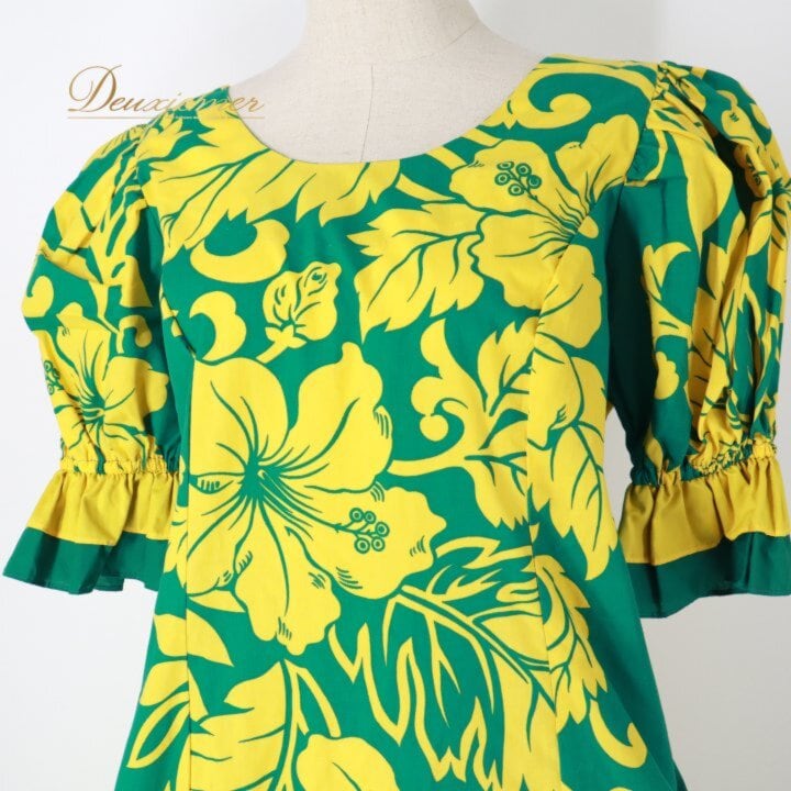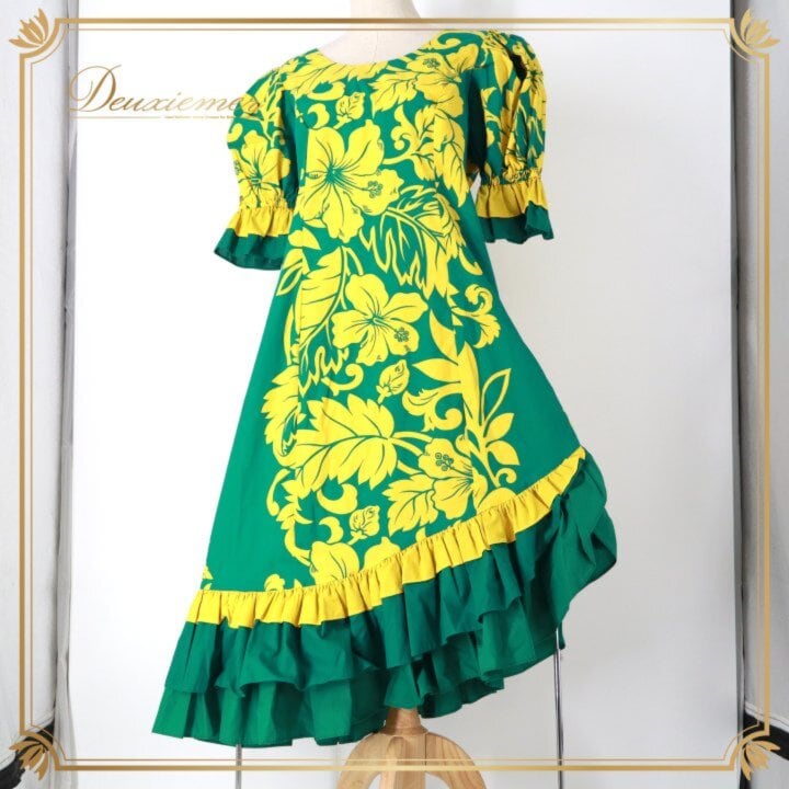 フラダンス 衣装 ワンピース ドレス グリーン系 ムームーファクトリー ハワイ製 T&L MUUMUU FACTORY ハイビスカス柄 モンステラ柄 緑 ハワイアンプリント フリル アロハ フラ ダンス レッスン 練習 黄 ダンス衣装 ハワイアンダンス レディース イエロー系 華やか 鮮やか かわいい おしゃれ タグ フラワー柄 ボタニカル柄 鮮やかデザイン トロピカル柄 グリーン イエロー 配色 ゆったりシルエット マキシ丈 五分袖 フレア裾 フリル裾 ラッフル かぶり ワンピースタイプ