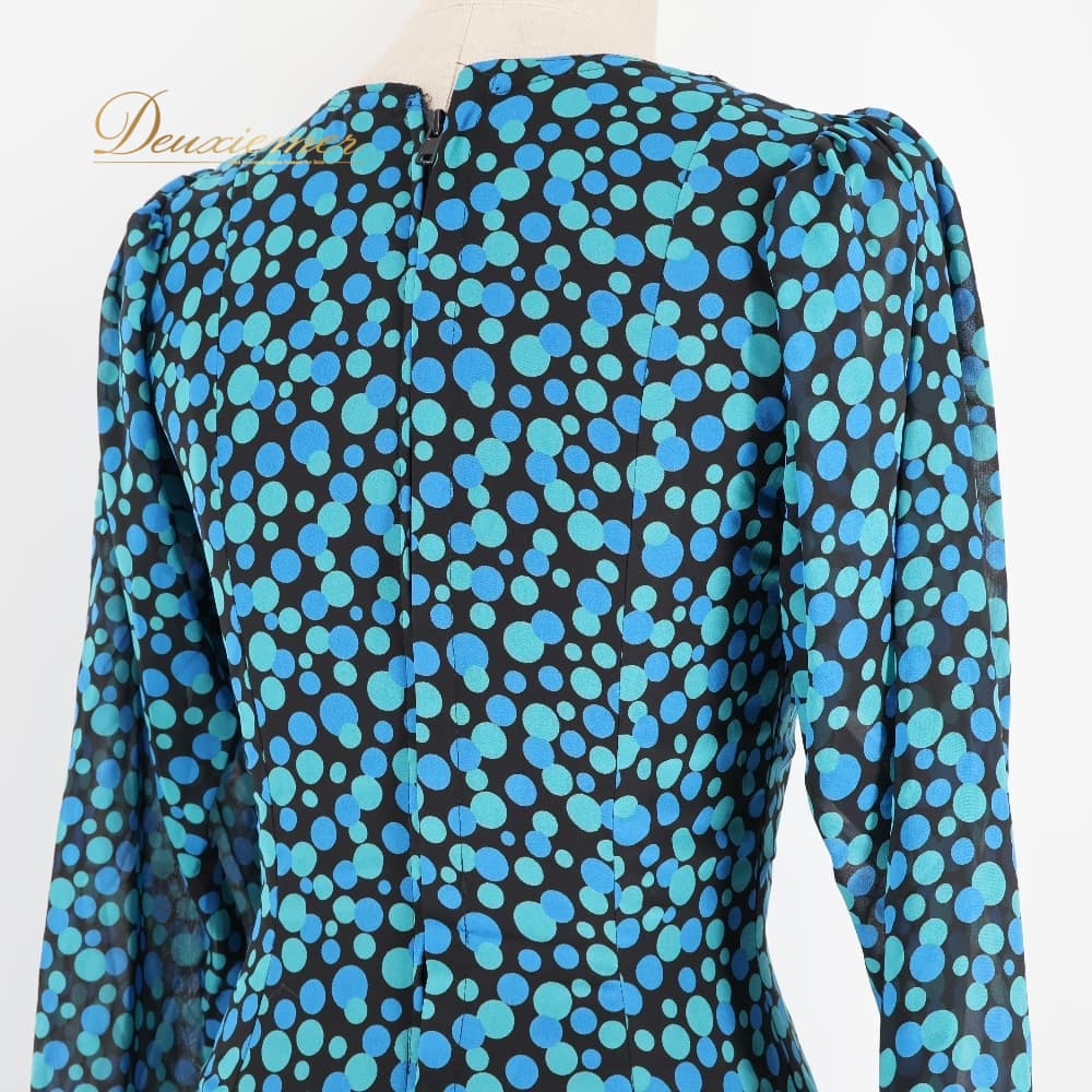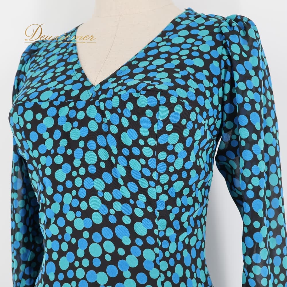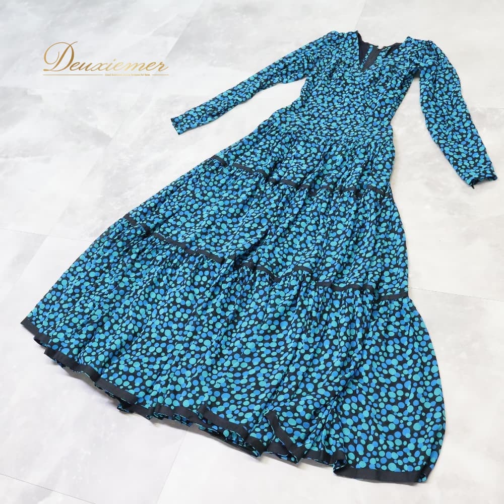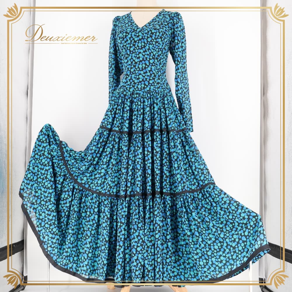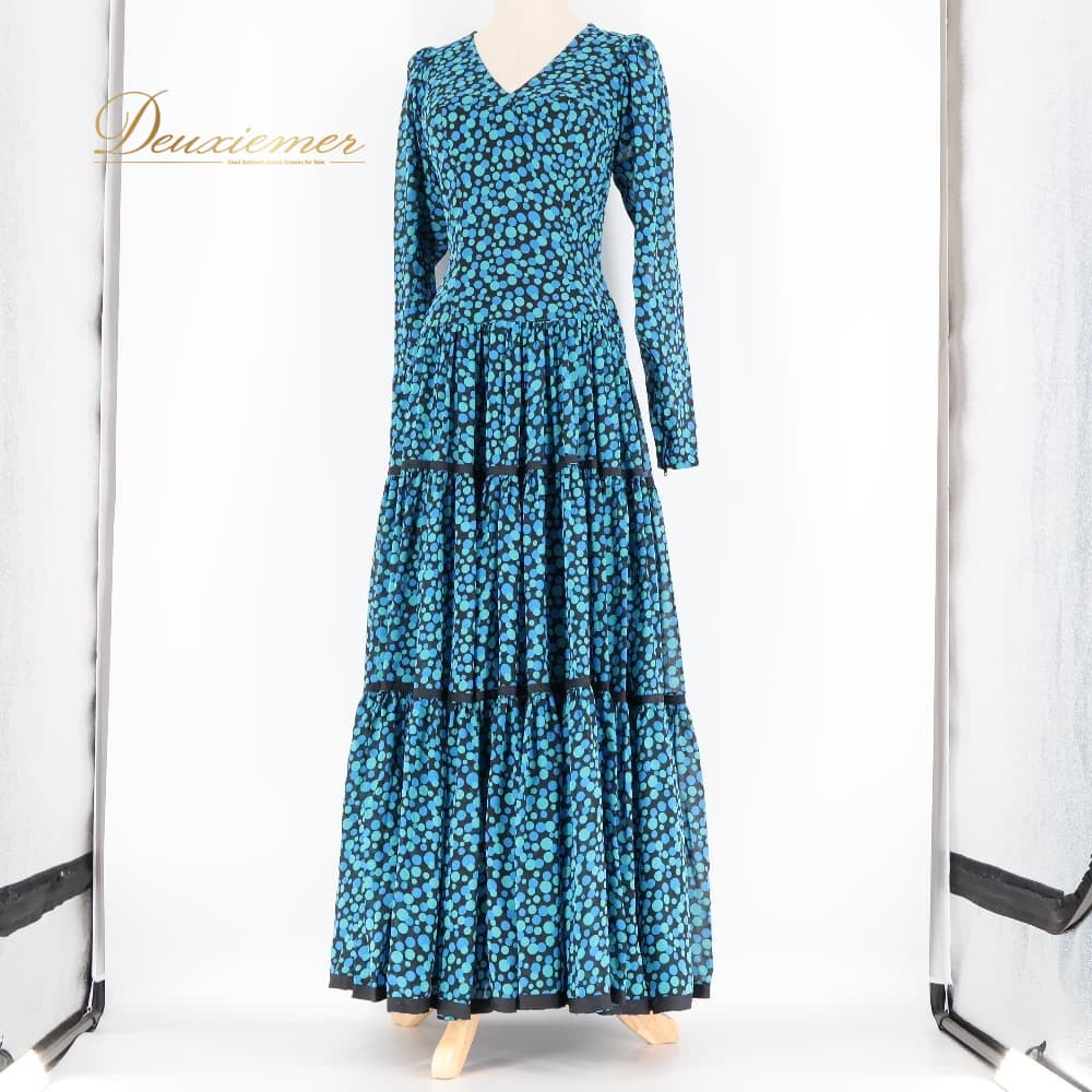 フラメンコ 衣装 ワンピース ドレス ブルー系 グリーン系 青 緑 柄 模様 長袖 ダンス パーティ レトロ 華やか フラメンコワンピース ロング丈 総柄 ステージ衣装 ダンス衣装 イベント フェミニン かわいい エレガント