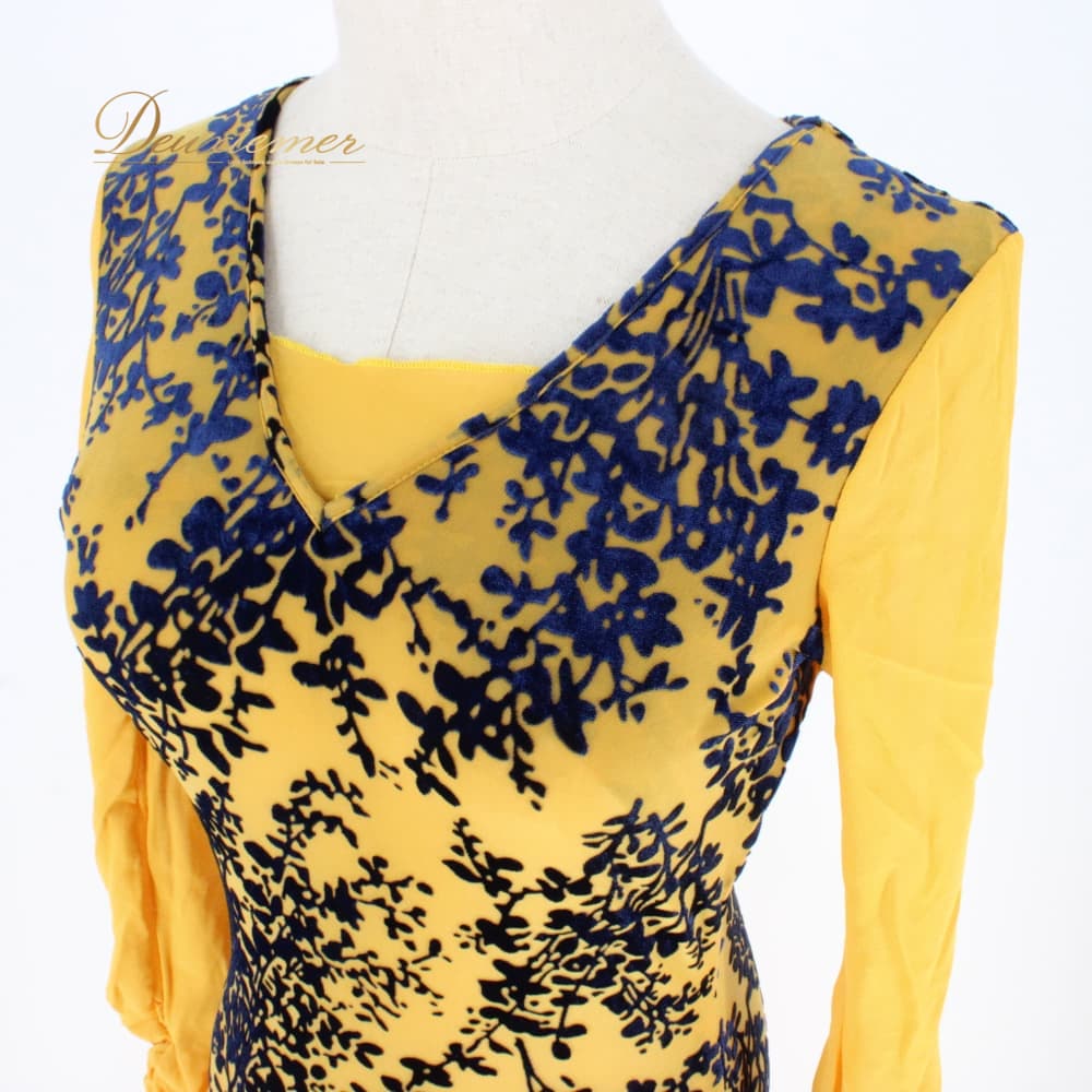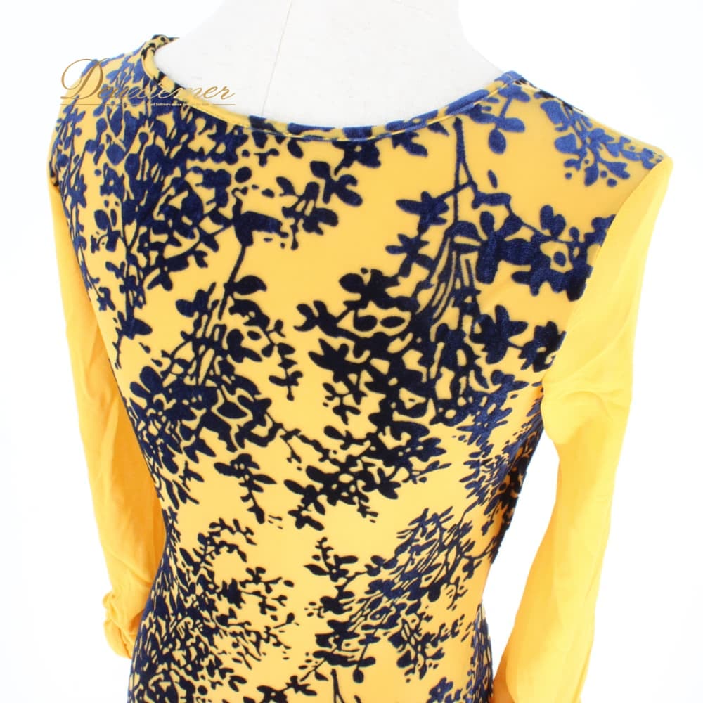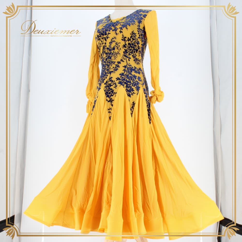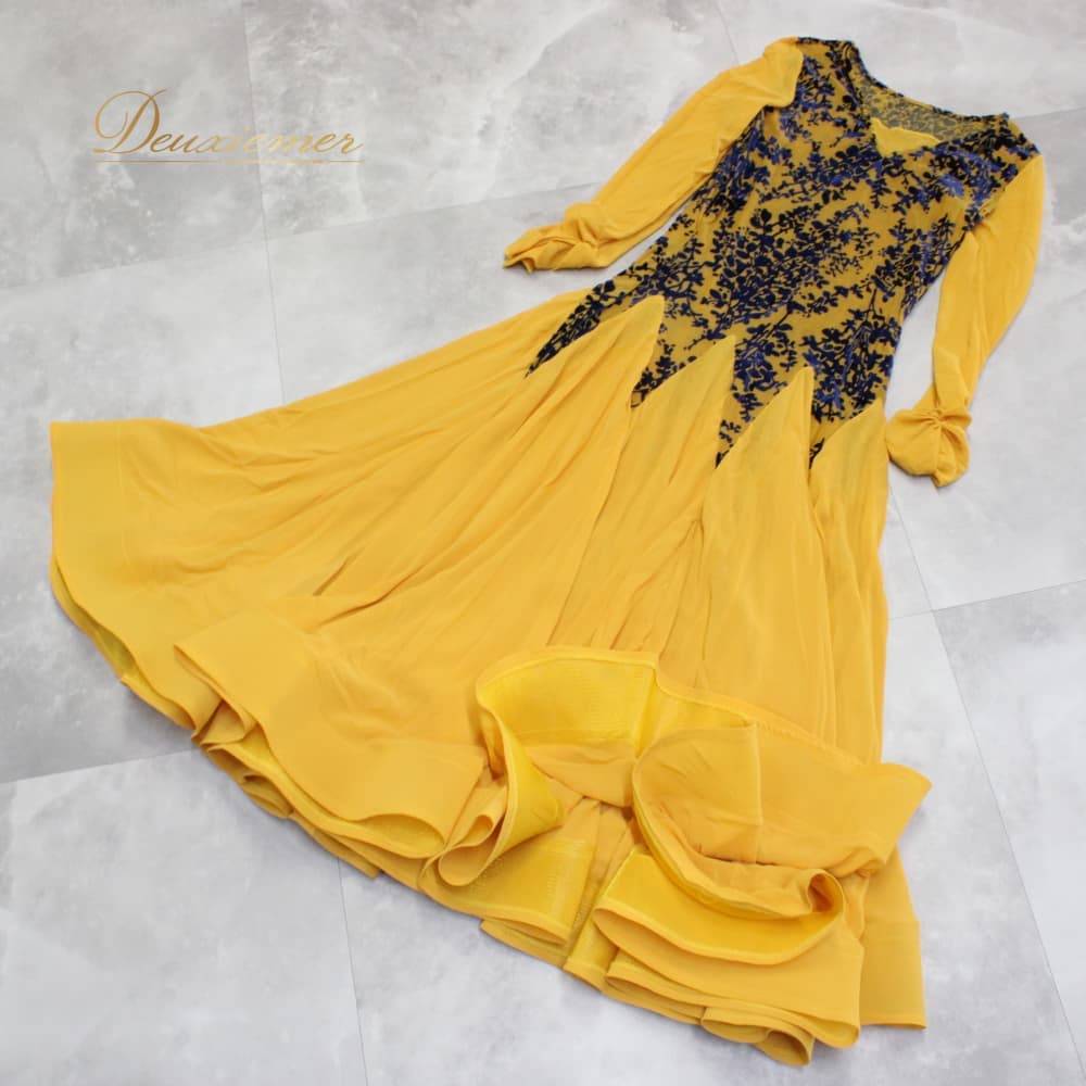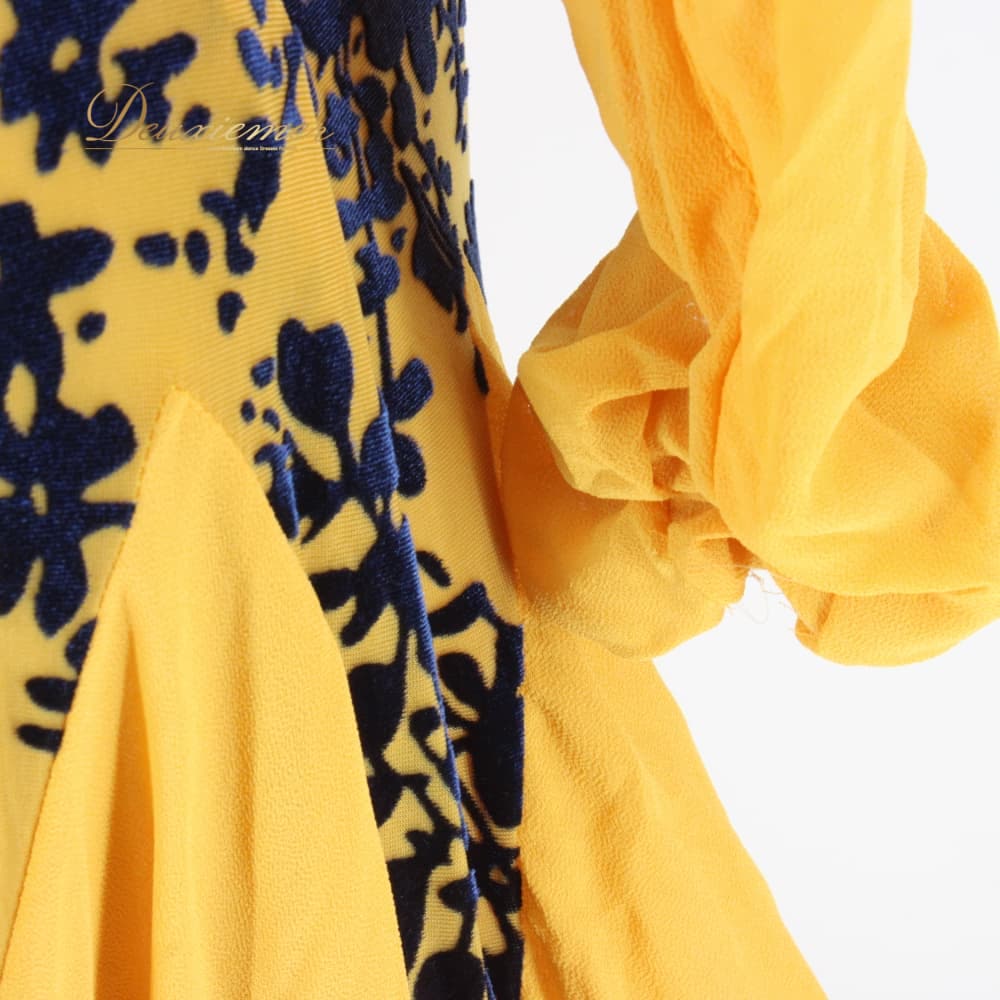 社交ダンス 衣装 スタンダード ドレス ワンピース レッスンウェア パーティドレス ブラック系 ネイビー系 イエロー系 黄色 青 紺 黒 長袖 青系 総柄 柄ワンピース フレアスカート スカート広がる ホースヘア ボリューム ダンス映え ドレスワンピース パーティー用 結婚式 二次会 舞台衣装 発表会 レッスン 初心者 中級者 練習用 レディース 襟なし クラシック モダン 対応コーデ