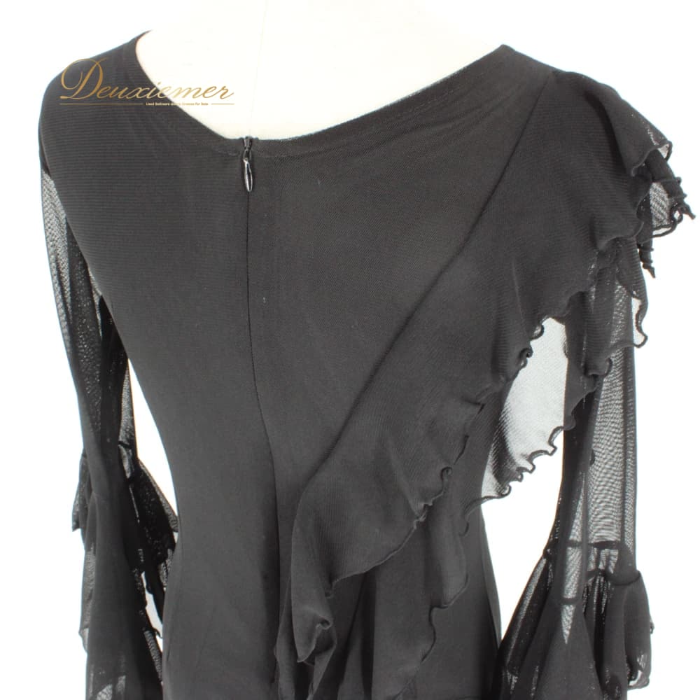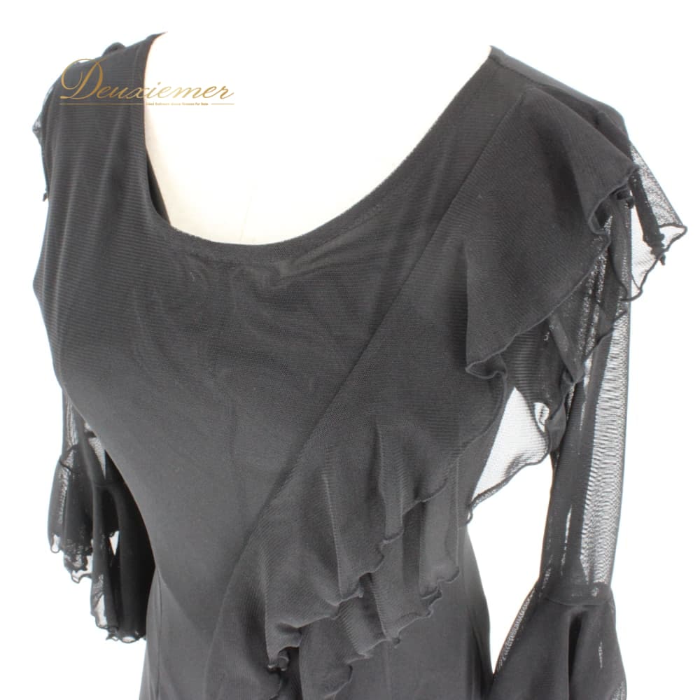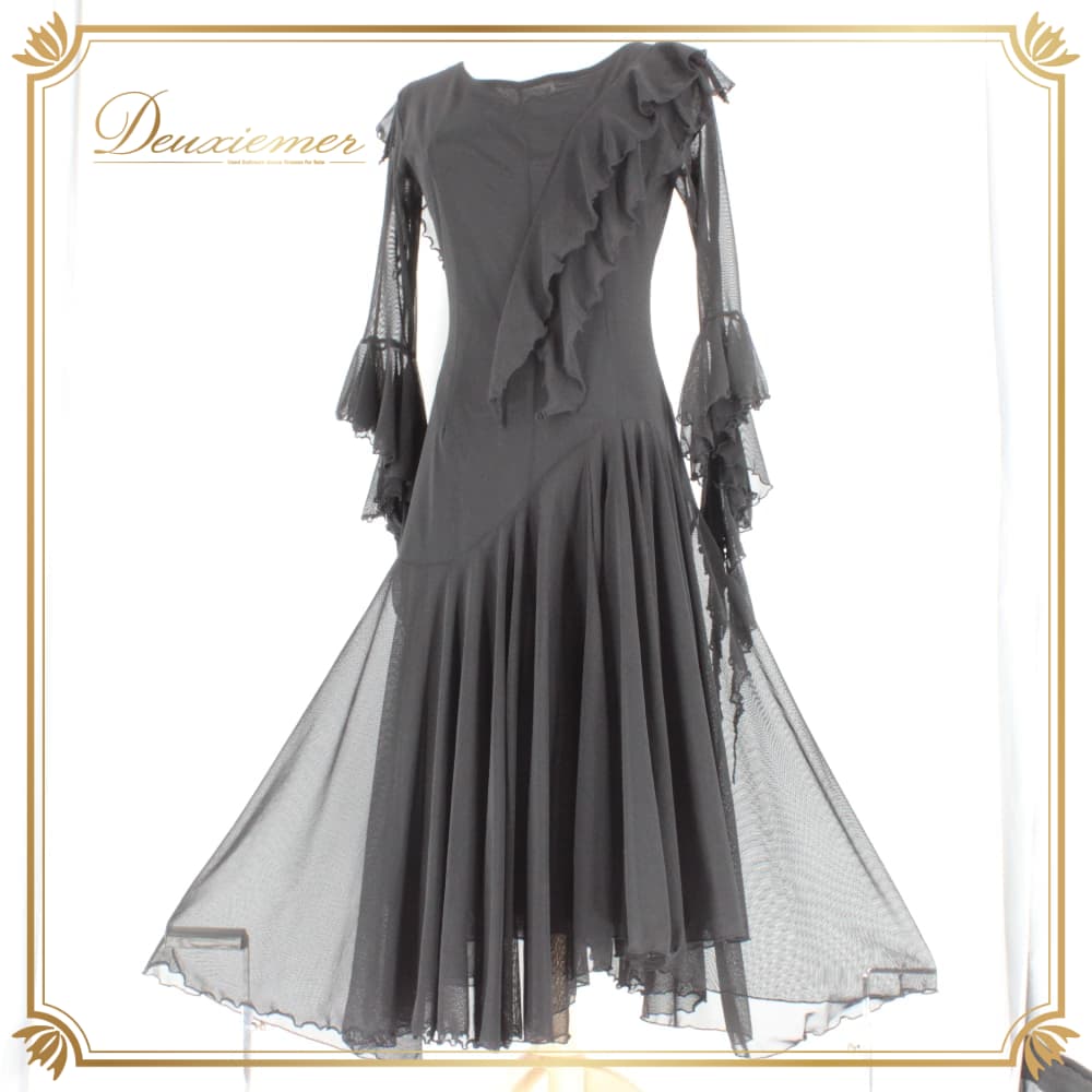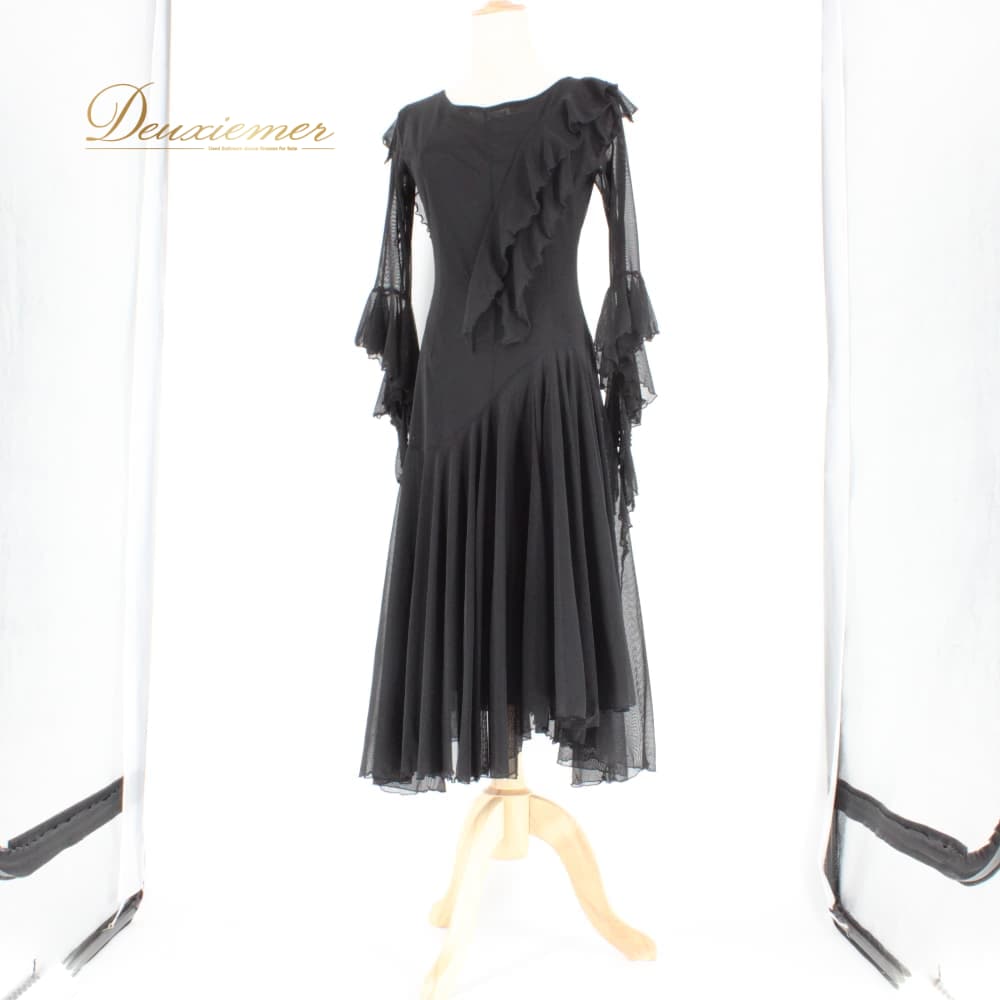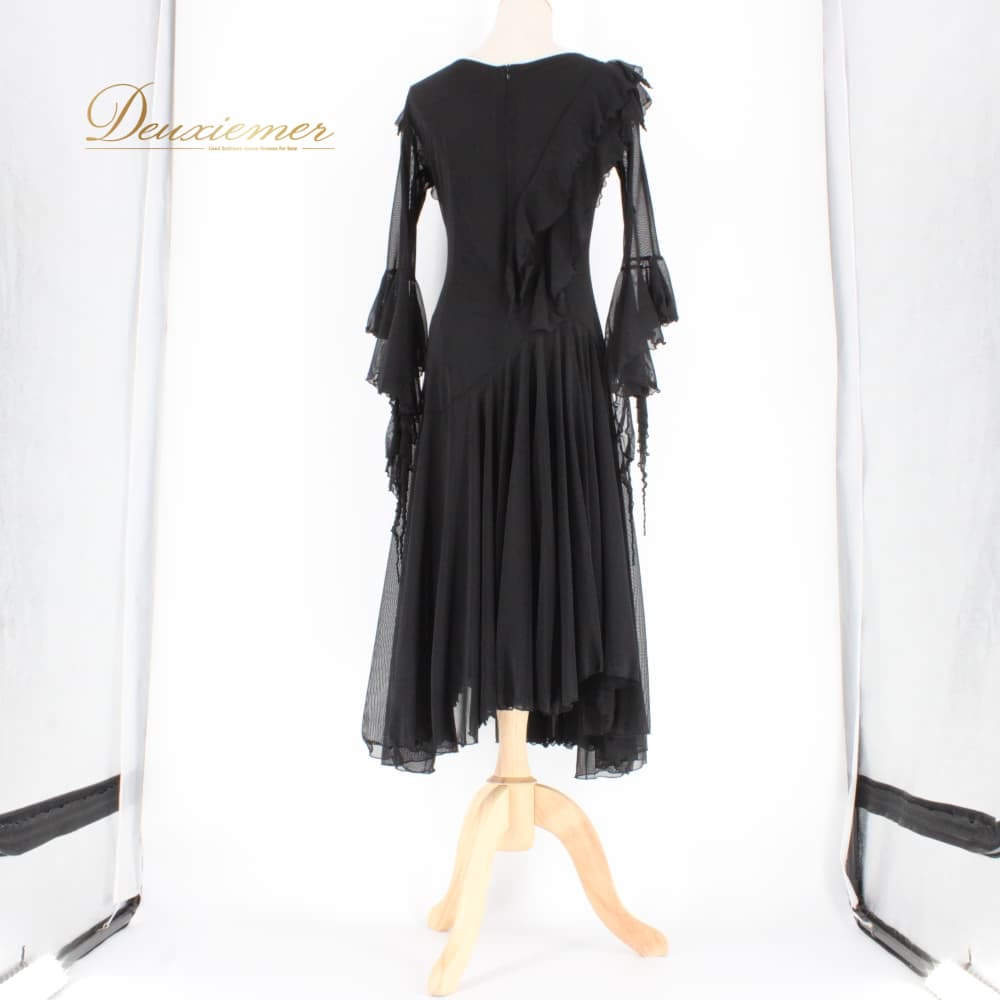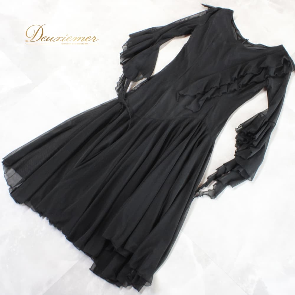 社交ダンス 衣装 スタンダード ドレス ワンピース レッスンウェア パーティドレス レディース Leirena 黒 ブラック系 無地 レース シンプル ブラックフォーマル系 モダン デザイン きれいめ シック エレガント 上品 ロングワンピース 袖あり 長袖 フレアスカート スカート丈ロング フリル ストレッチ 伸びる 体型カバー 大人かわいい ダンス用 競技用 練習用 発表会 先生用 レッスン 黒ドレス ロングドレス ウエスト切替 フロントファスナー 裾広がり レース袖 透け感 メッシュ シースルー