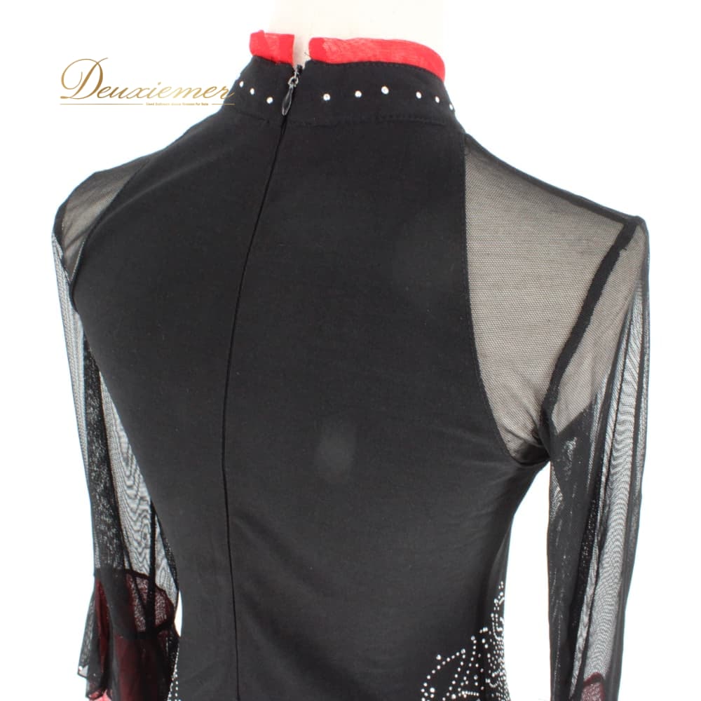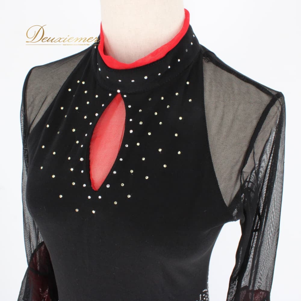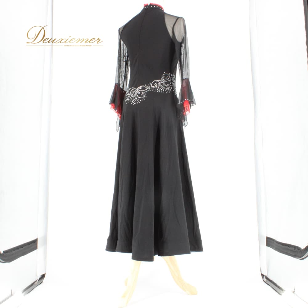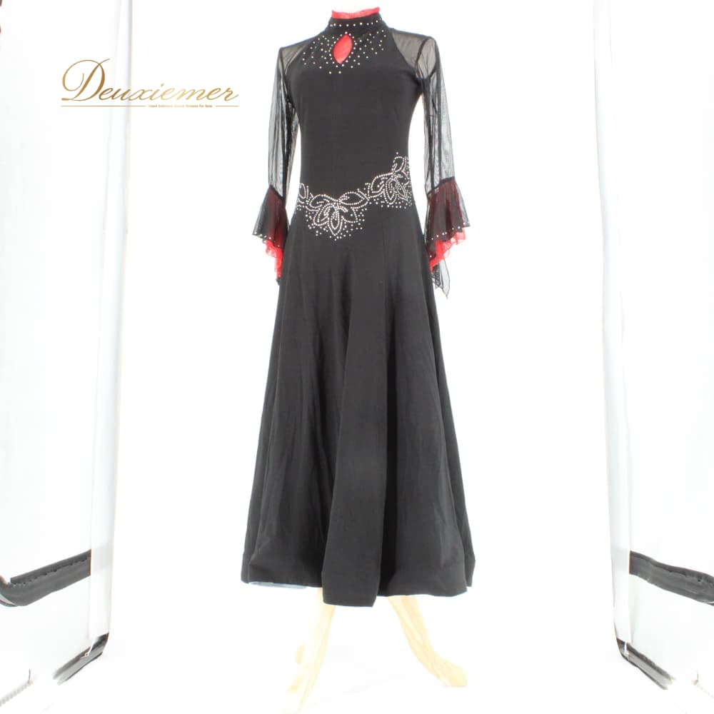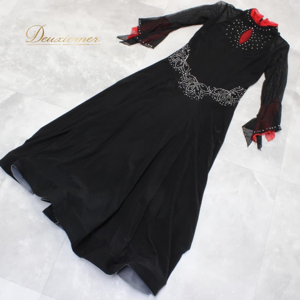 社交ダンス 衣装 スタンダード ドレス ワンピース パーティドレス ブラック系 レッド系 ラインストーン 赤 黒 長袖 レース バイカラー 上品 社交ダンスドレス スタンダード用ドレス ラテンではない モダンドレス ワンピースドレス 大人 可愛い エレガント 華やか 演奏会 舞台 衣裳 発表会 パーティー イベント ダンス衣装 黒ワンピース 赤アクセント レース袖 長袖レース 刺繍風 ストーン装飾 光る ラインストーン飾り ホースヘア ボリュームスカート フレアスカート きらきら 縦ライン