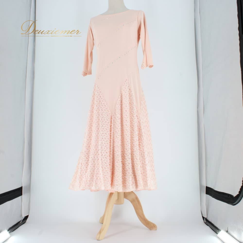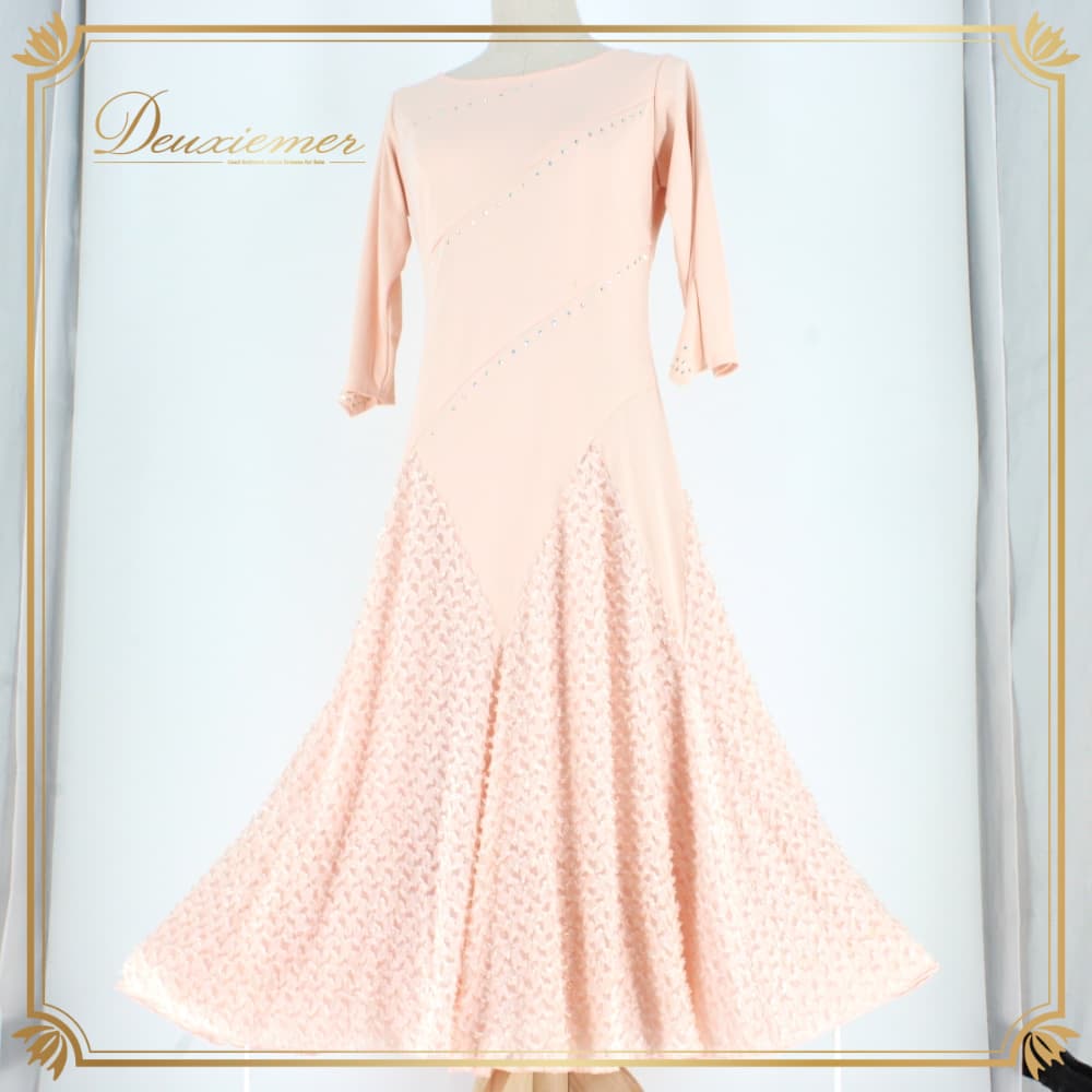 社交ダンス 衣装 スタンダード ドレス ワンピース U:NA パーティドレス レディース ピンク系 ラインストーン カラオケ ステージ衣装 薄ピンク系 ピンクベージュ系 ラインストーン装飾 ビジュー フレアスカート フレアワンピース 長袖 袖あり スタンダード用ドレス カラオケ衣装 発表会 お呼ばれドレス パーティードレス きれいめ 上品 大人可愛い エレガント 婦人用 Mサイズ 薄手素材 ポリエステルファブリック 伸縮性あり ファスナー付き 予備パッドなし